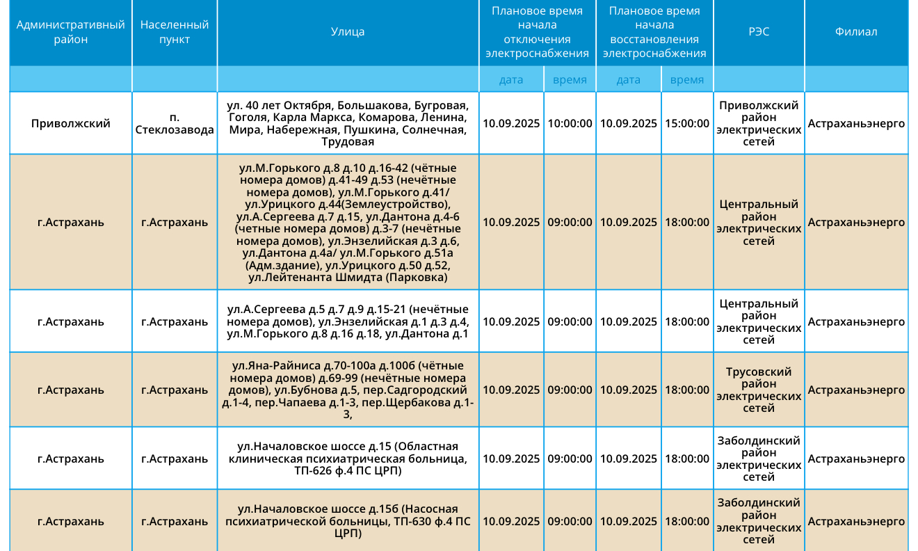 Плановые отключения электроэнергии продолжаются, об этом сообщили представители ПАО «Россети Юг». 10 сентября временно прекратится подача электричества в жилые дома и социальные объекты в Астрахани и в Приволжском районе. Полный список адресов, которые попали под плановые работы, смотрите на фото ниже: Информацию обо всех коммунальных проблемах нашего города вы можете найти здесь. На этом сайте, в режиме реального времени, вы можете наблюдать за отключениями света, воды и т.д. А если отключения произошли внепланово, звоните по телефонам: