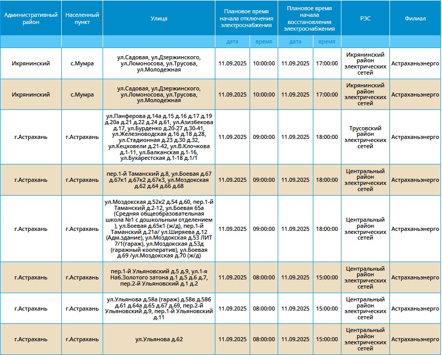 Завтра, 11 сентября, в Астрахани вновь пройдут плановые отключения электроэнергии. Об этом сообщает ПАО «Россети Юг». Так, света не будет на некоторых улицах Астрахани, а так же Икрянинского района. Без электричества останутся жилые дома и административные здания. А информацию обо всех коммунальных проблемах нашего города вы можете найти здесь. На этом сайте, в режиме реального времени, вы можете наблюдать за отключениями света, воды и т.д. Если отключения произошли внепланово, звоните по телефонам, которые указаны ниже: