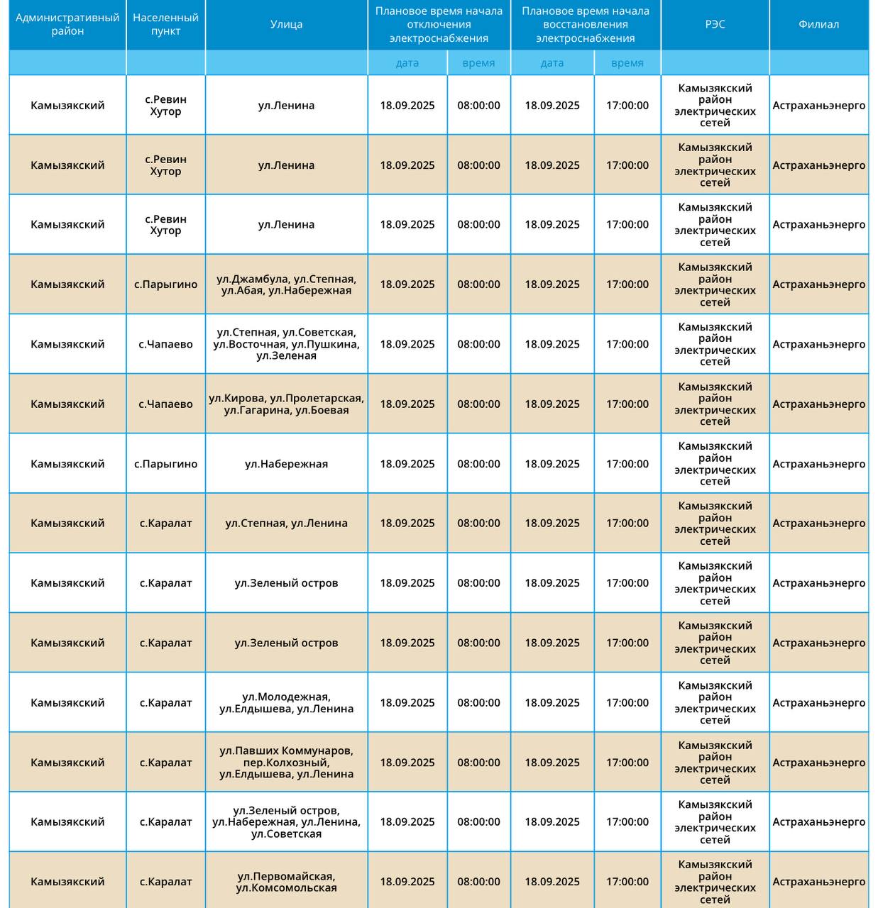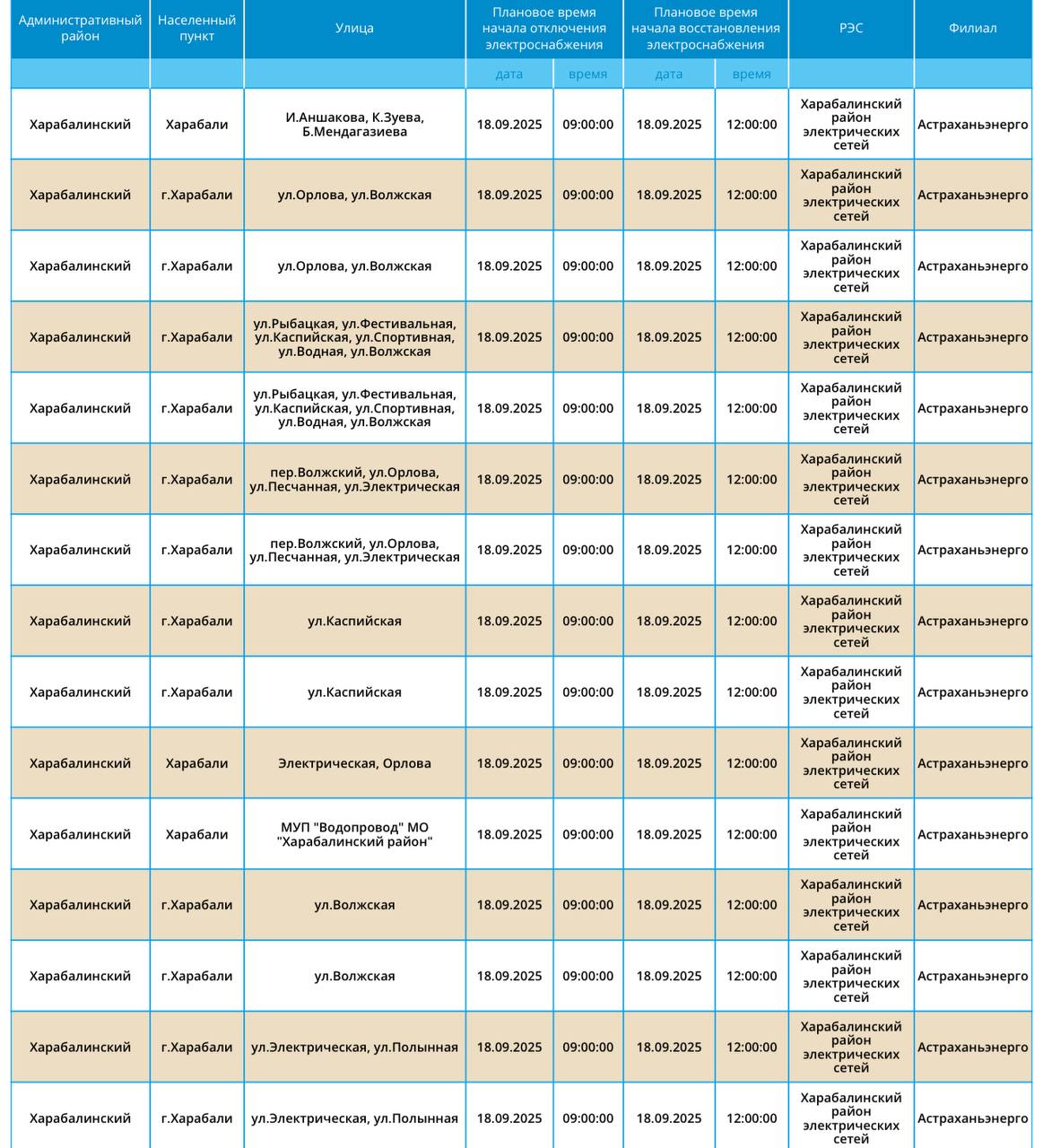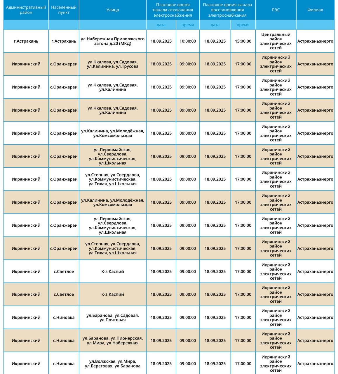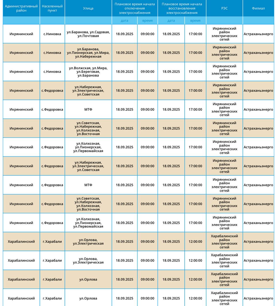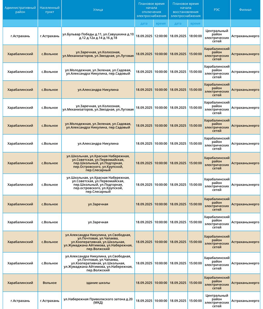 Завтра, 18 сентября, в Астраханской области пройдут очередные массовые отключения света, об этом сообщают сотрудники ПАО «Россети Юг». Так без электричества останутся как сами горожане, так и жители Харабалинского, Икрянинского и Камызякского районов. Свет отключат в жилых домах и в нескольких административных зданиях. Подробнее со списком отключений можно ознакомиться в галерее ниже: Следить за отключениями в сфере ЖКХ можно на этом сайте. Там содержится актуальная информация о дорогах, проблемах с мусором, бродячих собаках и перебоях с водой. А если произошли незапланированные отключения электроэнергии, то обращайтесь по нижеуказанным телефонам:
