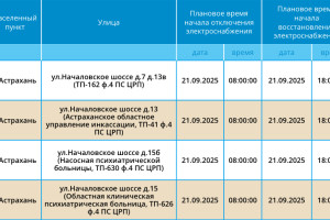 В воскресенье, 21 сентября, в регионе пройдут плановые отключения электроэнергии. Об этом сообщили в пресс-службе ПАО «Россети Юг». Света не будет в Астрахани с 08:00 до 18:00. Без электричества останутся жилые дома, управление инкассации, насосная станция и больница. Подробности на изображении ниже: Всю необходимую информацию о коммунальных проблемах в Астрахани вы найдете на этой карте. Здесь оперативно обновляются данные о перебоях с электричеством, водоснабжением и прочими бытовыми неудобствами. При возникновении непредвиденных отключений обращайтесь по следующим номерам телефонов: