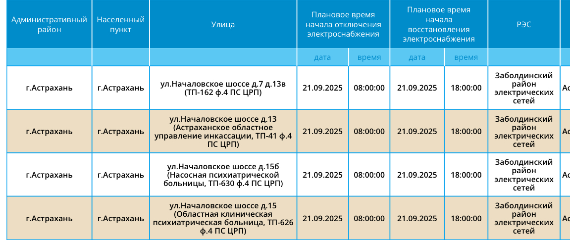В воскресенье, 21 сентября, в регионе пройдут плановые отключения электроэнергии. Об этом сообщили в пресс-службе ПАО «Россети Юг». Света не будет в Астрахани с 08:00 до 18:00. Без электричества останутся жилые дома, управление инкассации, насосная станция и больница. Подробности на изображении ниже: Всю необходимую информацию о коммунальных проблемах в Астрахани вы найдете на этой карте. Здесь оперативно обновляются данные о перебоях с электричеством, водоснабжением и прочими бытовыми неудобствами. При возникновении непредвиденных отключений обращайтесь по следующим номерам телефонов: