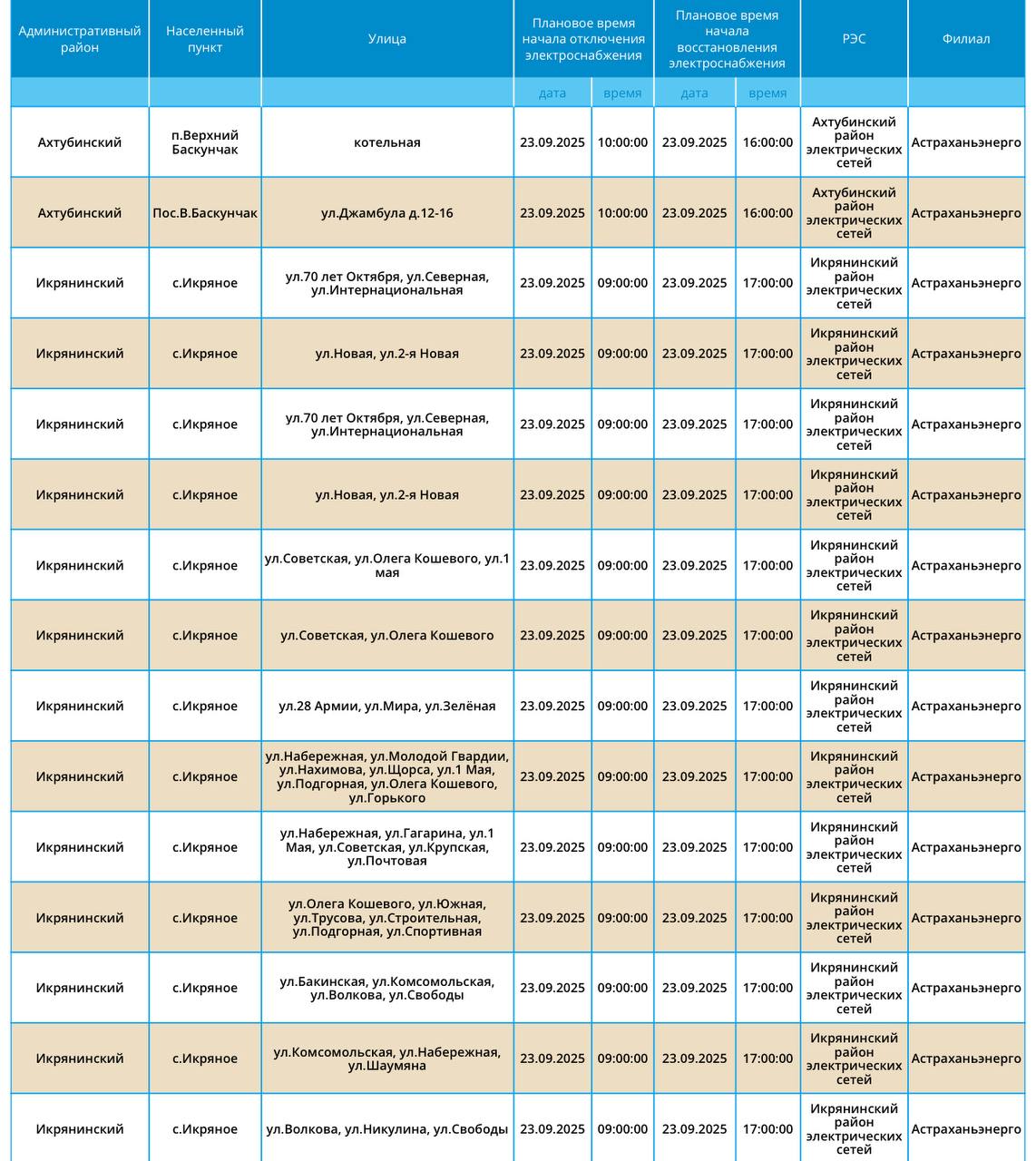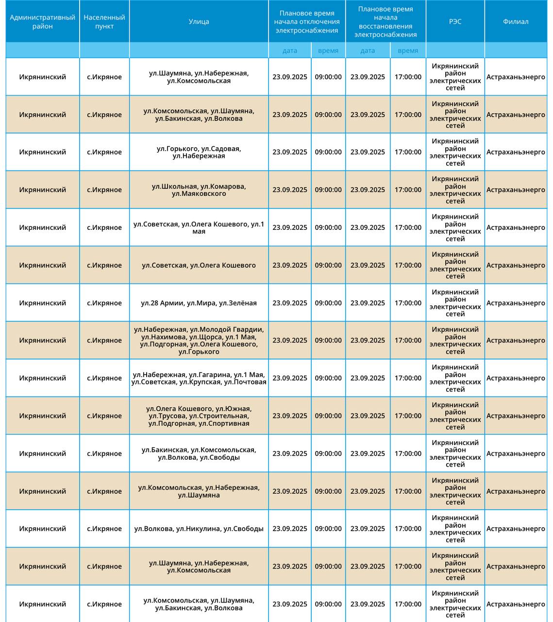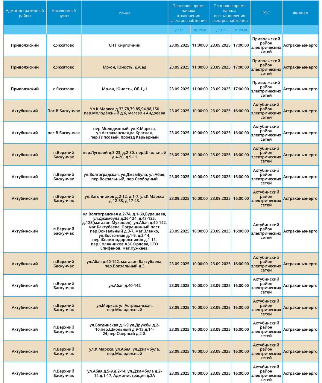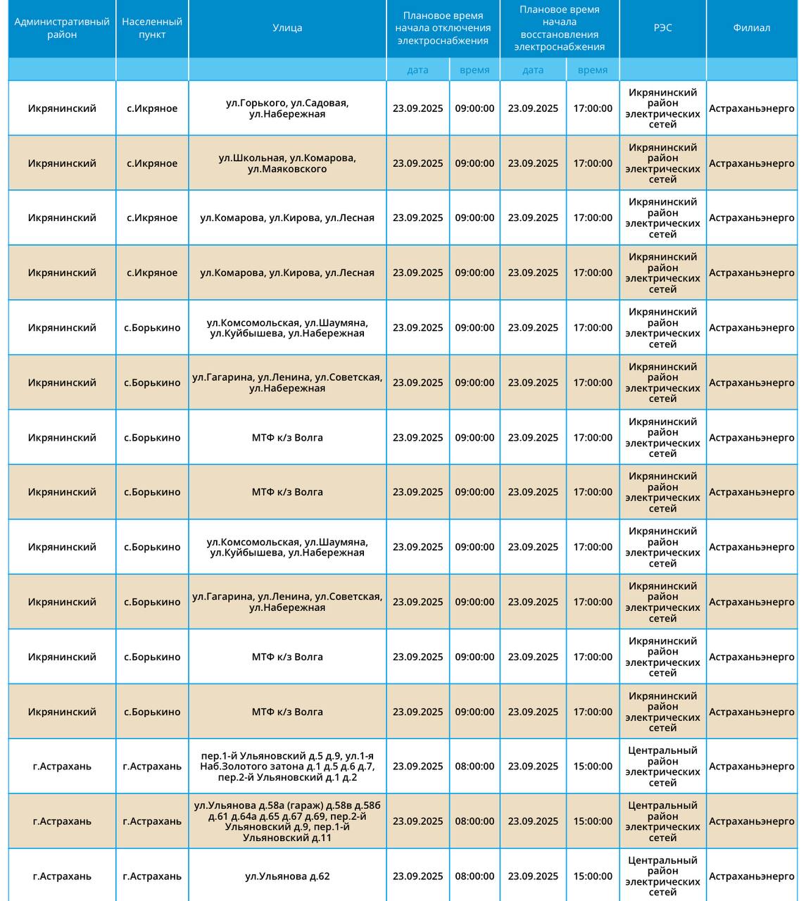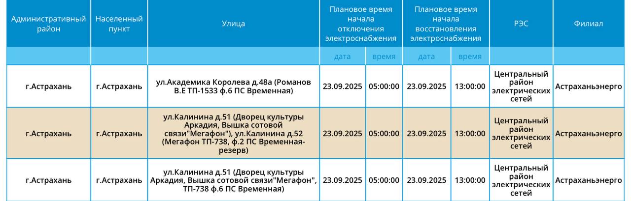 Завтра, 23 сентября, пройдут плановые работы по обслуживанию электросетей, вследствие чего многие абоненты временно лишатся энергоснабжения. Отключения коснутся как самих жителей областного центра, так и Приволжского, Ахтубинского и Икрянинского районов. Без света останутся детский сад, котельная и Дворец культуры «Аркадия». Подробный список адресов можно узнать в галерее ниже: Напоминаем, что следить за актуальной информацией о проблемах коммунальной сферы в городе Астрахань можно на удобной интерактивной карте. Здесь вы всегда сможете узнать свежую информацию о текущих профилактических мероприятиях, таких как временное прекращение подачи электроэнергии, воды и прочих коммунальных услуг. Если же непредвиденное отключение произошло неожиданно, незамедлительно обращайтесь по указанным контактным номерам телефонов: