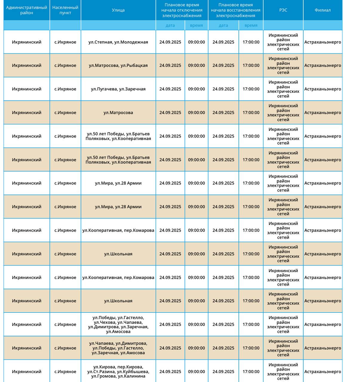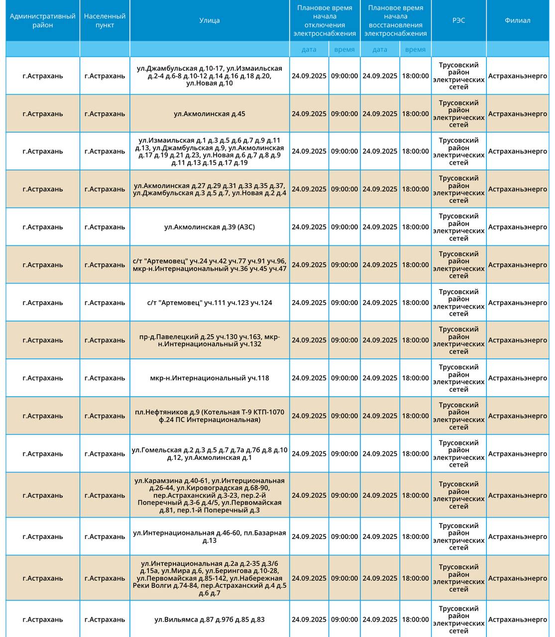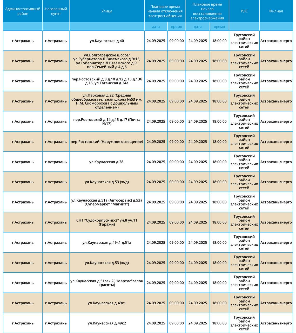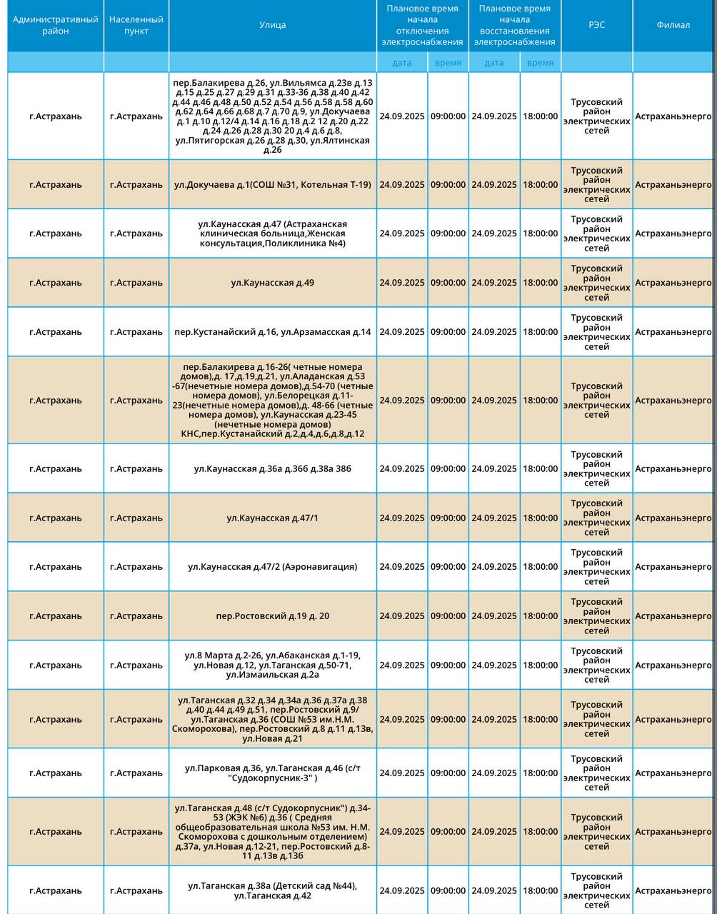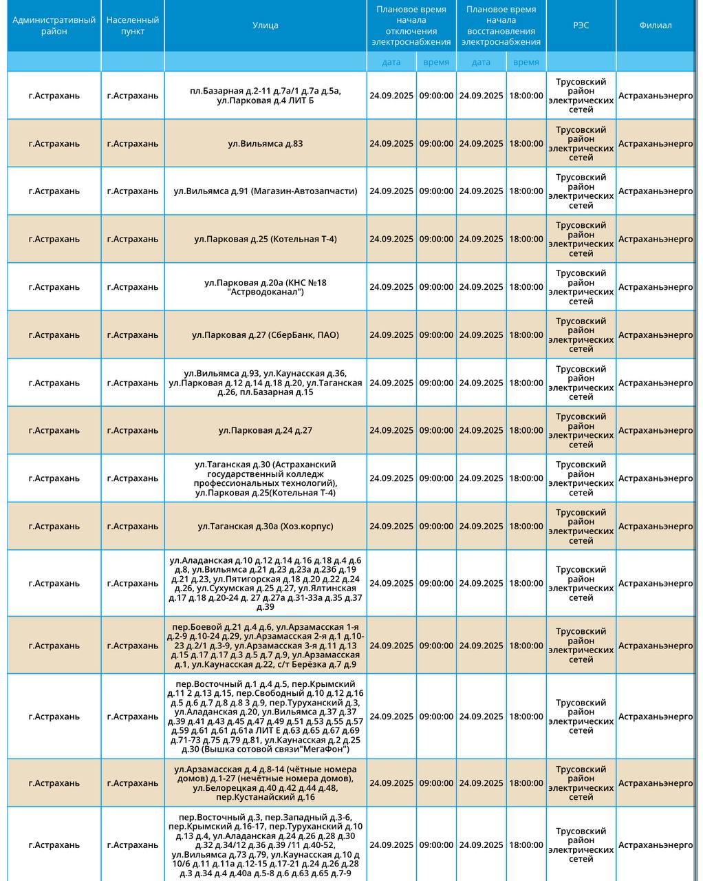 24 сентября в Астраханской области пройдут массовые отключения электричества