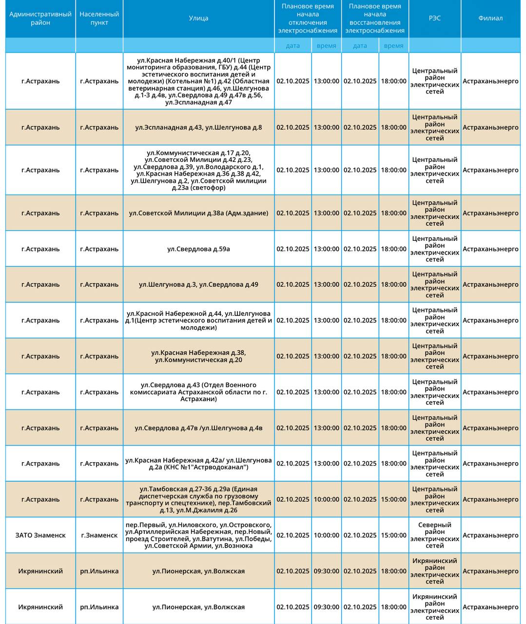 Завтра, 2 октября, в Астраханской области пройдут очередные плановые отключения электричества. На этот раз без света останутся жители областного центра, а также Икрянинского, Харабалинского районов и ЗАТО Знаменск. С подробным списком адресов можно ознакомиться в галерее ниже: Все коммунальные проблемы нашего города отображаются на этой интерактивной карте. Вы можете следить за ситуацией с отключением электроэнергии, водоснабжения и других услуг в режиме онлайн. В случае возникновения непредвиденных ситуаций обращайтесь по представленным контактным номерам телефонов: