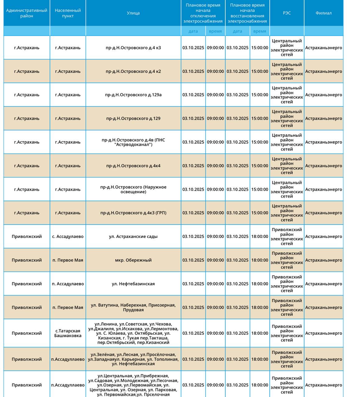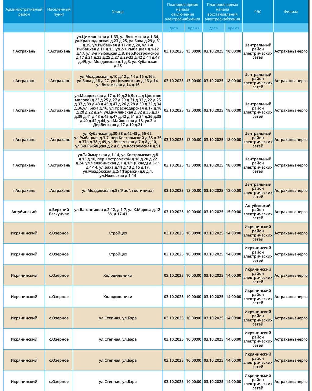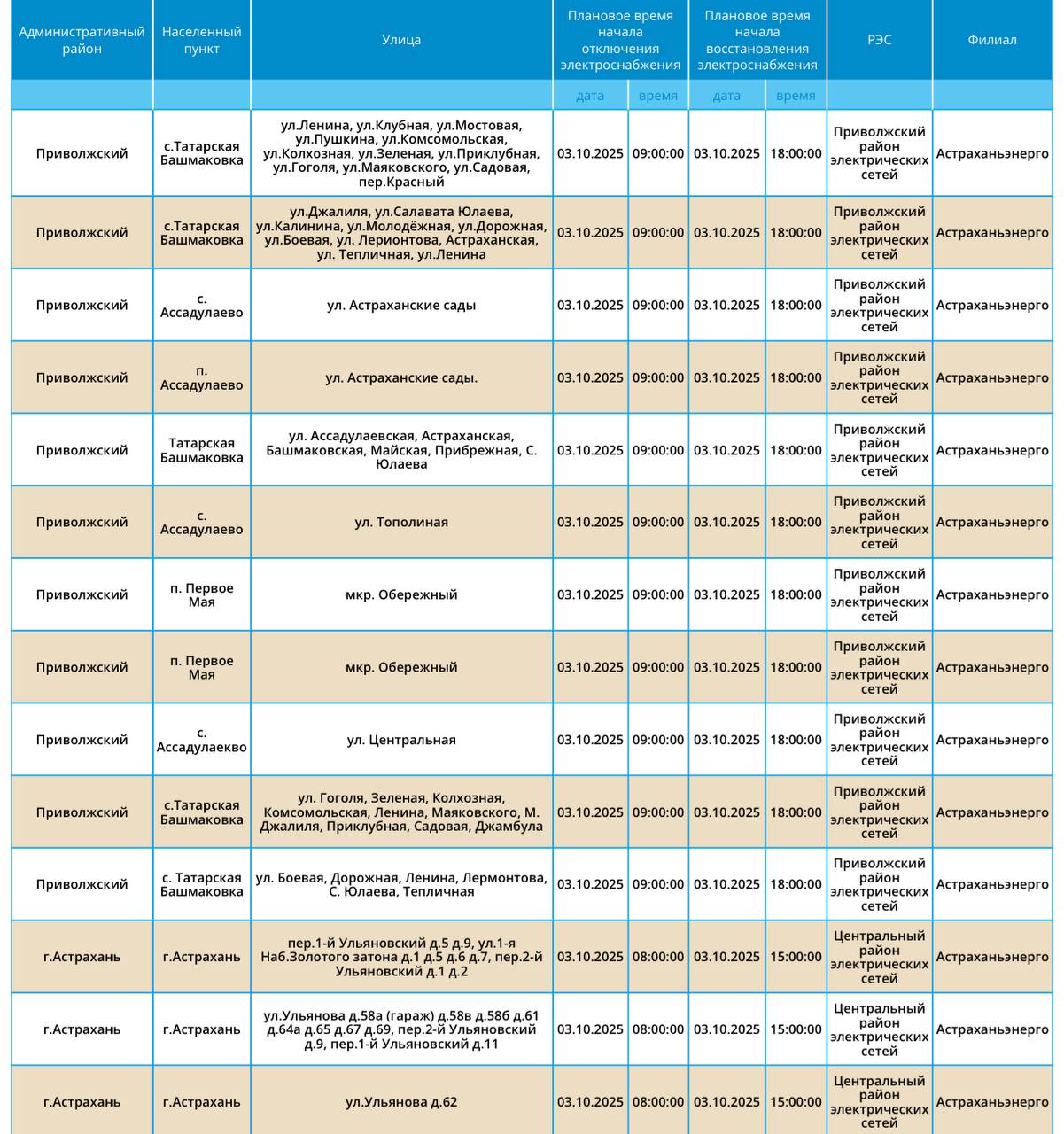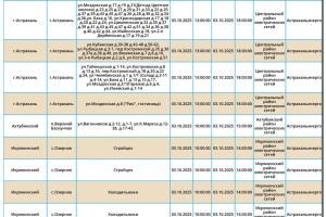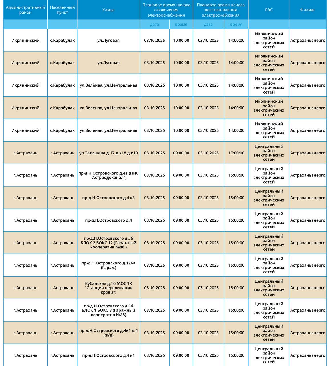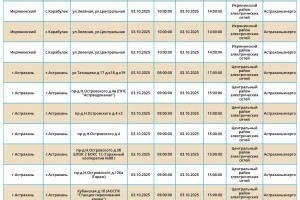 Завтра, 3 октября, в Астраханской области вновь пройдут отключения электроэнергии по многим адресам. На этот раз без света останутся не только жители Астрахани, но и проживающие в Икрянинском и Приволжском районах. Без электричества останутся несколько гаражных кооперативов, гостиница и жилые дома. Подробнее со списком адресов можно ознакомиться в галерее ниже: А узнавать обо всех коммунальных проблемах нашего города вы можете на удобной интерактивной карте. Здесь, в режиме реального времени, вы можете наблюдать за отключениями света, воды и т.д. Если отключения произошли внепланово, звоните по телефонам, которые указаны ниже: