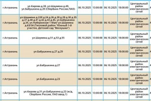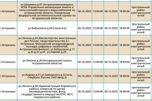 Энергетики сообщили о плановых отключениях электроэнергии, которые произойдут 6 октября в областном центре. На несколько часов без электричества останутся некоторые жилые дома и административные здания в Астрахани, а также в Приволжском, Черноярском и Ахтубинском районах области. Увидеть полный список адресов, попадающих под отключения 6 октября, можно здесь. Если отключения произошли внепланово, звоните по телефонам, которые указаны ниже: