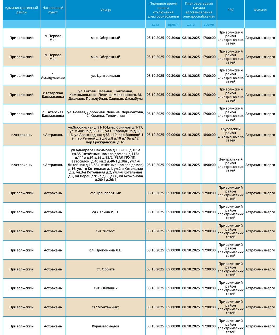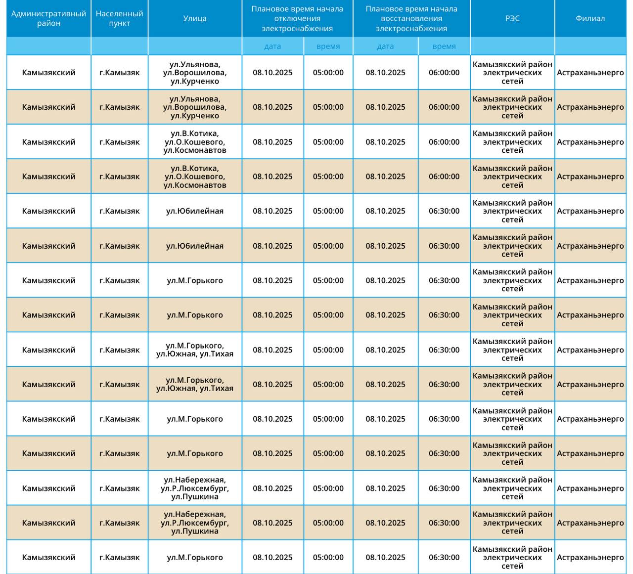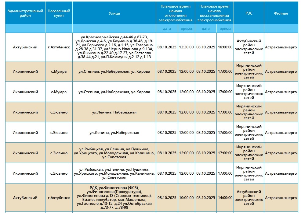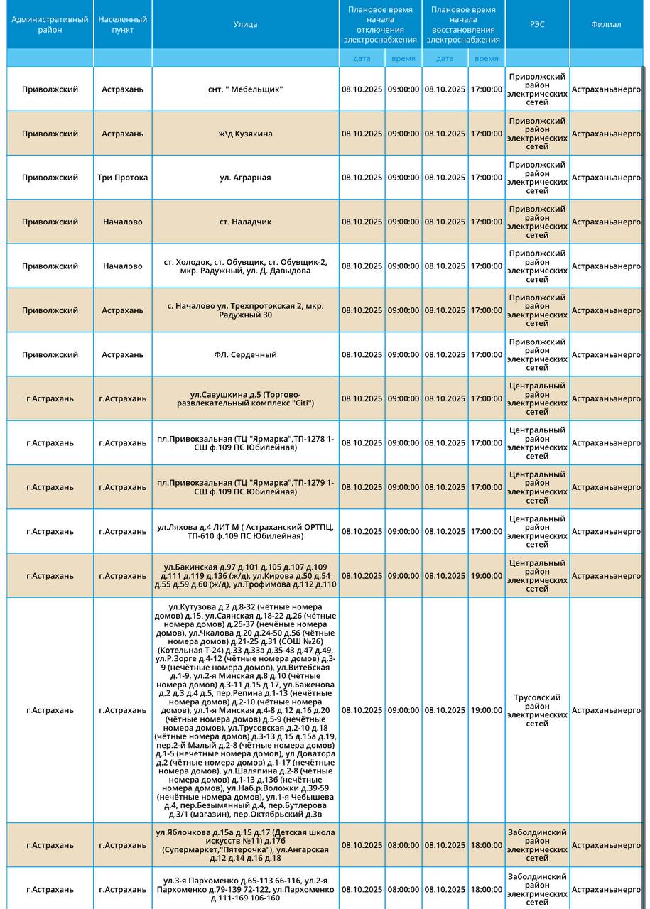 Завтра, 8 октября, многие улицы города Астрахани и области останутся без электроэнергии. Причиной тому - очередные плановые работы на электросетях. Без электричества останутся как городские жители, так и проживающие в Ахтубинском, Приволжском, Икрянинском и Камызякском районах. Полный список адресов, где пройдут отключения света, предоставили сотрудники ПАО «Россети Юг»: Все коммунальные проблемы нашего города собраны этой удобной интерактивной карте. На данном ресурсе доступна самая свежая информация об отключениях электроэнергии, водоснабжения и прочих коммунальных услуг. В случае неожиданных сбоев обращайтесь по указанным контактным номерам телефонов: