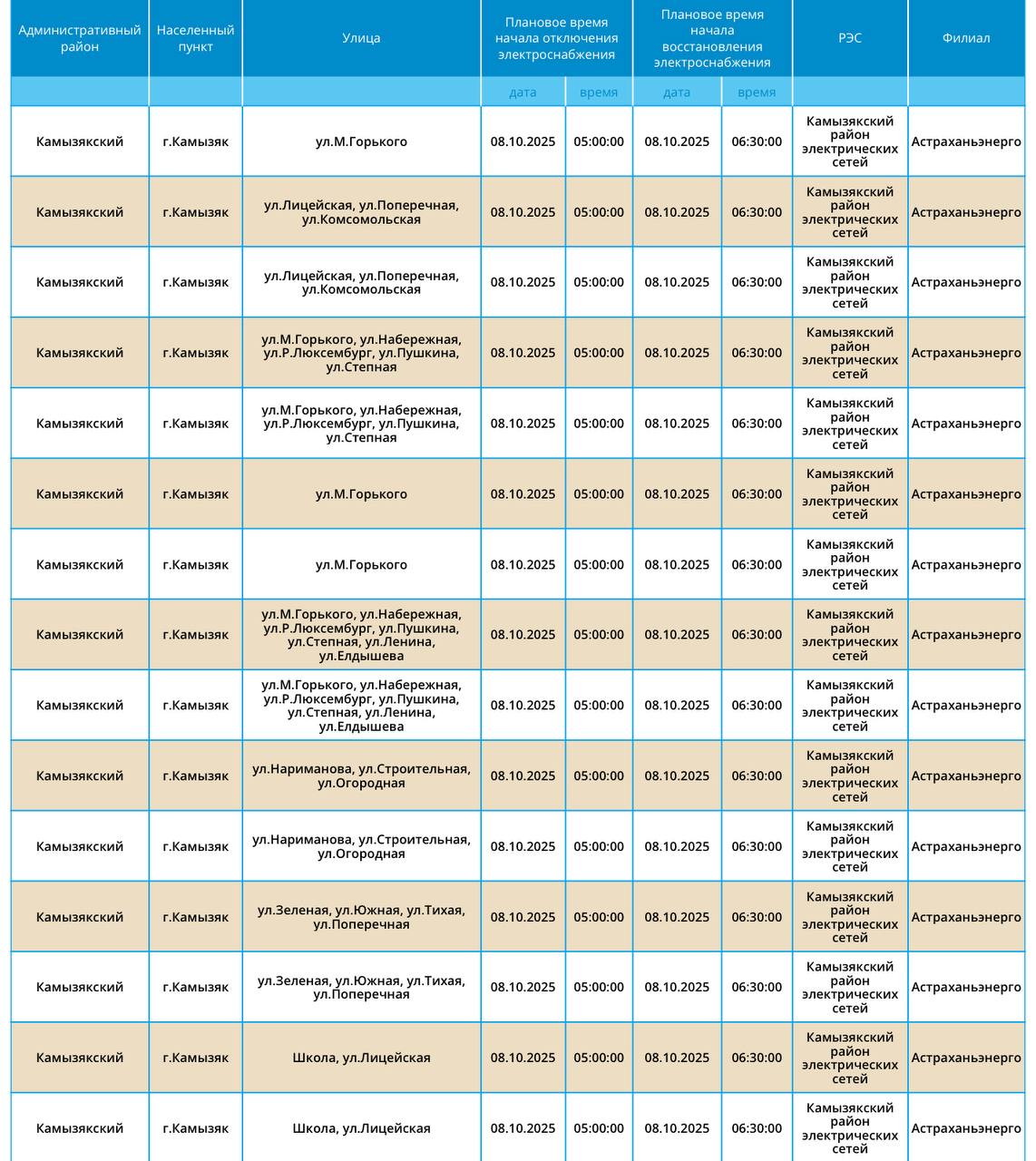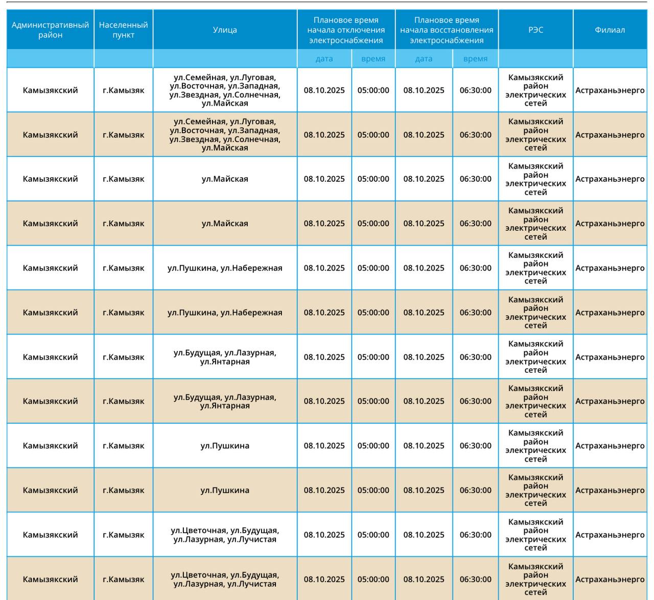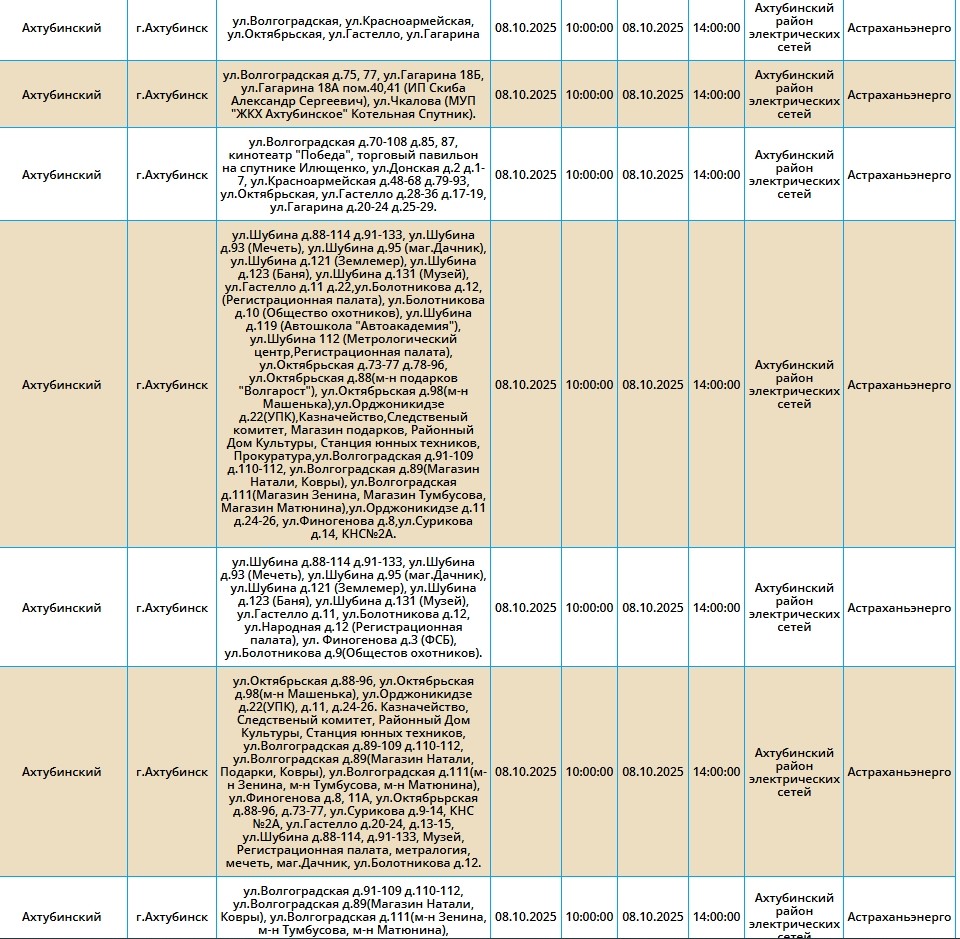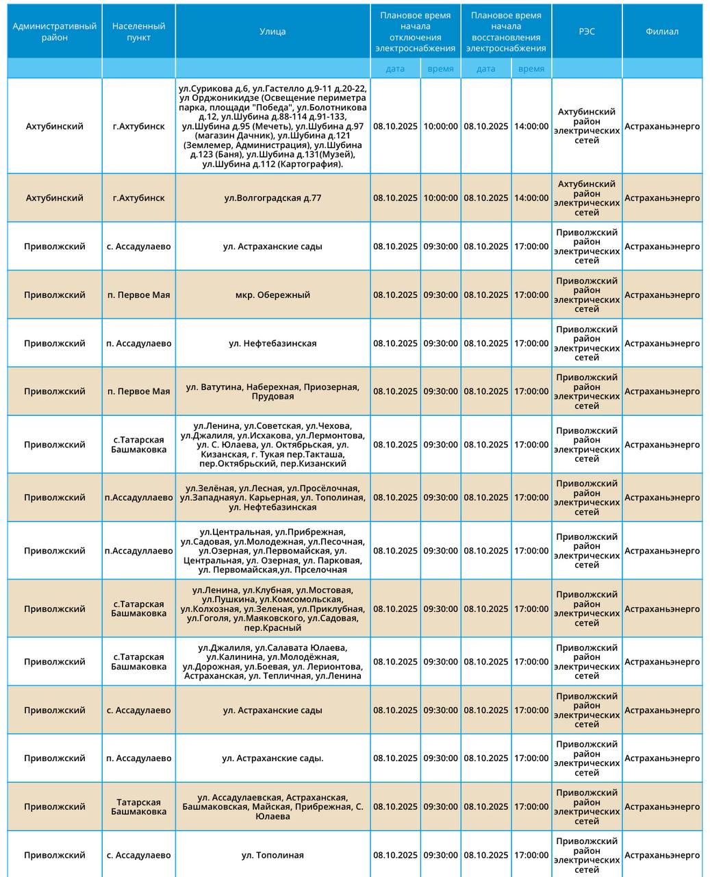 Завтра, 8 октября, многие улицы города Астрахани и области останутся без электроэнергии. Причиной тому - очередные плановые работы на электросетях. Без электричества останутся как городские жители, так и проживающие в Ахтубинском, Приволжском, Икрянинском и Камызякском районах. Полный список адресов, где пройдут отключения света, предоставили сотрудники ПАО «Россети Юг»: Все коммунальные проблемы нашего города собраны этой удобной интерактивной карте. На данном ресурсе доступна самая свежая информация об отключениях электроэнергии, водоснабжения и прочих коммунальных услуг. В случае неожиданных сбоев обращайтесь по указанным контактным номерам телефонов: