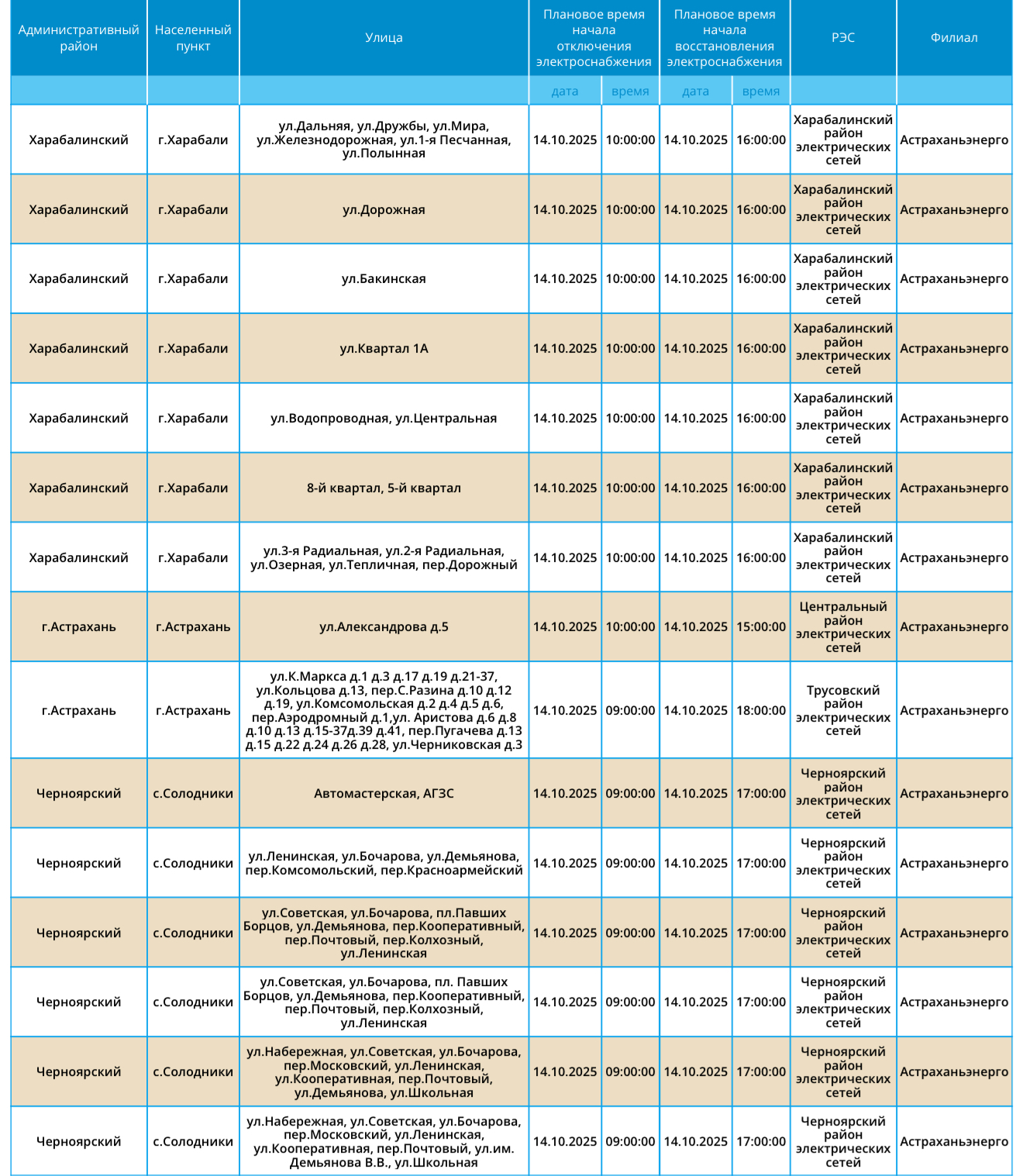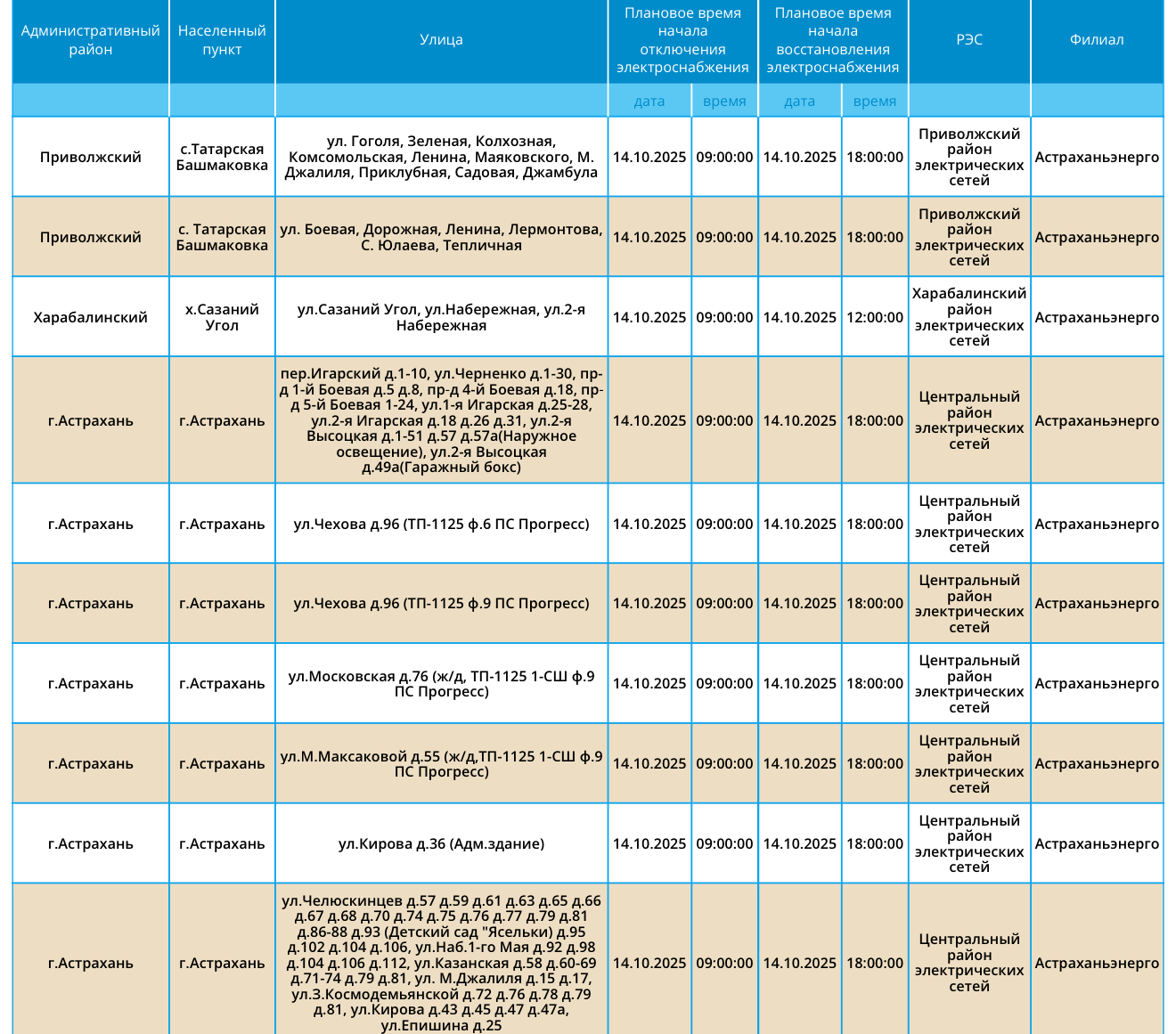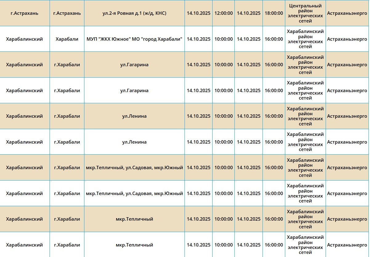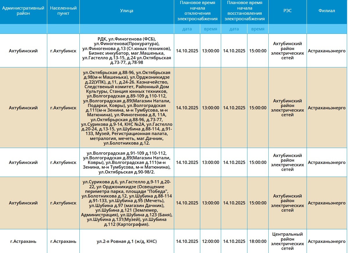 Завтра, 14 октября, пройдут плановые работы по обслуживанию электросетей, вследствие чего многие абоненты временно лишатся энергоснабжения. Отключения коснутся как самих жителей областного центра, так и Приволжского, Ахтубинского, Харабалинского и Черноярского районов. Без света останутся детские сады, школа искусств и АЗС. Подробный список адресов можно узнать в галерее ниже: Напоминаем, что следить за актуальной информацией о проблемах коммунальной сферы в городе Астрахань можно на удобной интерактивной карте. Здесь вы всегда сможете узнать свежую информацию о текущих профилактических мероприятиях, таких как временное прекращение подачи электроэнергии, воды и прочих коммунальных услуг. Если же непредвиденное отключение произошло неожиданно, незамедлительно обращайтесь по указанным контактным номерам телефонов: