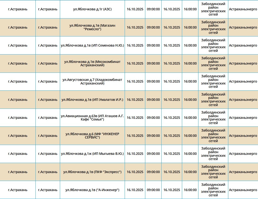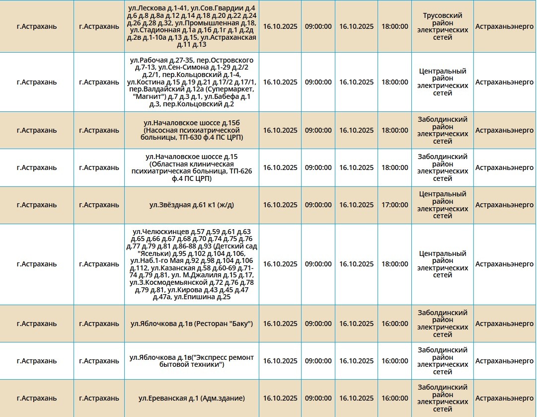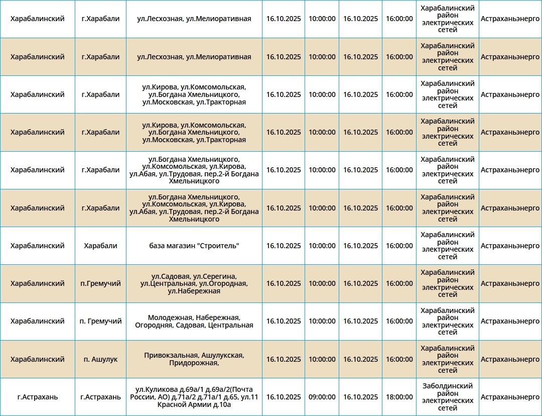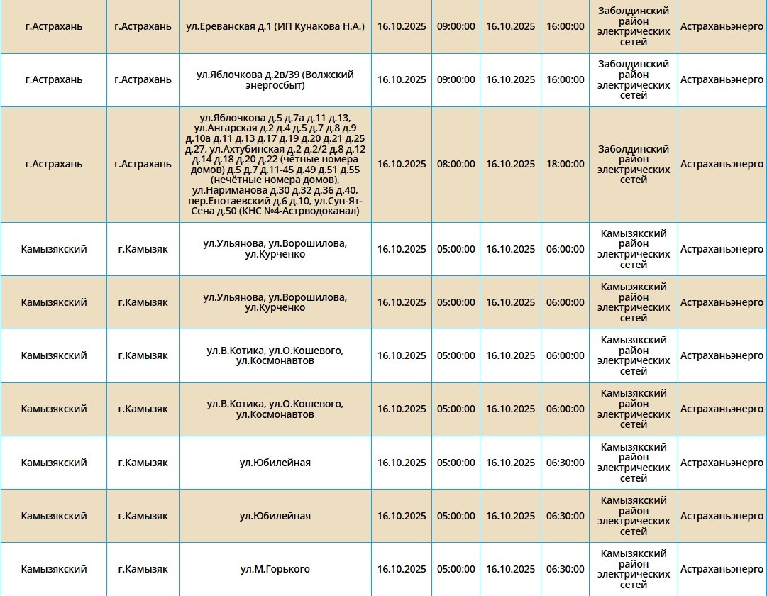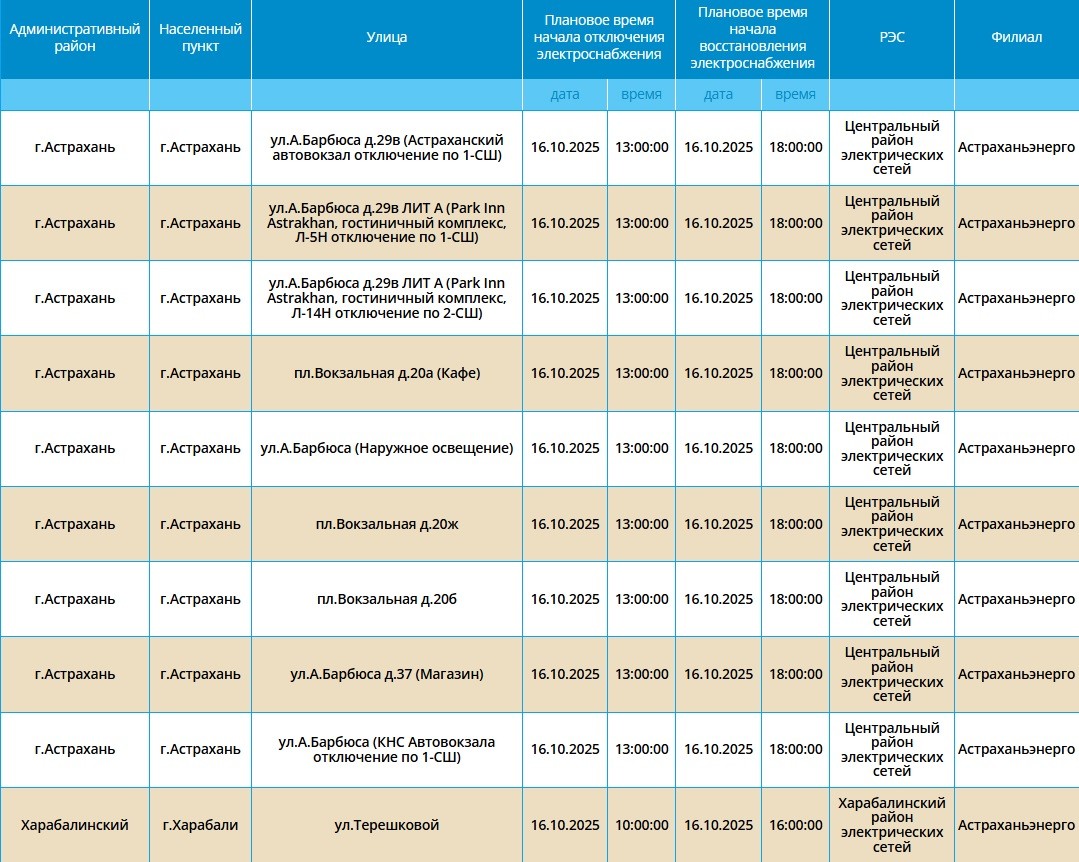 Завтра, 16 октября, в Астраханской области вновь пройдут плановые отключения электроэнергии. Без света останутся сотни улиц города и области. Отключения в частности затронут как жителей областного центра, так и проживающих в Харабалинском и Камызякском районах. Подробнее со списком адресов можно ознакомиться ниже: А информацию обо всех коммунальных проблемах нашего города вы можете найти здесь. На этом сайте, в режиме реального времени, вы можете наблюдать за отключениями света, воды и т.д. Если отключения произошли внепланово, звоните по телефонам, которые указаны ниже: