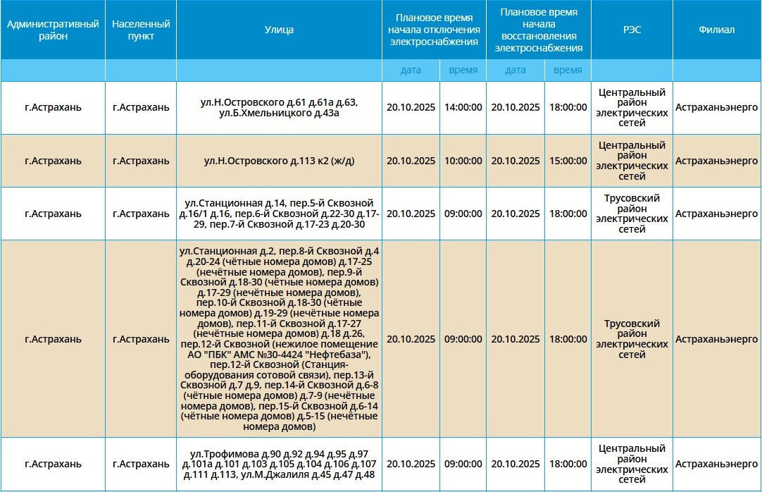 В понедельник, 20 октября, в городе Астрахань пройдут плановые отключения электричества, об этом сообщили сотрудники ПАО «Россети Юг». В частности без света останутся жители областного центра. Самые ранние отключения начнутся в 08:00 и продлятся 10 часов. Подробнее со списком адресов, по которым не будет электричества, можно ознакомиться ниже: Напоминаем, что следить за актуальной информацией о проблемах коммунальной сферы в городе Астрахань можно на удобной интерактивной карте. Здесь вы всегда сможете узнать свежую информацию о текущих профилактических мероприятиях, таких как временное прекращение подачи электроэнергии, воды и прочих коммунальных услуг. Если же непредвиденное отключение произошло неожиданно, незамедлительно обращайтесь по указанным контактным номерам телефонов: