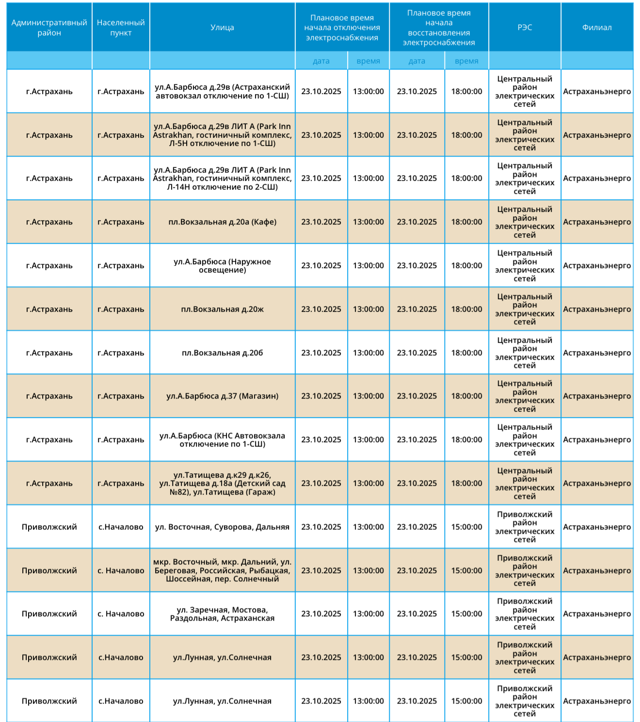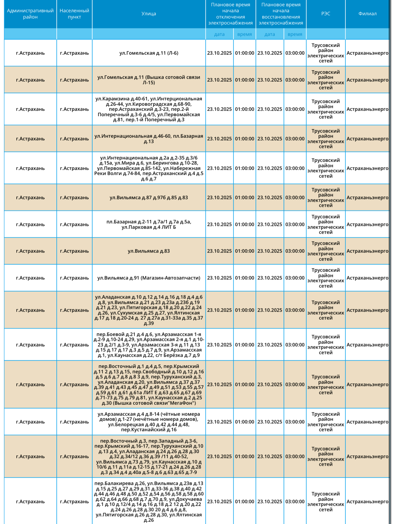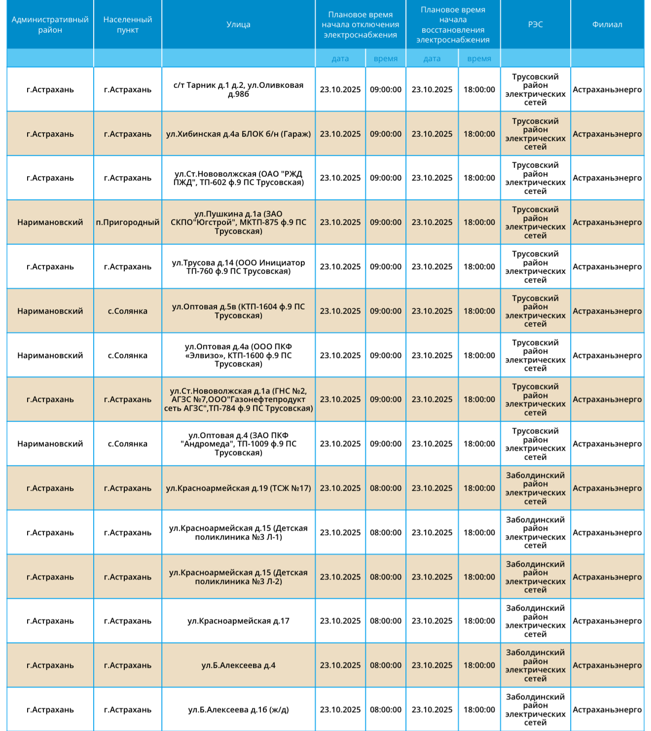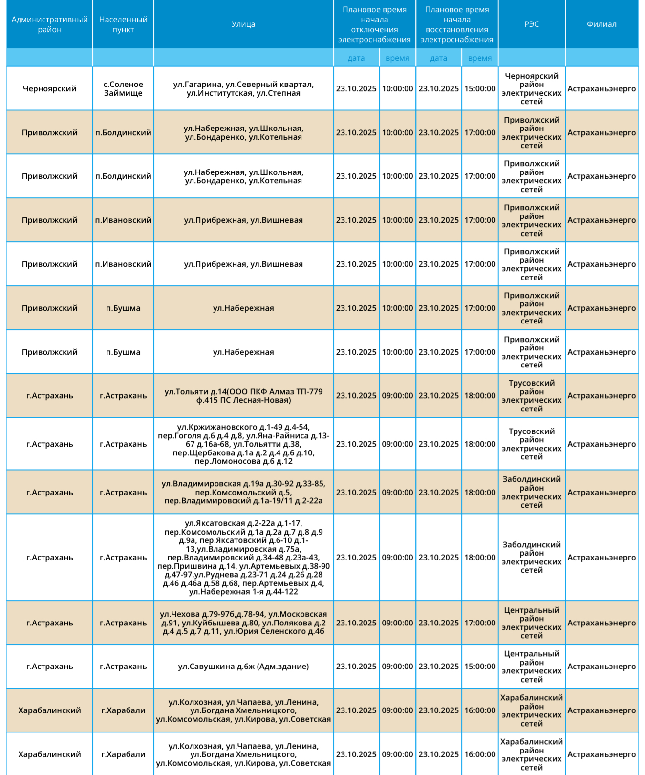 Тысячи абонентов останутся без электроэнергии, сообщили сотрудники ПАО «Россети Юг». Кроме того, свет отключат в нескольких школах, больницах и кафе. Отключения электричества пройдут как в самом областном центре, так и в Наримановском, Харабалинском, Приволжском и Черноярском районах. Подробнее со списком адресов можно ознакомиться в галерее ниже: Также напоминаем, что удобнее всего следить за актуальной информацией о перебоях с электричеством, водоснабжением и прочими бытовыми неудобствами на интерактивной карте города. А в случае, если отключения произошли незапланированно, обращайтесь по указанным ниже номерам телефонов: