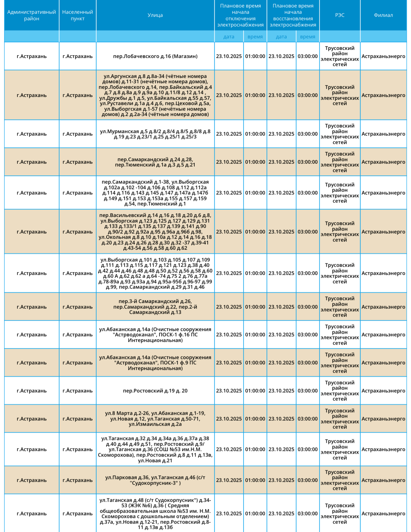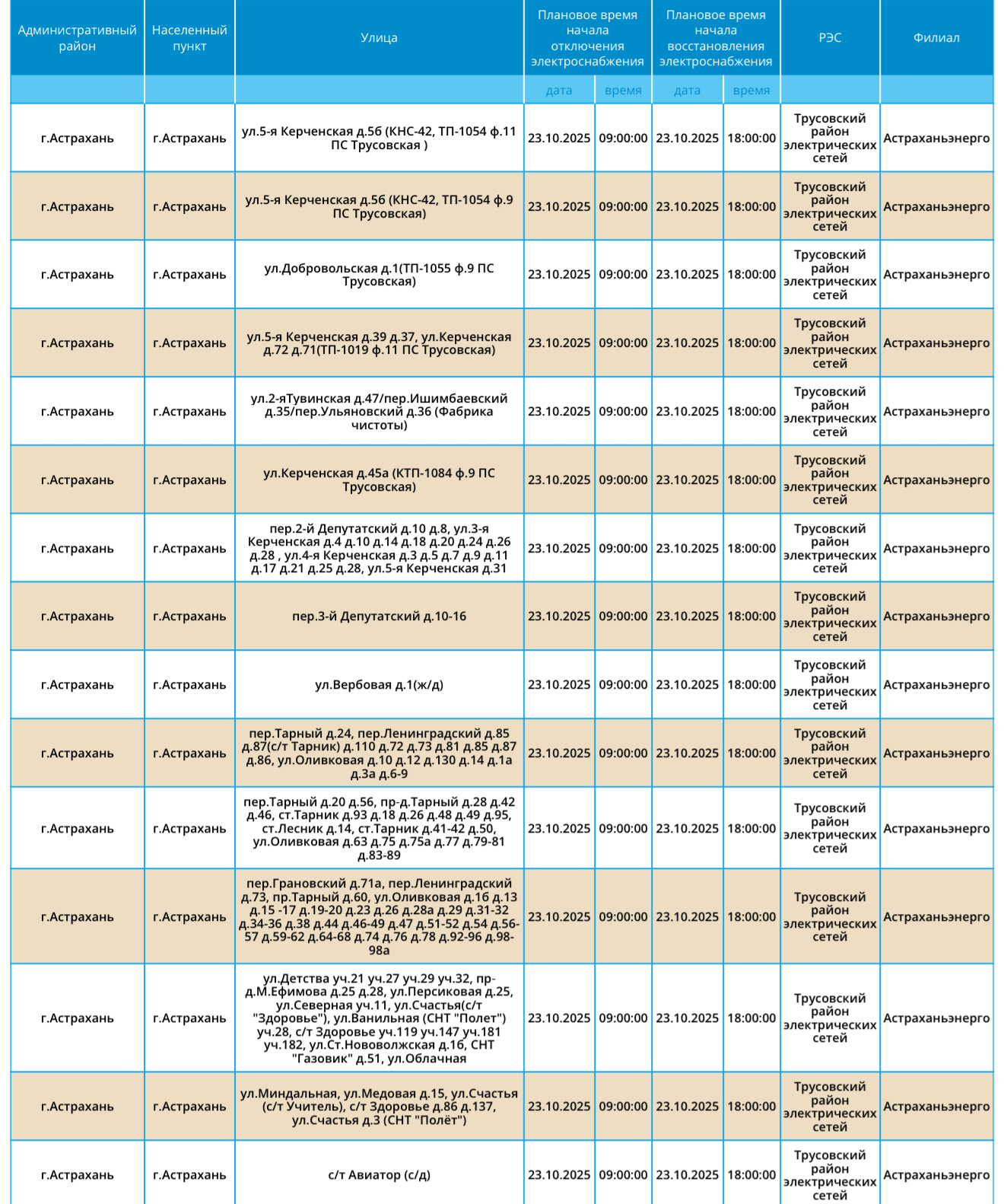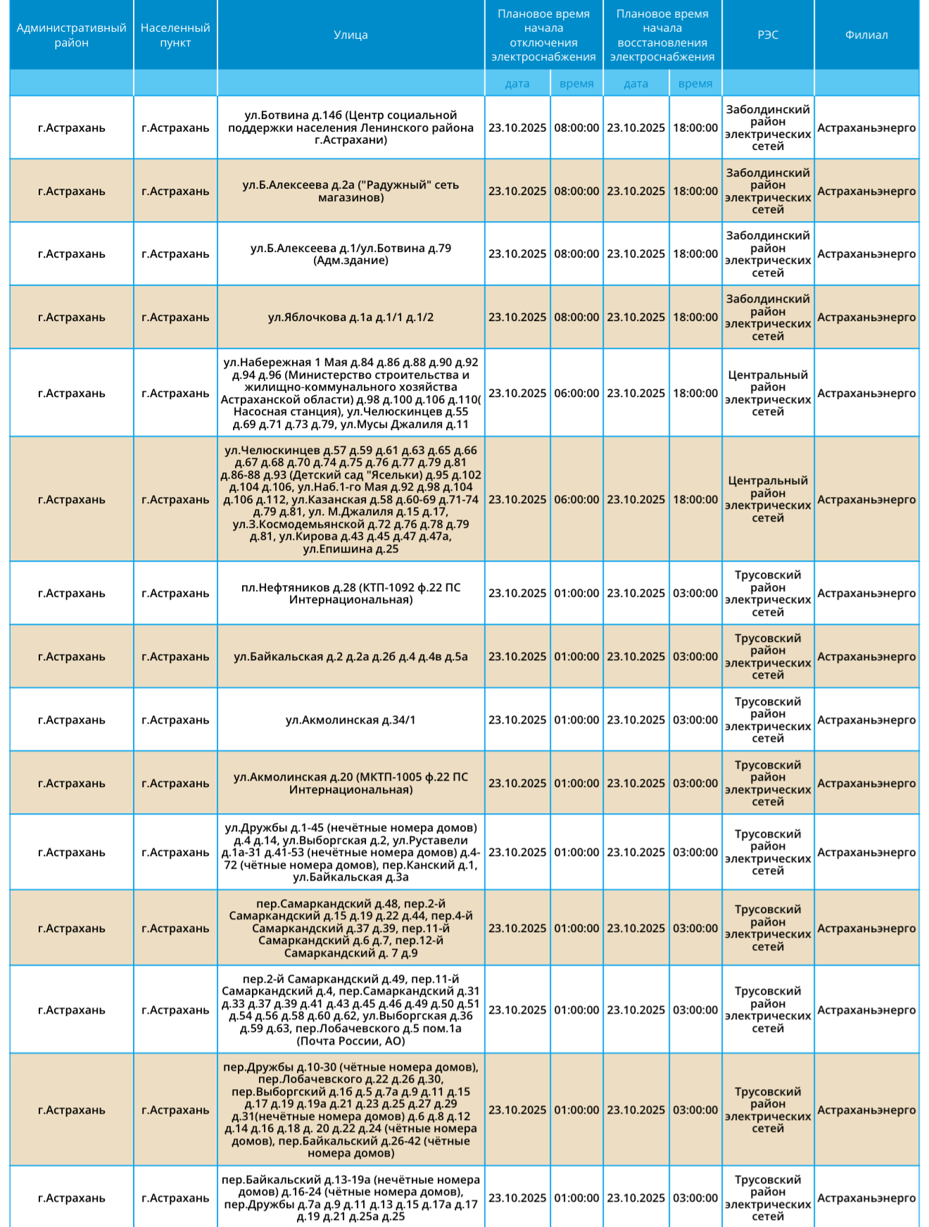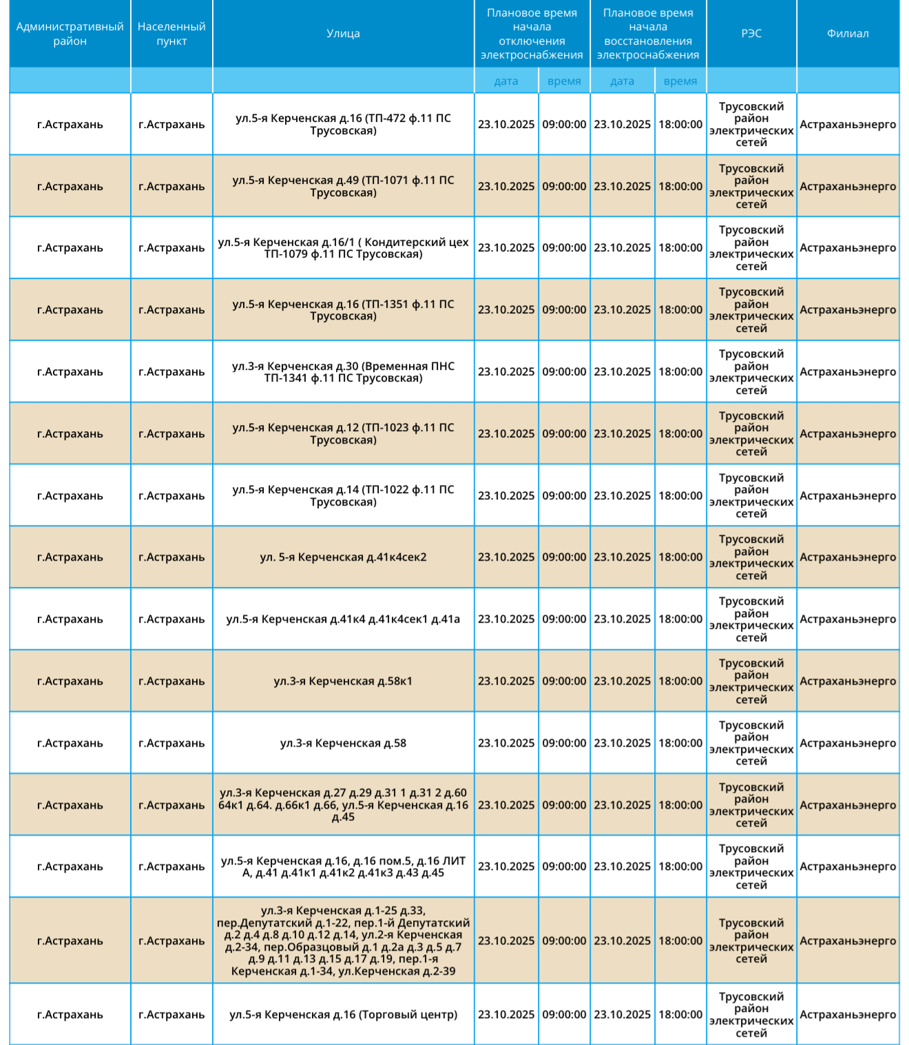 Тысячи абонентов останутся без электроэнергии, сообщили сотрудники ПАО «Россети Юг». Кроме того, свет отключат в нескольких школах, больницах и кафе. Отключения электричества пройдут как в самом областном центре, так и в Наримановском, Харабалинском, Приволжском и Черноярском районах. Подробнее со списком адресов можно ознакомиться в галерее ниже: Также напоминаем, что удобнее всего следить за актуальной информацией о перебоях с электричеством, водоснабжением и прочими бытовыми неудобствами на интерактивной карте города. А в случае, если отключения произошли незапланированно, обращайтесь по указанным ниже номерам телефонов: