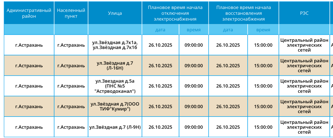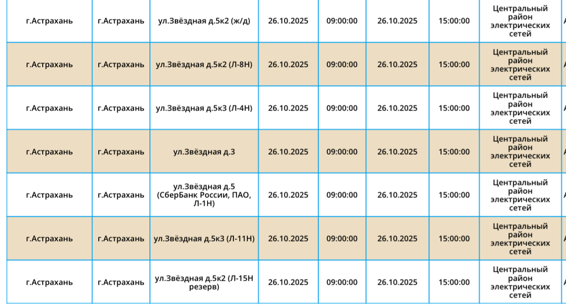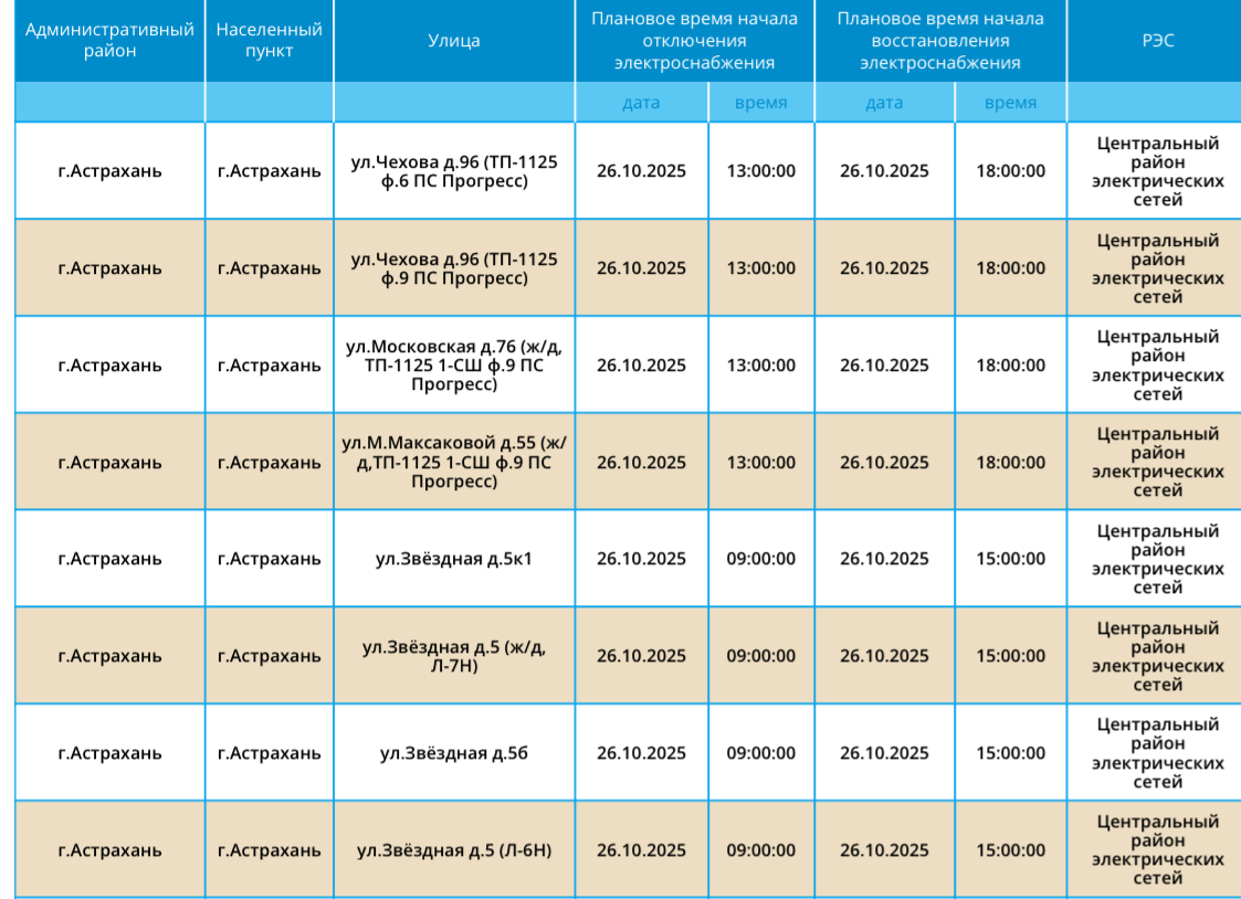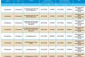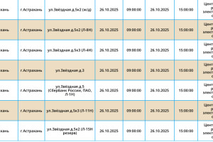 Завтра в Астраханской области сотрудники ПАО «Россети Юг» проведут плановые работы на электросетях. Из-за этого тысячи местных жителей останутся без света. Отключения пройдут в городе Астрахань. Стартуют работы в 09:00, а вернется ресурс в дома и квартиры астраханцев только к 15:00 или 18:00. Без света останутся жилые дома и ПНС. Подробности в галерее ниже: А информацию обо всех коммунальных проблемах нашего города вы можете найти на карте. Здесь, в режиме реального времени, вы можете наблюдать за отключениями света, воды и т.д. Если возникли незапланированные отключения, можно обращаться по указанным контактным телефонам: