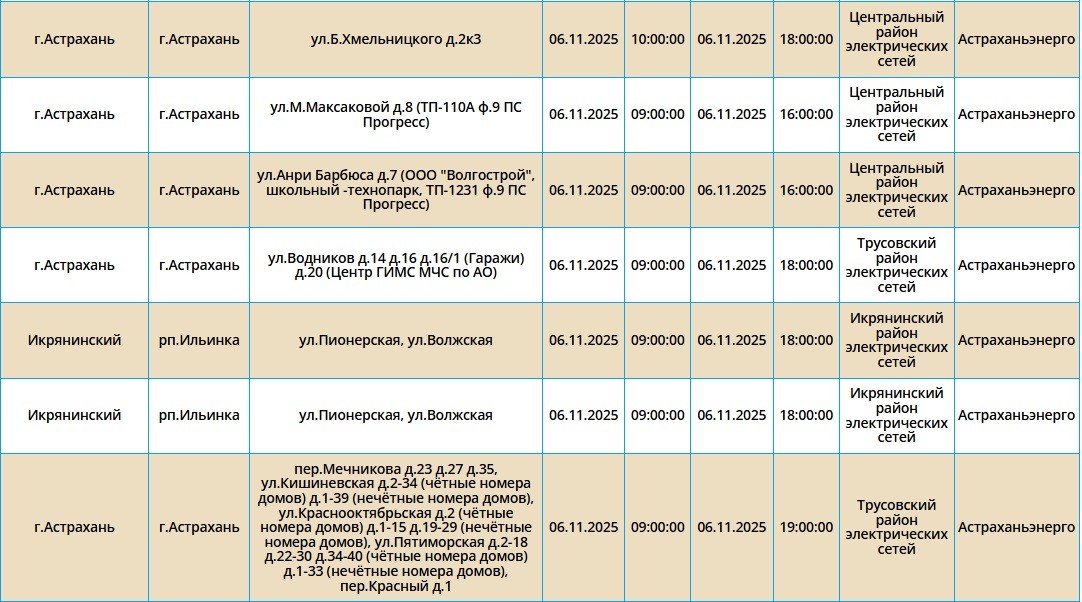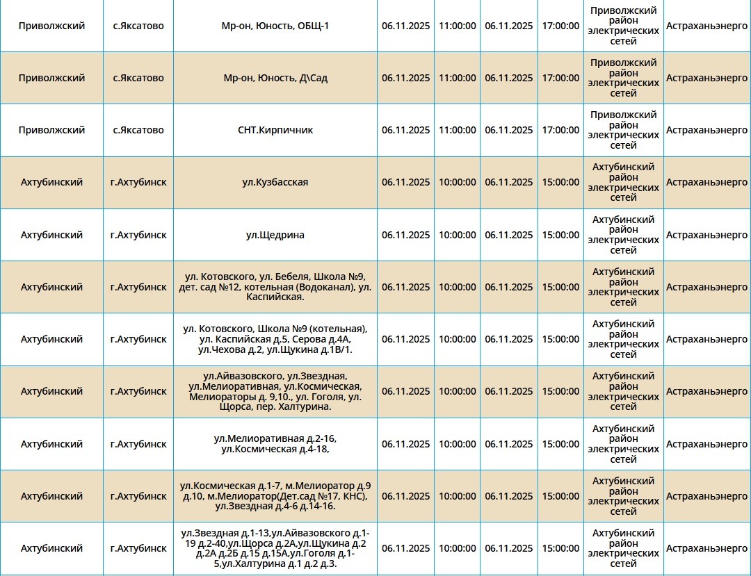Энергетики продолжают плановые работы на электросетях, в связи с чем завтра многие абоненты останутся без электроэнергии. Так, жителей города Астрахань, а также Ахтубинского, Приволжского и Икрянинского районов ждут плановые отключения электричества. Без света останутся детские сады, несколько школ и автосервис. Самые ранние отключения начнутся в 09:00 и продлятся около 9 часов. С полным списком адресов можно ознакомиться в галерее ниже: А информацию обо всех коммунальных проблемах нашего города вы можете найти здесь. На этом сайте, в режиме реального времени, вы можете наблюдать за отключениями света, воды и т.д. Если отключения произошли внепланово, звоните по телефонам, которые указаны ниже: