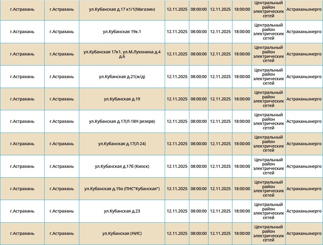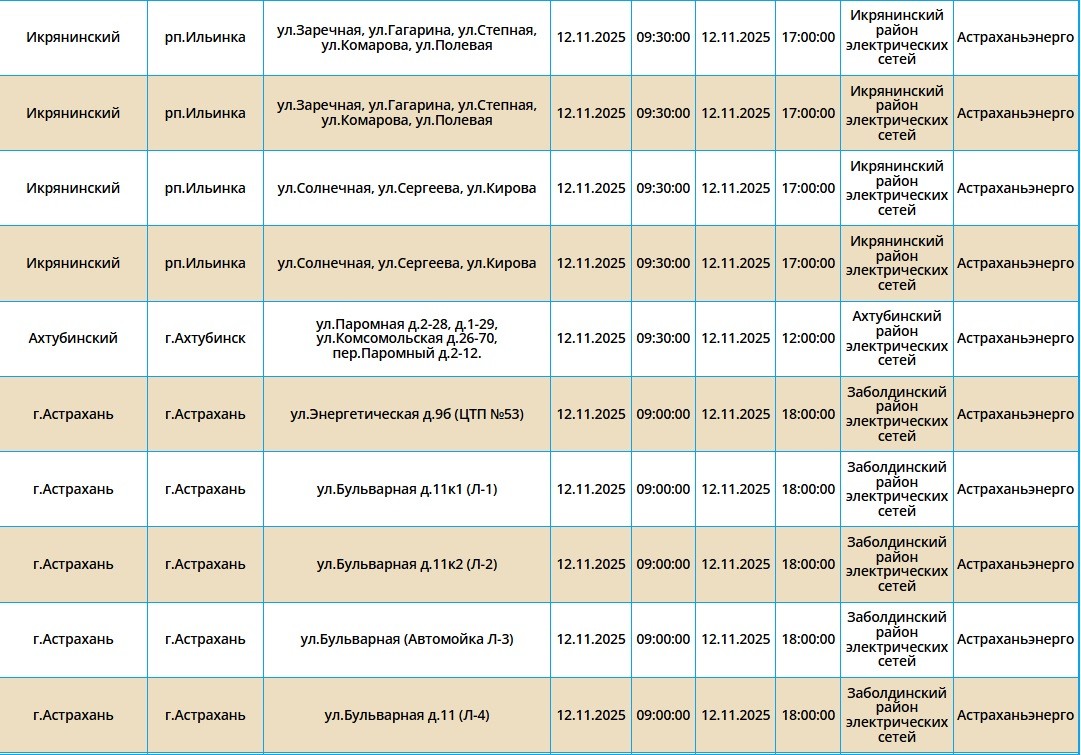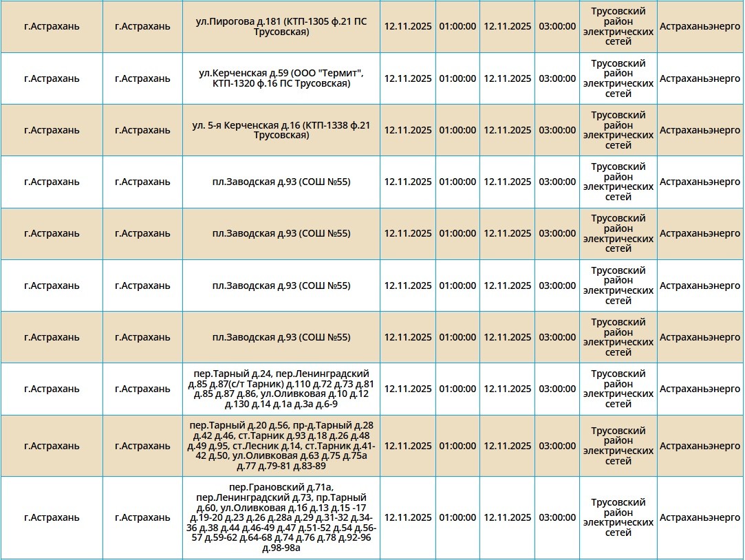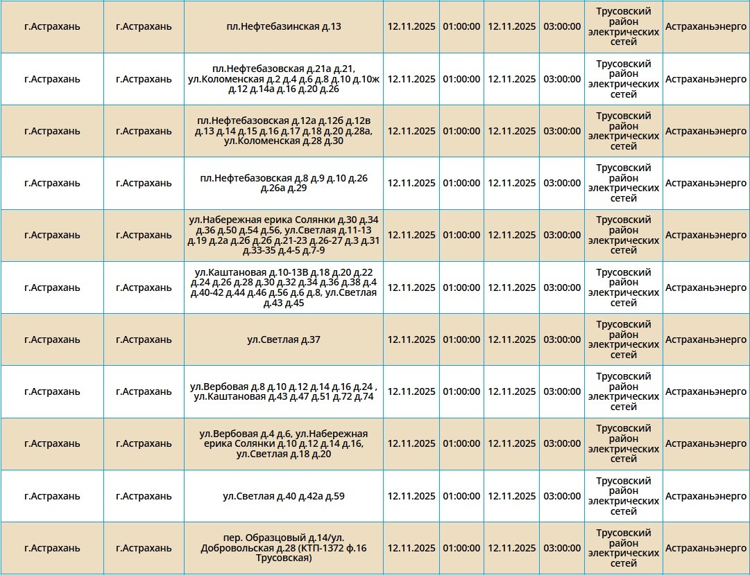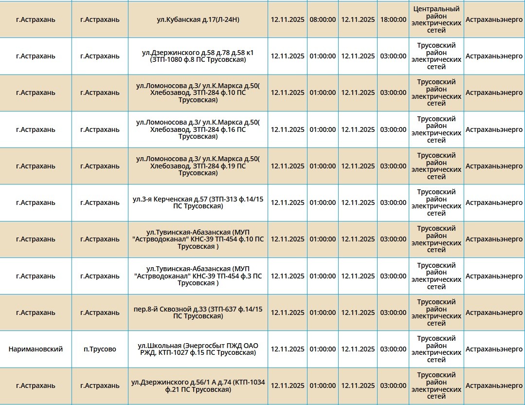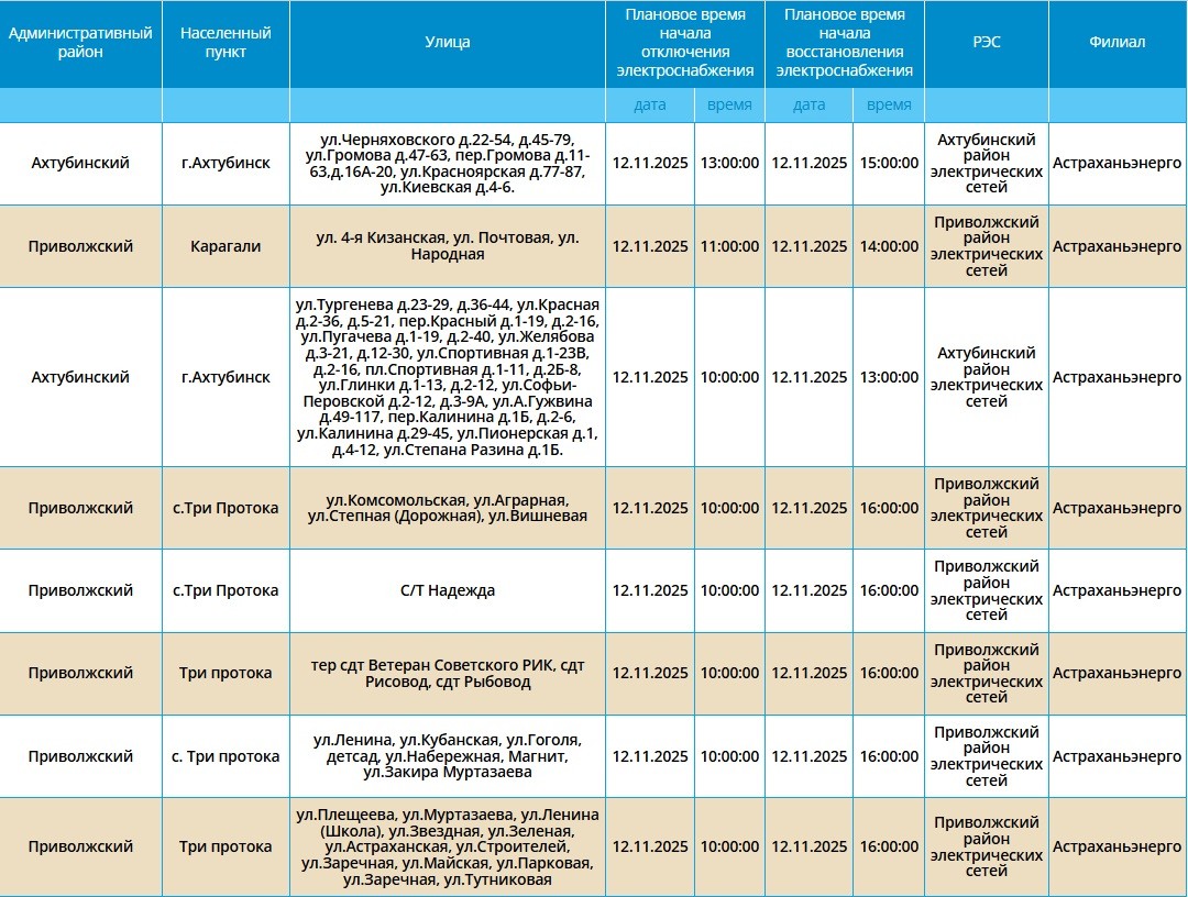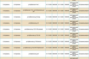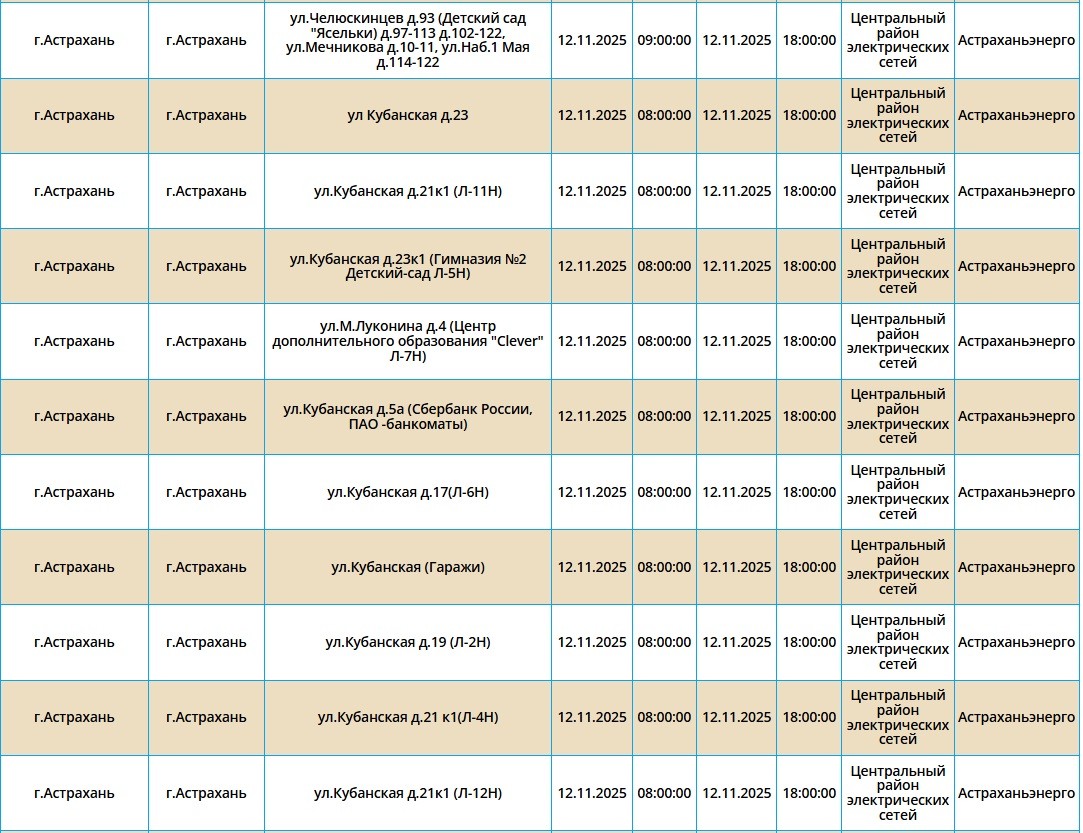 Завтра в Астраханской области пройдут масштабные отключения света, сообщили в ПАО «Россети Юг». Помимо сотни жилых домов, без электричества также останутся детские сады, медицинские и социальные учреждения города и области. Самые ранние отключения начнутся уже этой ночью, с 01:00. Самые долгие продлятся около 10 часов. Отключения пройдут как в самом городе Астрахань, так и в Ахтубинском, Приволжском, Икрянинском и Наримановском районах. Некоторые адреса мы опубликовали в галерее ниже, а с полным списком можно ознакомиться по этой ссылке. Все коммунальные проблемы нашего города отображаются на этой интерактивной карте. Вы можете следить за ситуацией с отключением электроэнергии, водоснабжения и других услуг в режиме онлайн. В случае возникновения непредвиденных ситуаций обращайтесь по представленным контактным номерам телефонов: