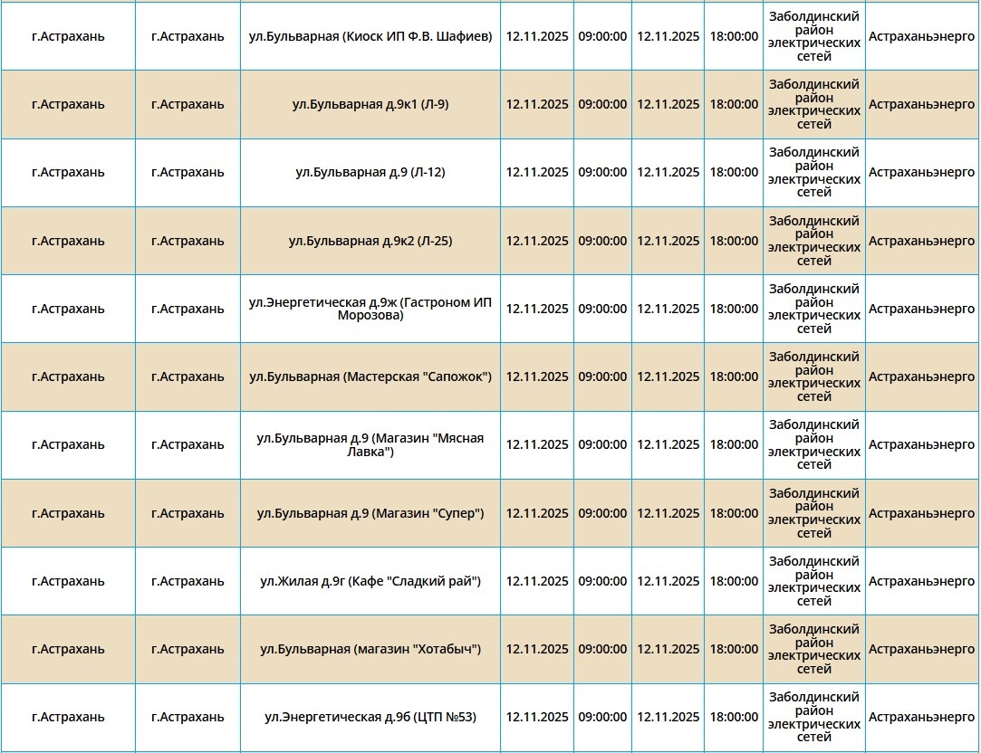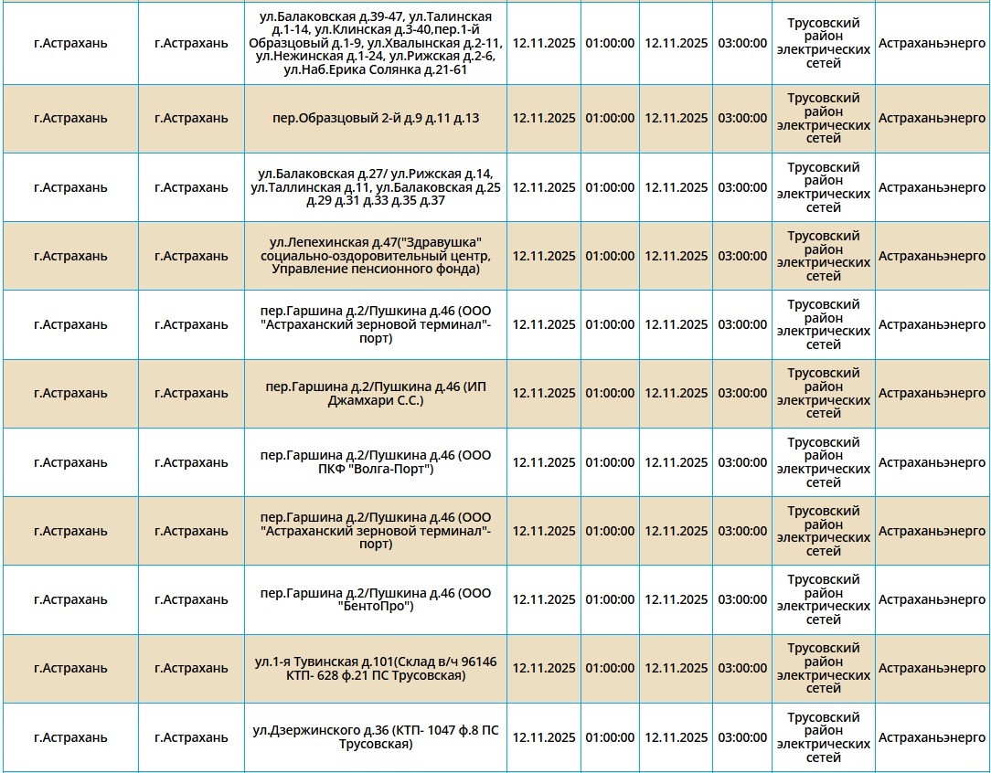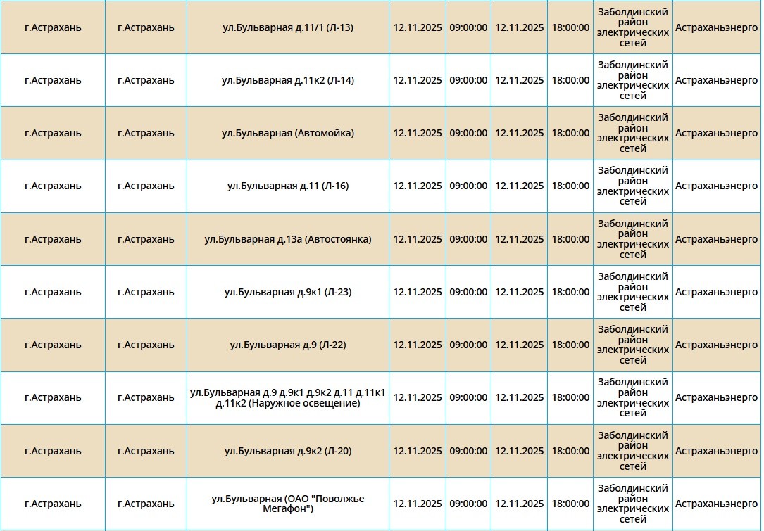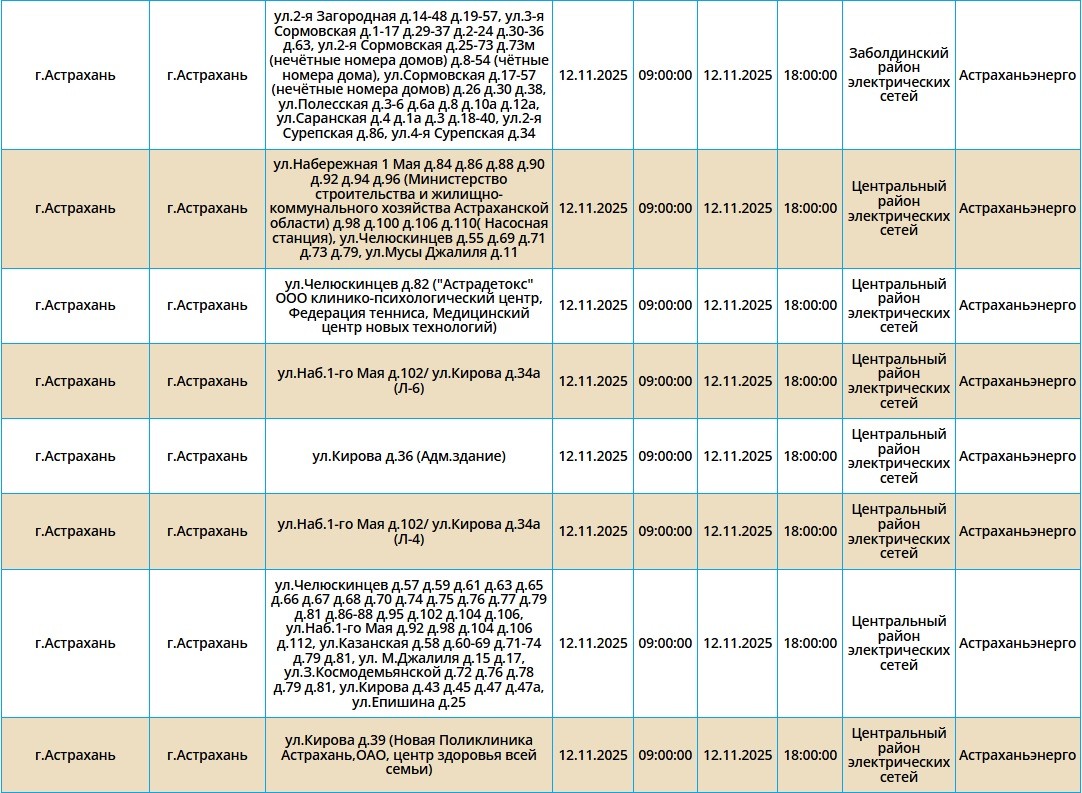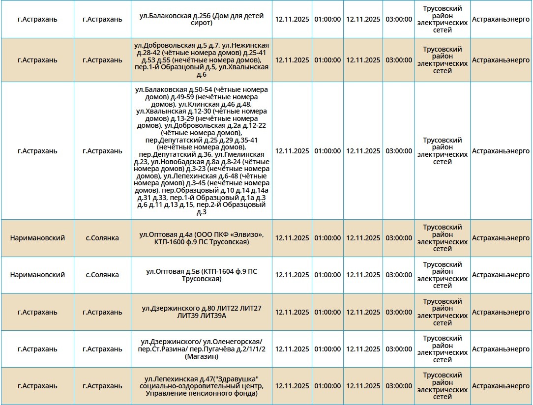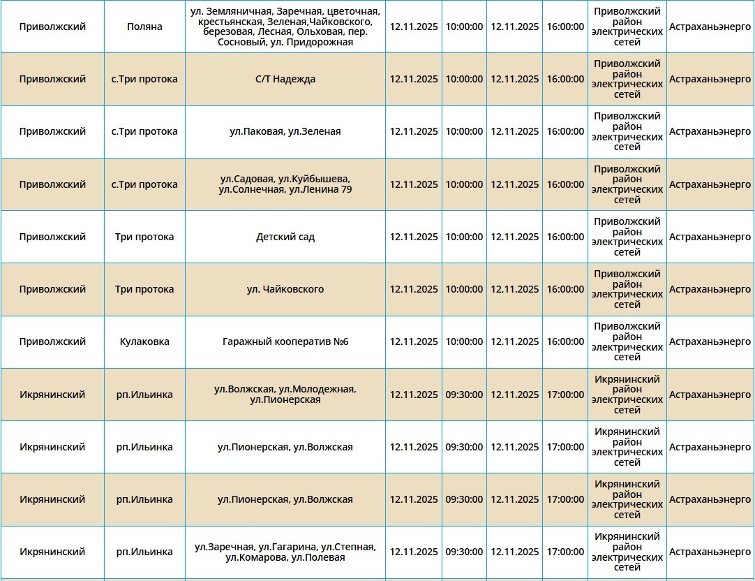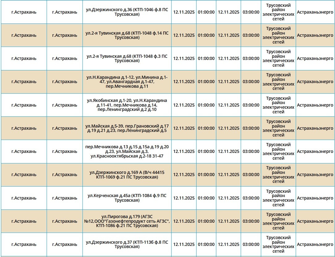 Завтра в Астраханской области пройдут масштабные отключения света, сообщили в ПАО «Россети Юг». Помимо сотни жилых домов, без электричества также останутся детские сады, медицинские и социальные учреждения города и области. Самые ранние отключения начнутся уже этой ночью, с 01:00. Самые долгие продлятся около 10 часов. Отключения пройдут как в самом городе Астрахань, так и в Ахтубинском, Приволжском, Икрянинском и Наримановском районах. Некоторые адреса мы опубликовали в галерее ниже, а с полным списком можно ознакомиться по этой ссылке. Все коммунальные проблемы нашего города отображаются на этой интерактивной карте. Вы можете следить за ситуацией с отключением электроэнергии, водоснабжения и других услуг в режиме онлайн. В случае возникновения непредвиденных ситуаций обращайтесь по представленным контактным номерам телефонов: