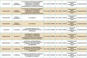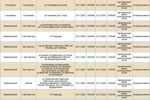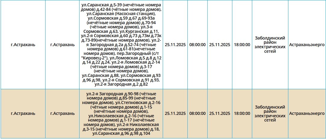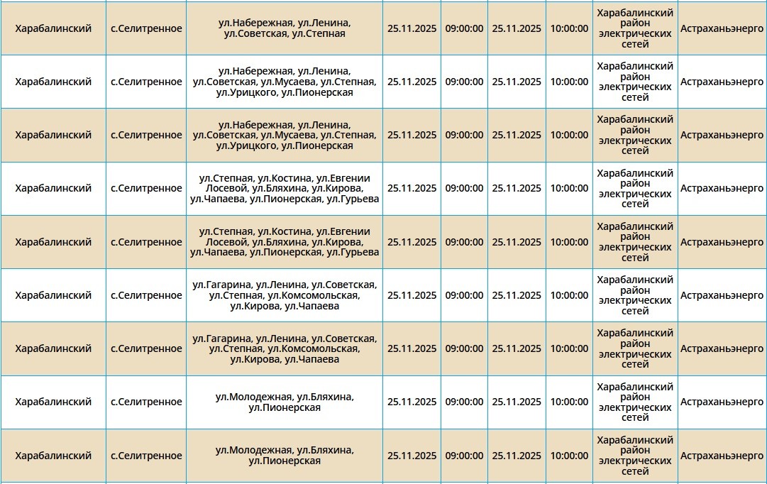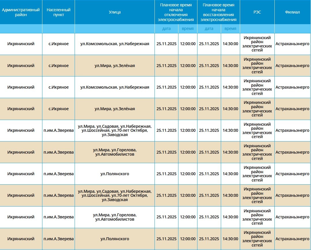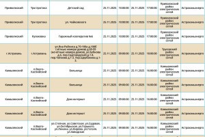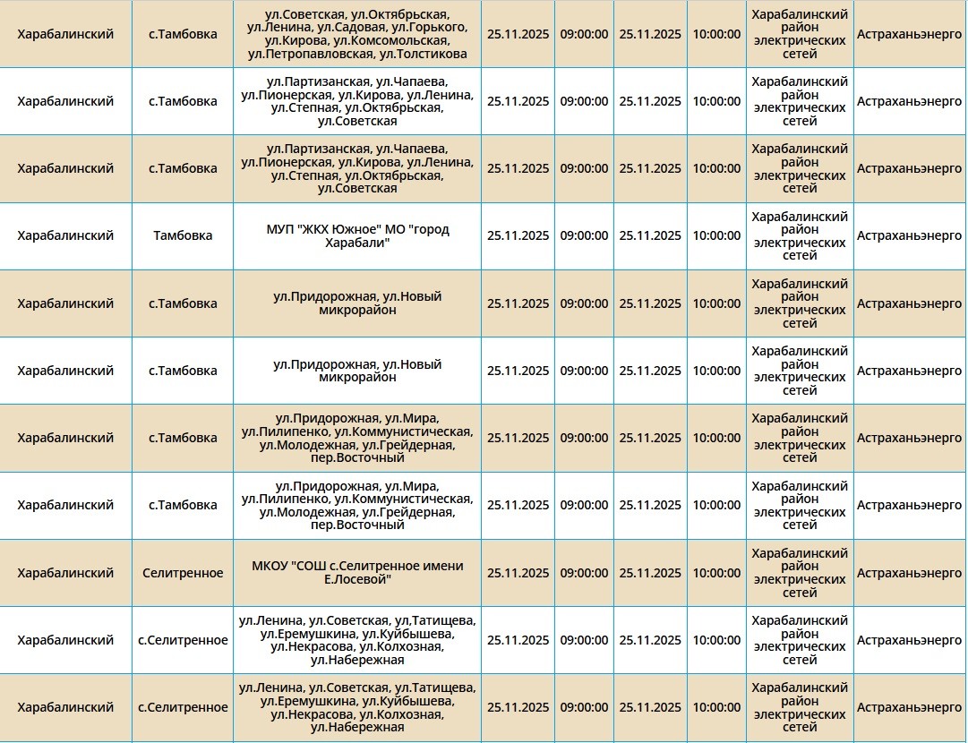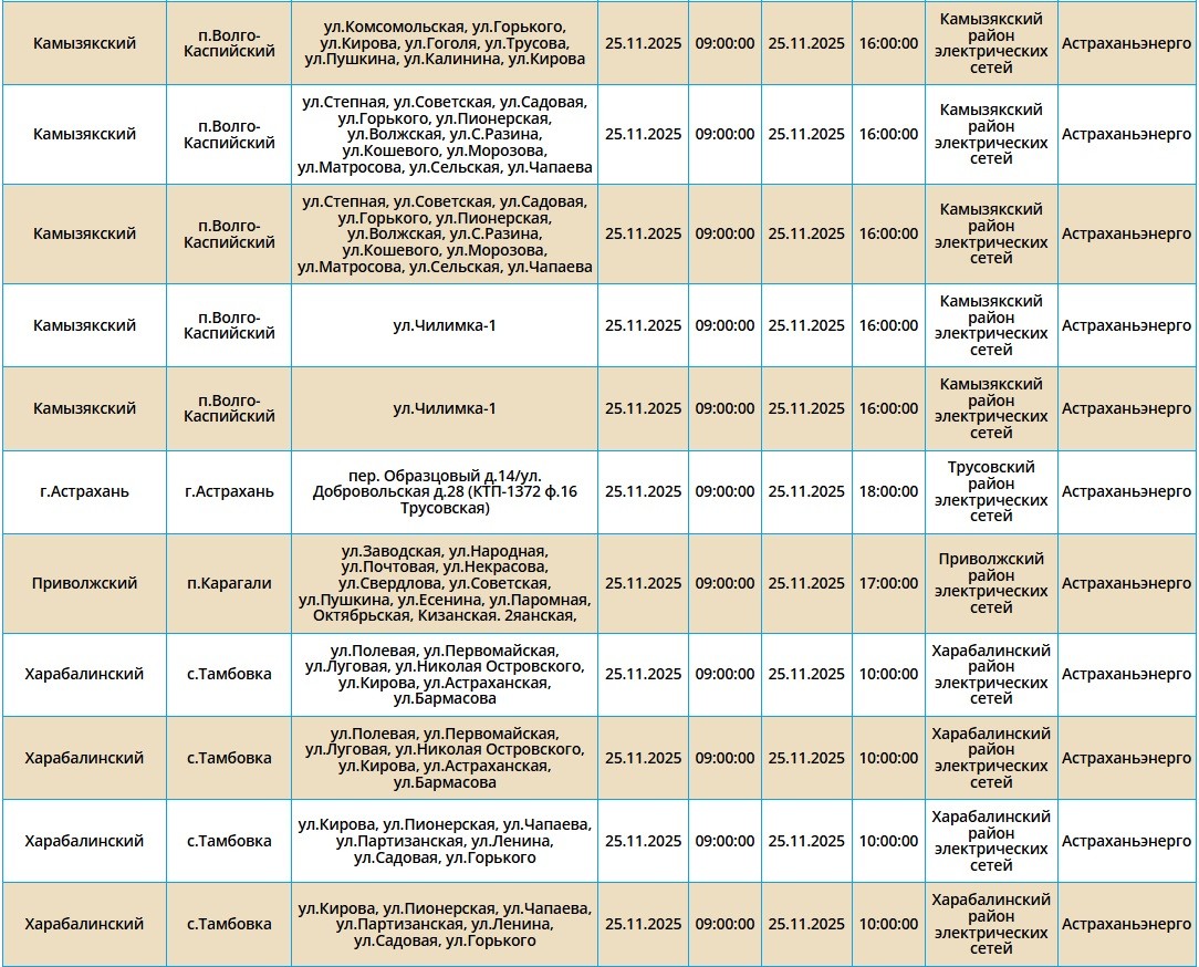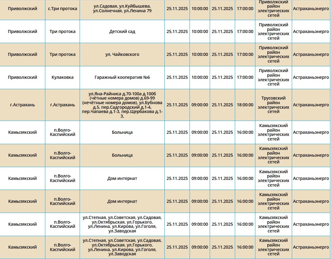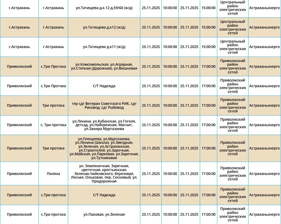 Завтра, 25 ноября, в Астрахани и четырех районах области планово отключат электроэнергию. Это необходимо для проведения ремонтных работ на электросетях. Без света останутся как сам областной центр, так и Икрянинский, Харабалинский, Приволжский и Камызякский районы. Самые ранние отключения начнутся в 08:00 и продлятся около 10 часов. Астраханцев просят набраться терпения и заранее зарядить все свои гаджеты. С полным списком адресов, где временно отключат электроэнергию, можно ознакомиться в галерее ниже: А информацию обо всех коммунальных проблемах нашего города вы можете найти здесь. На этом сайте, в режиме реального времени, можно наблюдать за отключениями света, воды и т.д. Если отключения случились внепланово, звоните по телефонам, которые указаны на фото ниже: