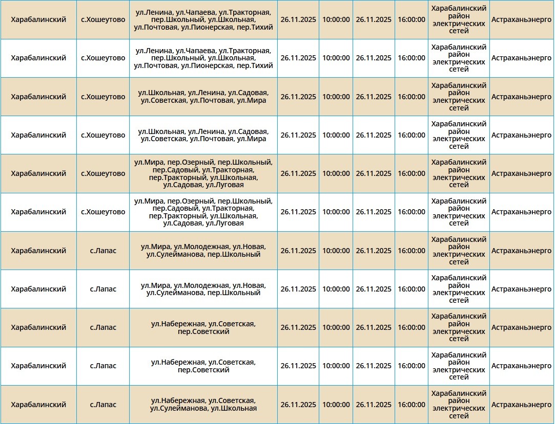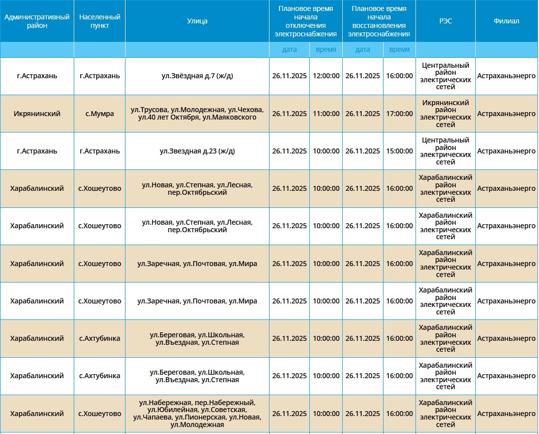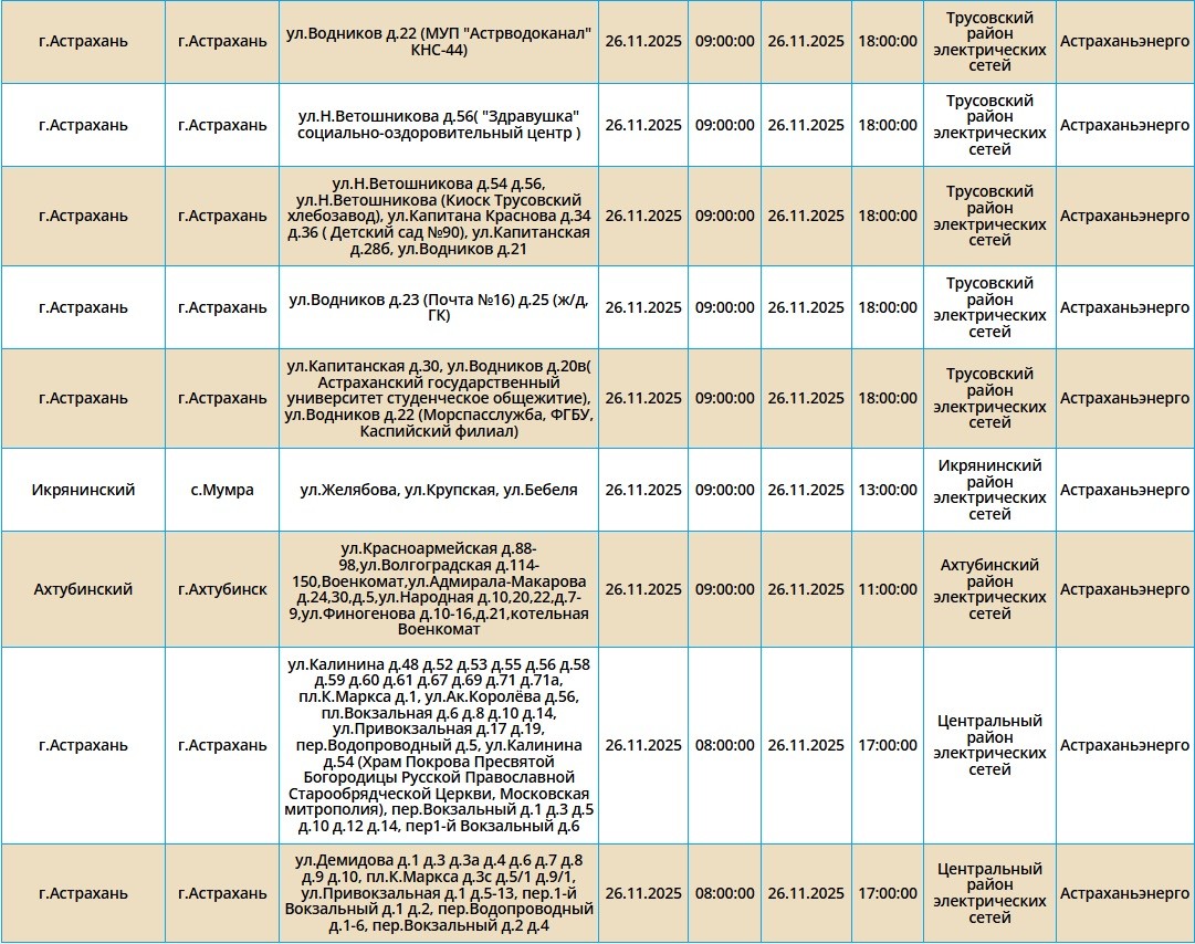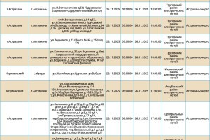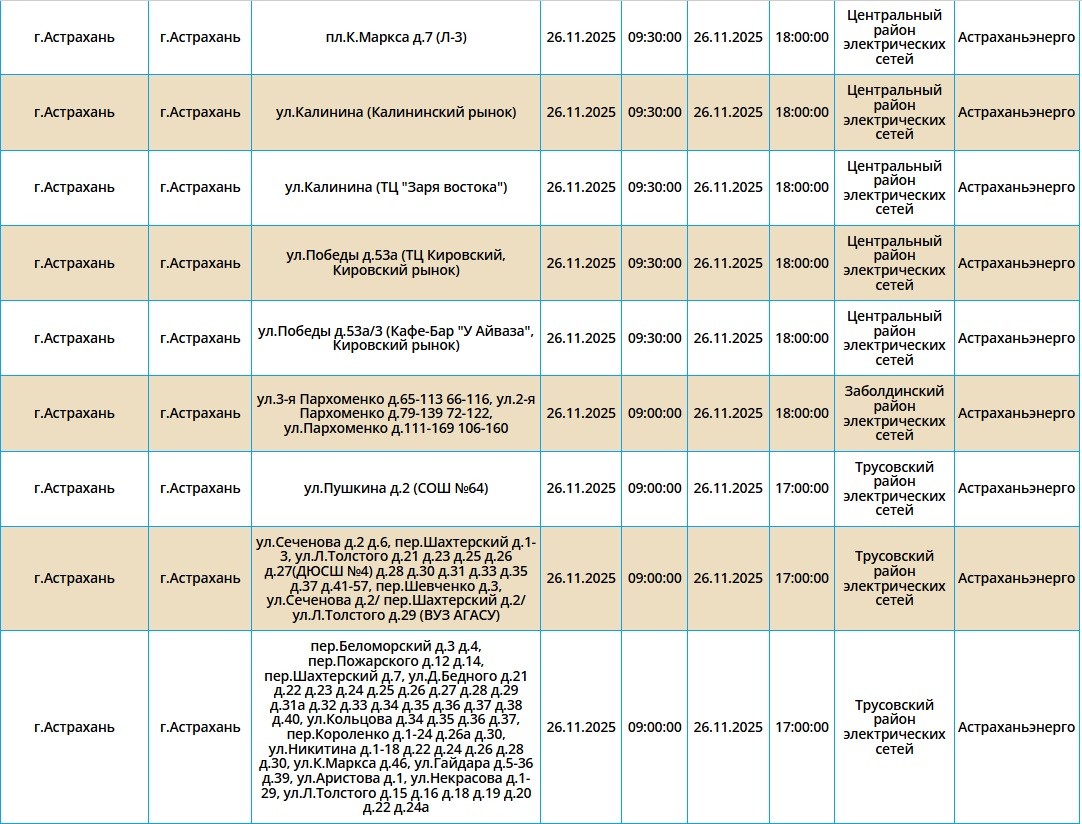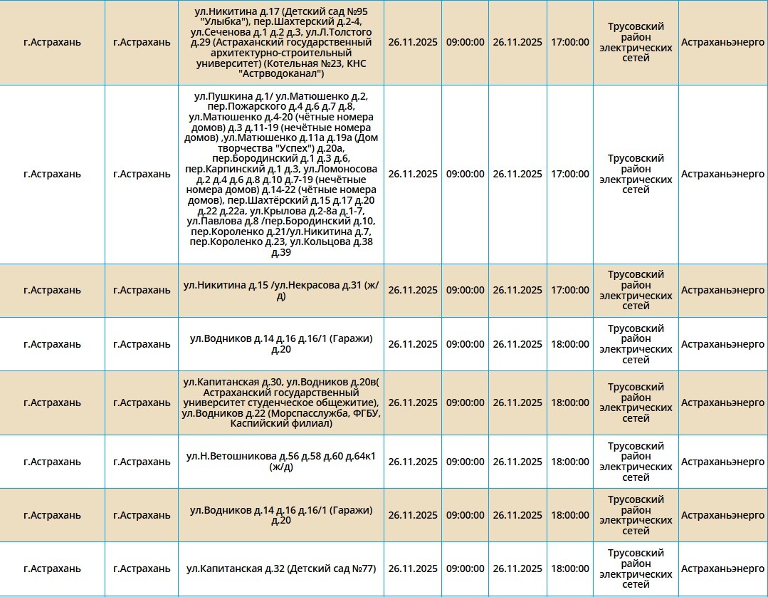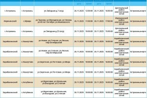 26 ноября на территории Астраханской области запланированы отключения электричества. Так, без света останутся, в том числе, Кировский рынок, а также несколько школ и детских садов. Отключения пройдут как в самом городе Астрахань, так и в Ахтубинском, Харабалинском и Икрянинском районах. Самые ранние отключения начнутся в 08:00. Подробнее со списком адресов можно ознакомиться в галерее ниже: Кстати, информацию обо всех коммунальных проблемах нашего города вы можете найти здесь. На этом сайте, в режиме реального времени, можно наблюдать за отключениями света, воды и т.д. А если отключения случились внепланово, звоните по телефонам, которые указаны на фото: