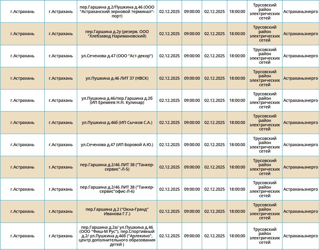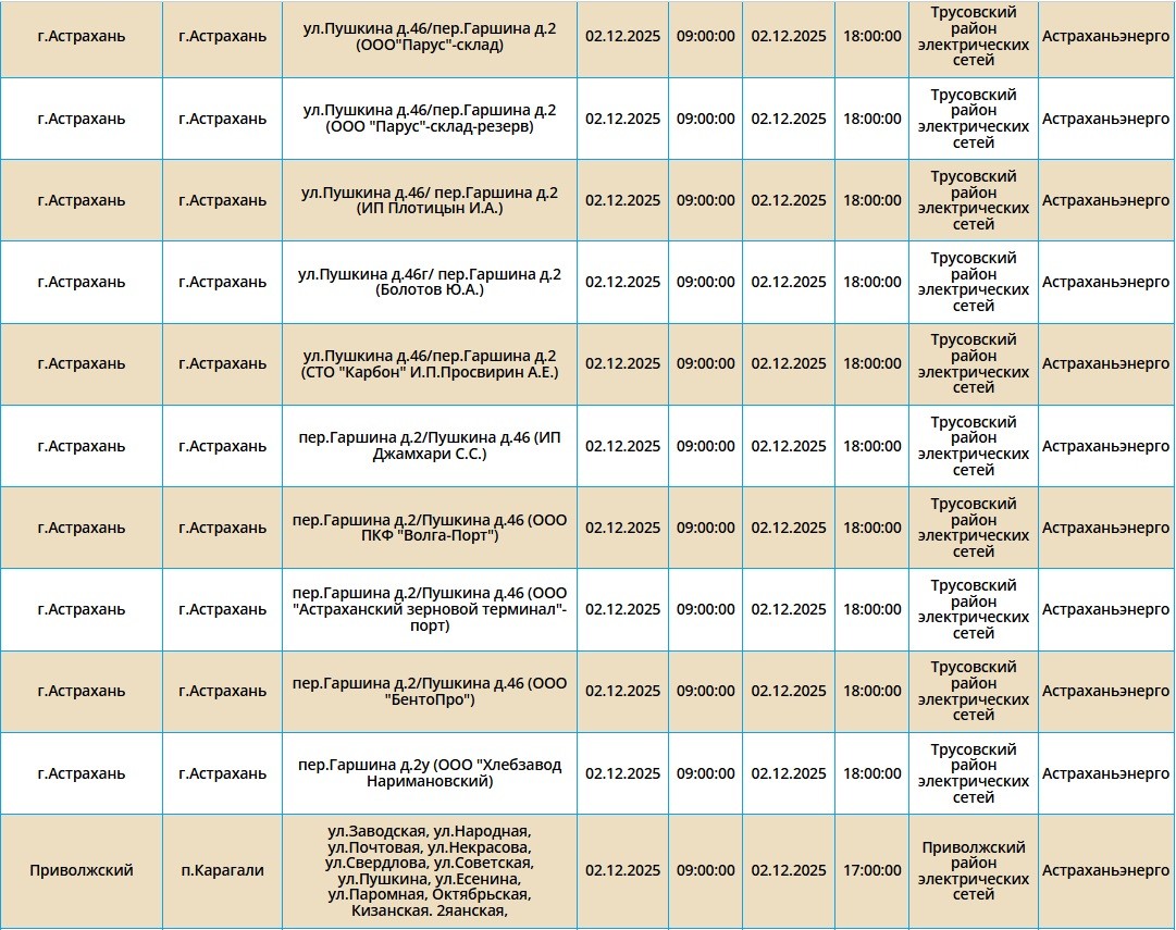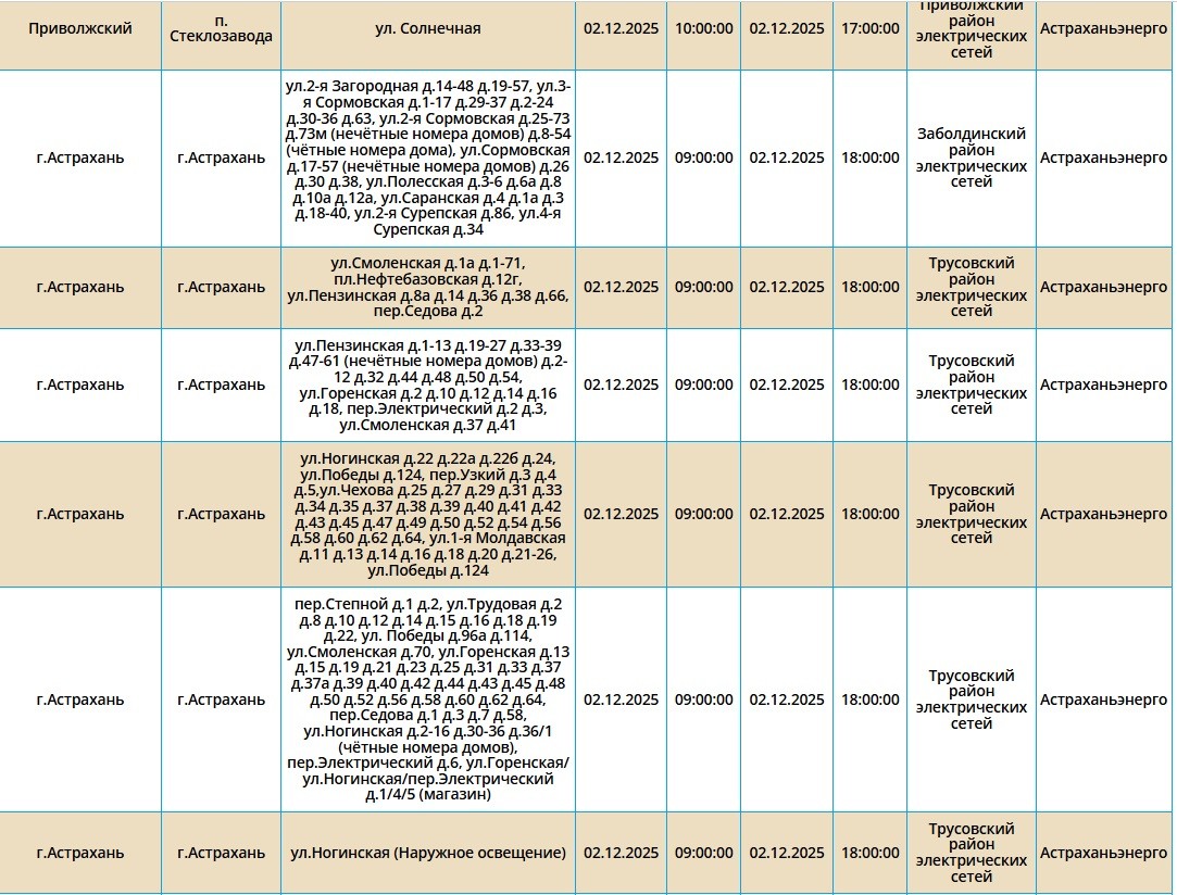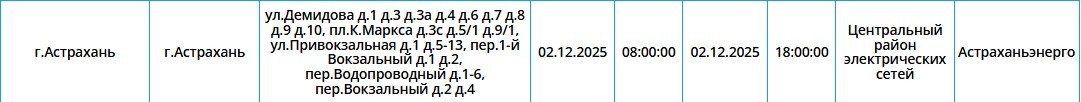 Завтра в Астраханской области продолжатся плановые работы на электросетях, в связи с чем многие абоненты останутся без электроэнергии. Так, жителей города Астрахань, а также Приволжского района ждут плановые отключения электричества. Самые ранние отключения начнутся в 08:00 и продолжатся около 10 часов. Полный список адресов можно увидеть ниже: А информацию обо всех коммунальных проблемах нашего города вы можете найти здесь. На этом сайте, в режиме реального времени, вы можете наблюдать за отключениями света, воды и т.д. Если отключения произошли внепланово, звоните по телефонам, которые указаны ниже:
