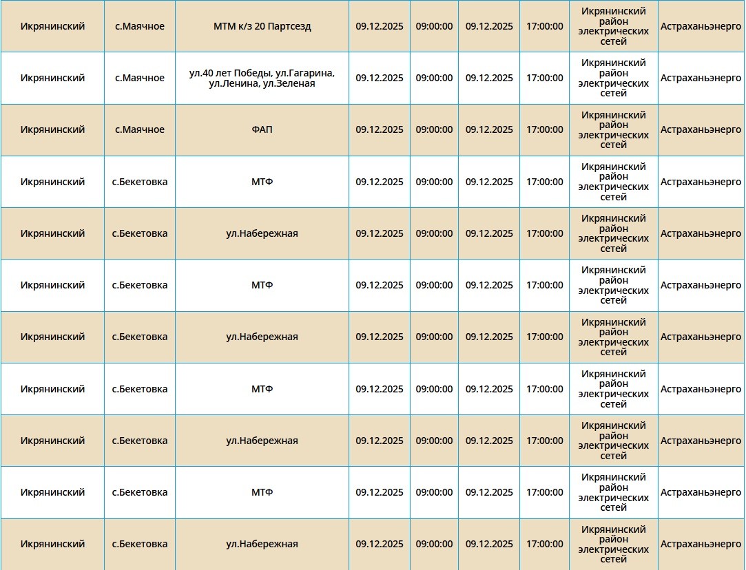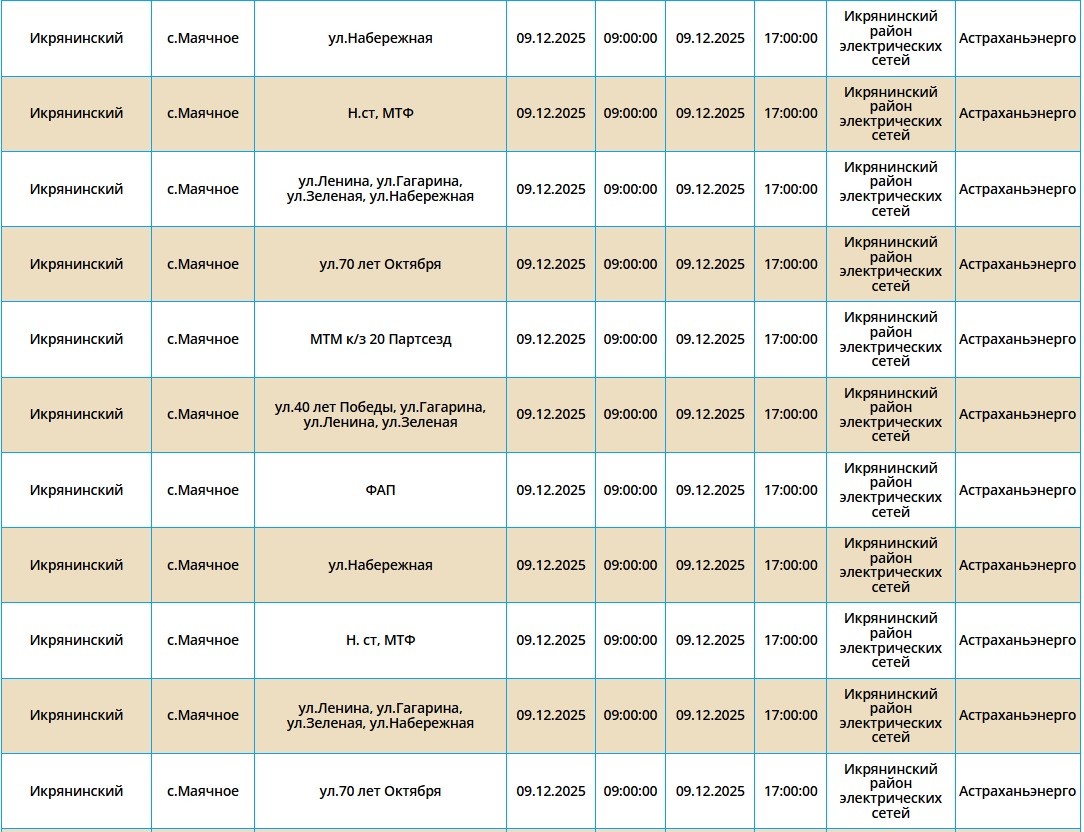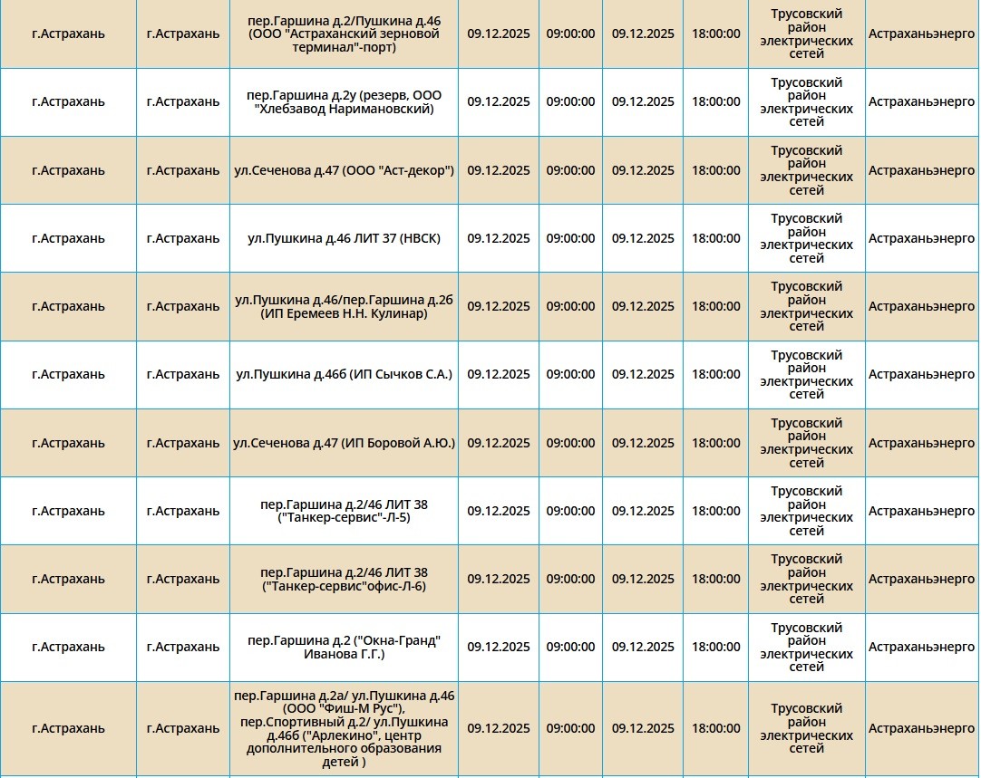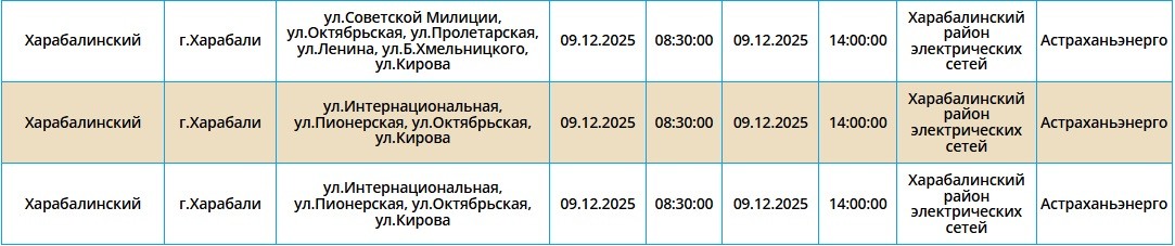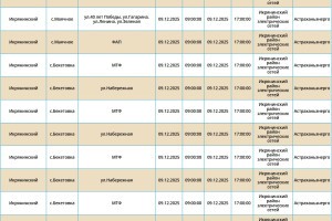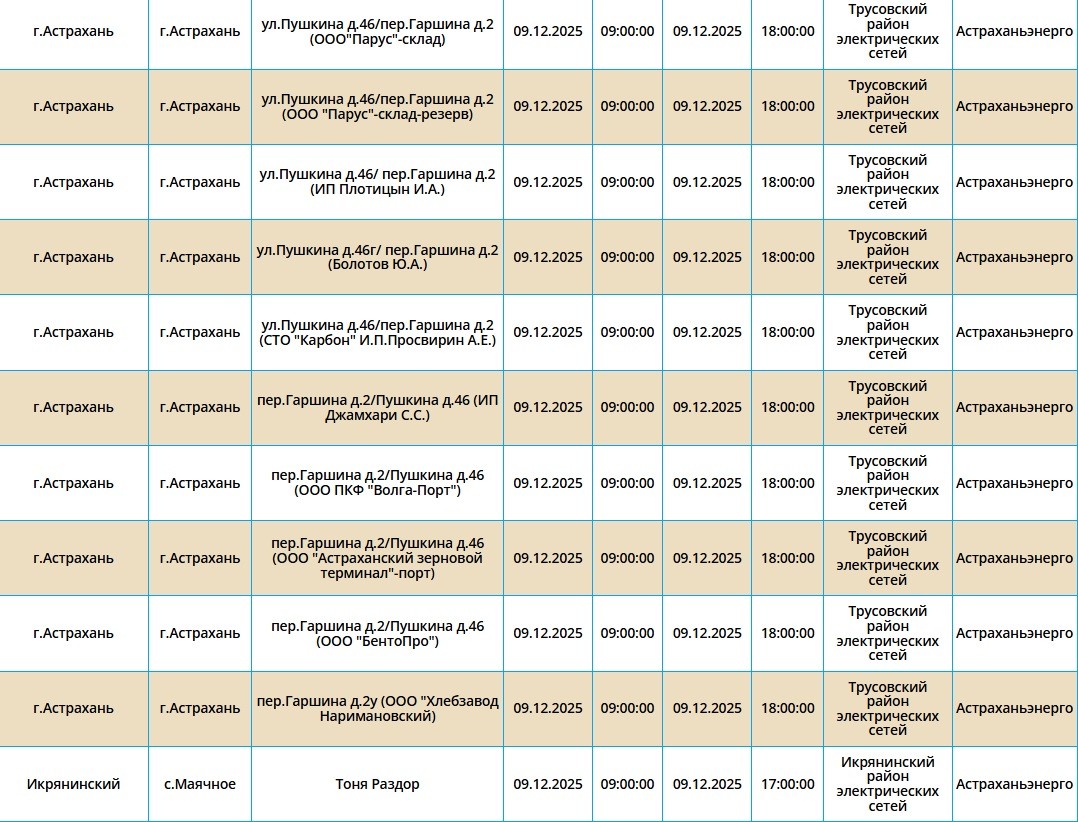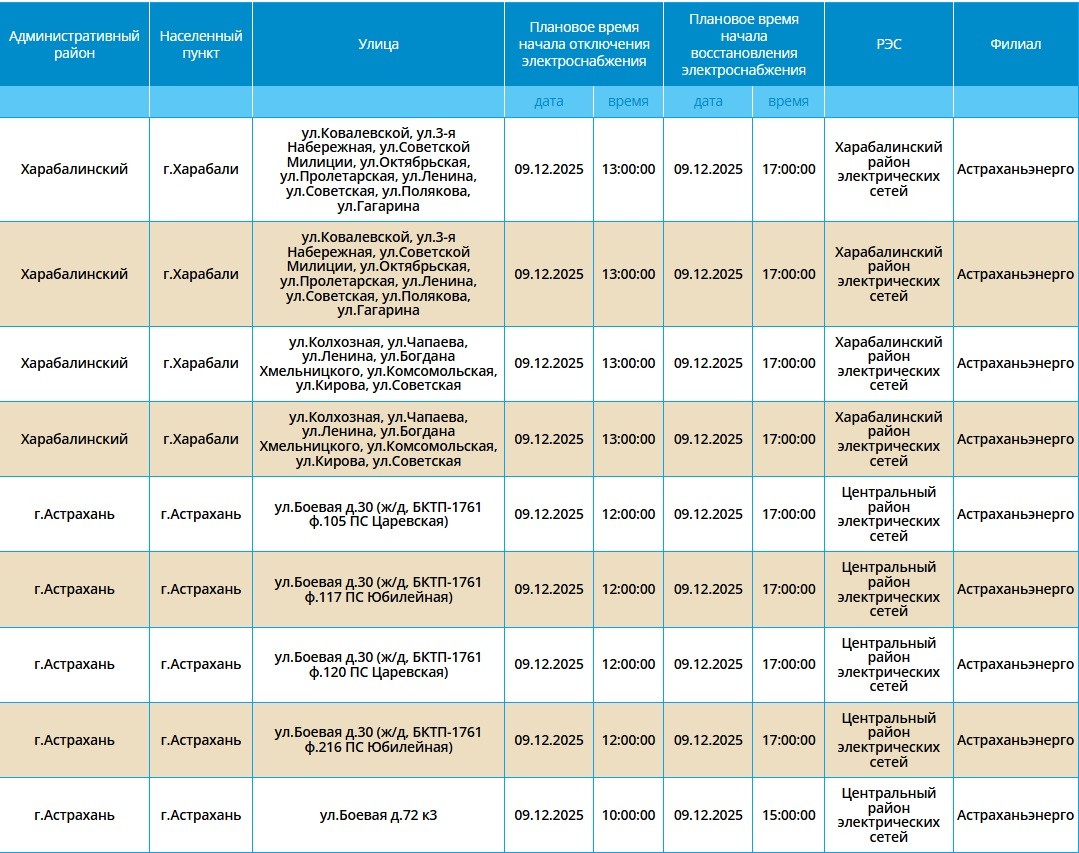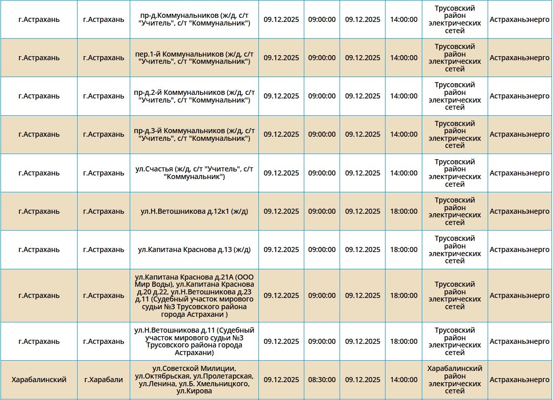 Сотрудники ПАО «Россети Юг» продолжают плановые работы на электросетях. В связи с этим 9 декабря некоторые астраханцы останутся без света. Данные неудобства затронут жителей областного центра, а также Икрянинского и Харабалинского районов. Самые ранние отключения начнутся в 08:30, а самые продолжительные займут около 9 часов. Подробнее со списком адресов можно ознакомиться в галерее ниже: Также напоминаем, что удобнее всего следить за актуальной информацией о перебоях с электричеством, водоснабжением и прочими бытовыми неудобствами на интерактивной карте города. А в случае, если отключения произошли незапланированно, обращайтесь по указанным ниже номерам телефонов: