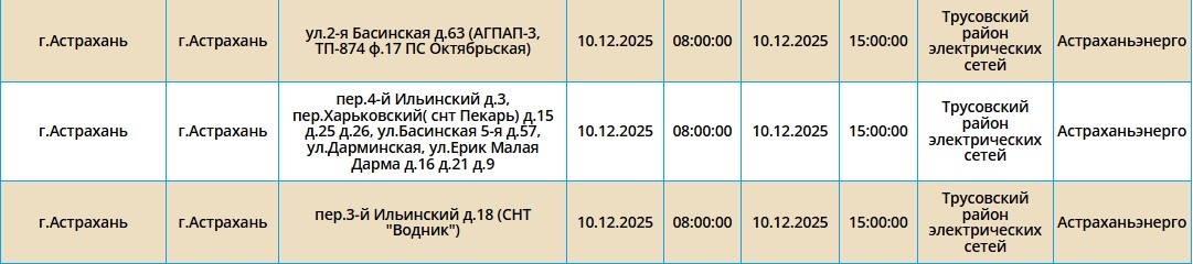 Завтра по нескольким адресам в городе Астрахань и одном районе области пройдут плановые отключения света. Об этом сообщили в ПАО «Россети Юг». Без электричества останутся как сам областной центр, так и Камызякской район. Света не будет в том числе на автотранспортном предприятии, в магазине ритуальных услуг и Морспасслужбе. Самые ранние отключения начнутся в 08:00. Полный список адресов в галерее ниже: Удобнее всего следить за актуальной информацией о перебоях с электричеством, водоснабжением и прочими бытовыми неудобствами на интерактивной карте города. А в случае, если отключения произошли незапланированно, обращайтесь по указанным ниже номерам телефонов: