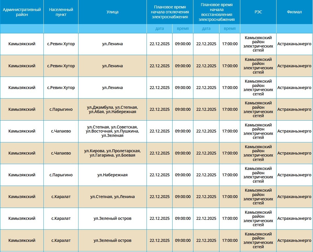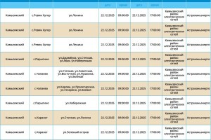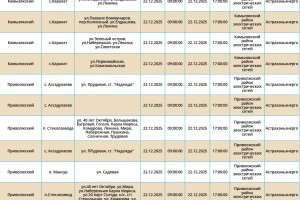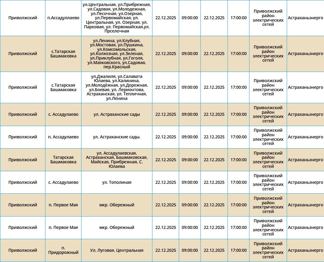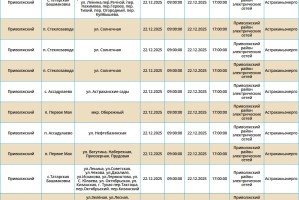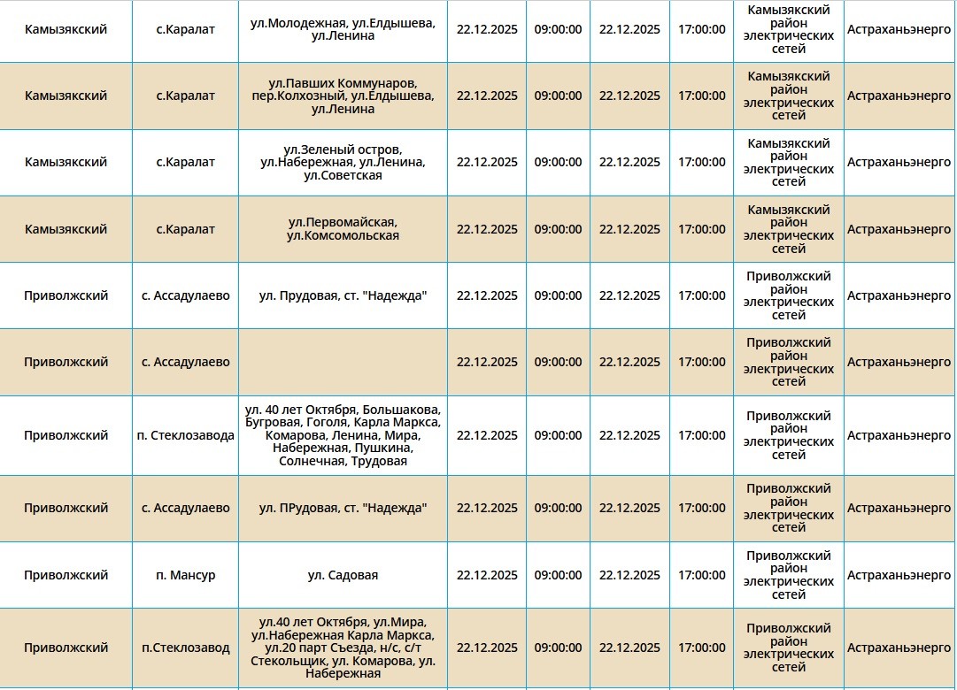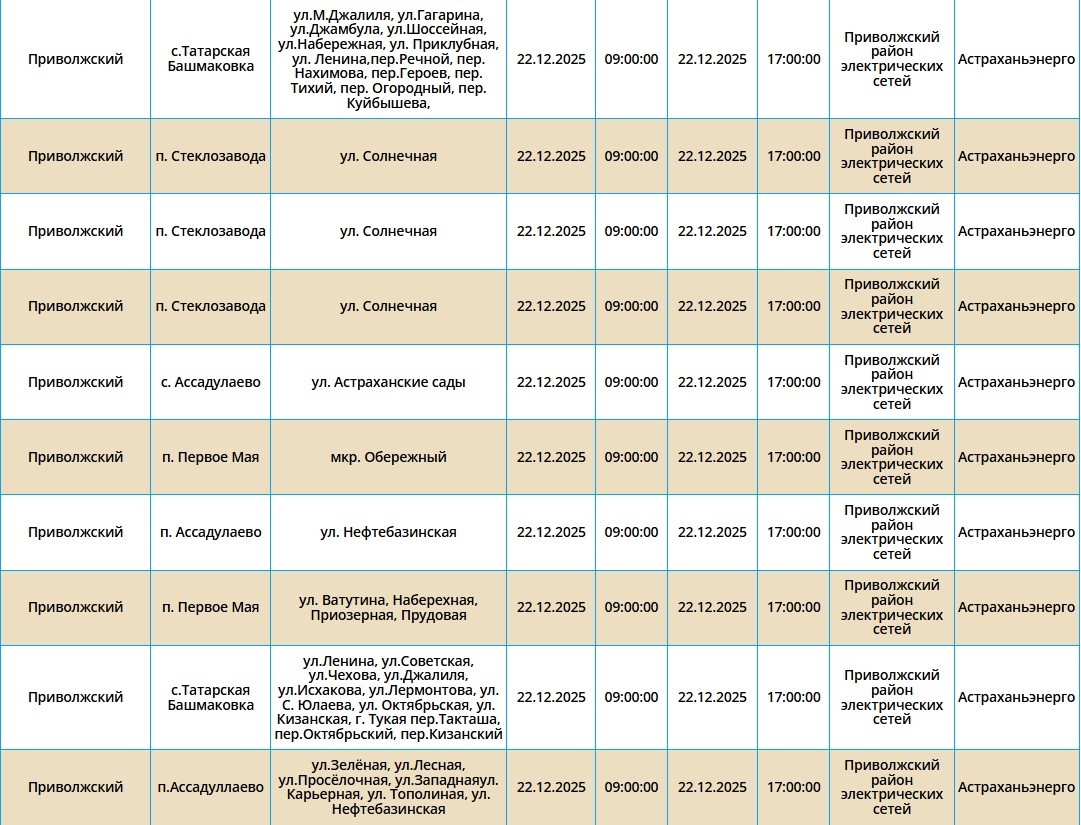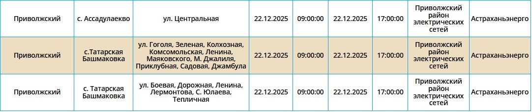 22 декабря в нескольких селах Астраханской области пройдут плановые отключения света. В частности они затронут жителей Приволжского и Камызякского районов. Так, без электроэнергии останутся следующие села и поселки: Ассадулаево, Каралат, Мансур, Парагдино, Первая Пятилетка, Первое Мая, Парыгино, Придорожный, Ревин Хутор, Стеклозавода, Чапаево, Татарская Башмаковка. С подробным списком улиц, на которых пройдут отключения можно ознакомиться в галерее ниже: Напоминаем, что оперативную информацию о проблемах с электроэнергией, водой и другими коммунальными услугами проще всего отслеживать на интерактивной городской карте. Если же сбои случились неожиданно, сообщайте по приведенным далее контактным телефонам: