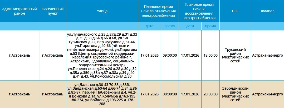 Подобные меры принимаются в рамках общего плана технического обслуживания сети и направлены на повышение уровня стабильности энергоснабжения в регионе. В условиях роста энергопотребления и увеличения нагрузки на инфраструктуру особое внимание уделяется регулярному техническому обслуживанию линий электропередач и трансформаторных станций, сообщают сотрудники ПАО «Россети Юг». Таким образом, временные отключения электричества в эту субботу затронут жителей города Астрахани. Полный список адресов вы можете посмотреть на фото ниже: А все важные сведения о текущих коммунальных неполадках нашего города представлены на специальной интерактивной карте. Она своевременно обновляется информацией о сбоях электроснабжения, водоснабжения и прочих бытовых затруднениях. Если возникают незапланированные отключения, можно обращаться по указанным контактным телефонам: