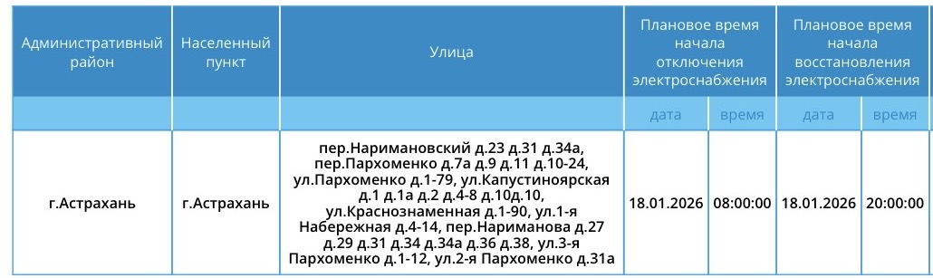 По данным пресс-службы ПАО «Россети Юг», в воскресенье тысячи астраханцев останутся без электроэнергии. Пройдут отключения исключительно в областном центре. Света не будет в жилых домах с 08:00 до 20:00. Полный список актуальных адресов представлен ниже: А все важные сведения о текущих коммунальных неполадках нашего города представлены на специальной интерактивной карте. Она своевременно обновляется информацией о сбоях электроснабжения, водоснабжения и прочих бытовых затруднениях. Если возникают незапланированные отключения, можно обращаться по указанным контактным телефонам: