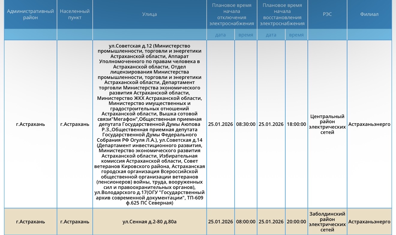В пресс-службе ПАО «Россети Юг» сообщили о плановых работах на электросетях. Из-за этого астраханцы останутся без света. Так, отключения затронут некоторые министерства и департаменты, вышку сотовой связи, жилые дома. Начнутся работы с 08:00, некоторые из них завершатся к 18:00, другая часть - к 20:00. Подробнее ниже: А информацию обо всех коммунальных проблемах нашего города вы можете найти на этой карте. Здесь, в режиме реального времени, вы можете наблюдать за отключениями света, воды и т.д. Если возникли незапланированные отключения, можно обращаться по указанным контактным телефонам: