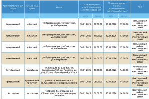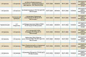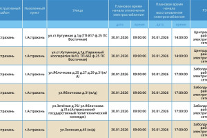 Завтра, 30 января, на территории Астраханской области пройдут плановые отключения электричества. Об этом сообщили в пресс-службе ПАО «Россети Юг». Света не будет в Камызякском, Ахтубинском и Приволжском районах области. Без электроэнергии останутся и жители Астрахани. Отключения затронут квартиры и дома, гаражи, столовую, колледж, травматологический центр и ресторан. Подробнее в галерее ниже: А информацию обо всех коммунальных проблемах нашего города вы можете найти на этой карте. Здесь, в режиме реального времени, вы можете наблюдать за отключениями света, воды и т.д. Если возникли незапланированные отключения, можно обращаться по указанным контактным телефонам: