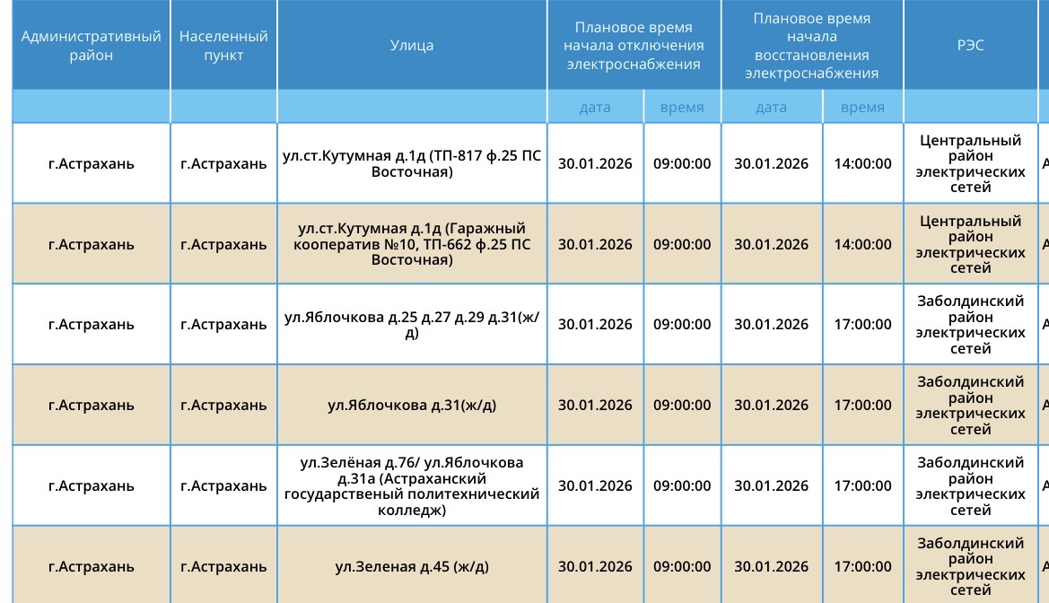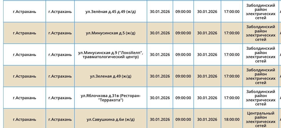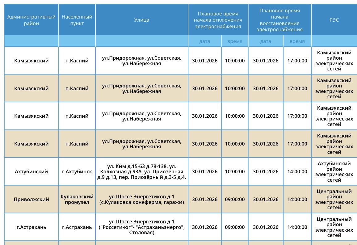 Завтра, 30 января, на территории Астраханской области пройдут плановые отключения электричества. Об этом сообщили в пресс-службе ПАО «Россети Юг». Света не будет в Камызякском, Ахтубинском и Приволжском районах области. Без электроэнергии останутся и жители Астрахани. Отключения затронут квартиры и дома, гаражи, столовую, колледж, травматологический центр и ресторан. Подробнее в галерее ниже: А информацию обо всех коммунальных проблемах нашего города вы можете найти на этой карте. Здесь, в режиме реального времени, вы можете наблюдать за отключениями света, воды и т.д. Если возникли незапланированные отключения, можно обращаться по указанным контактным телефонам: