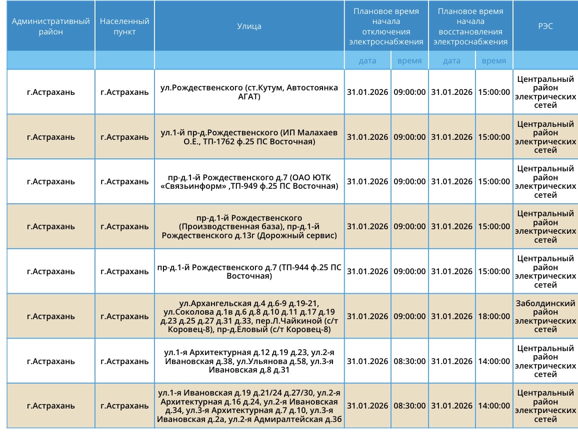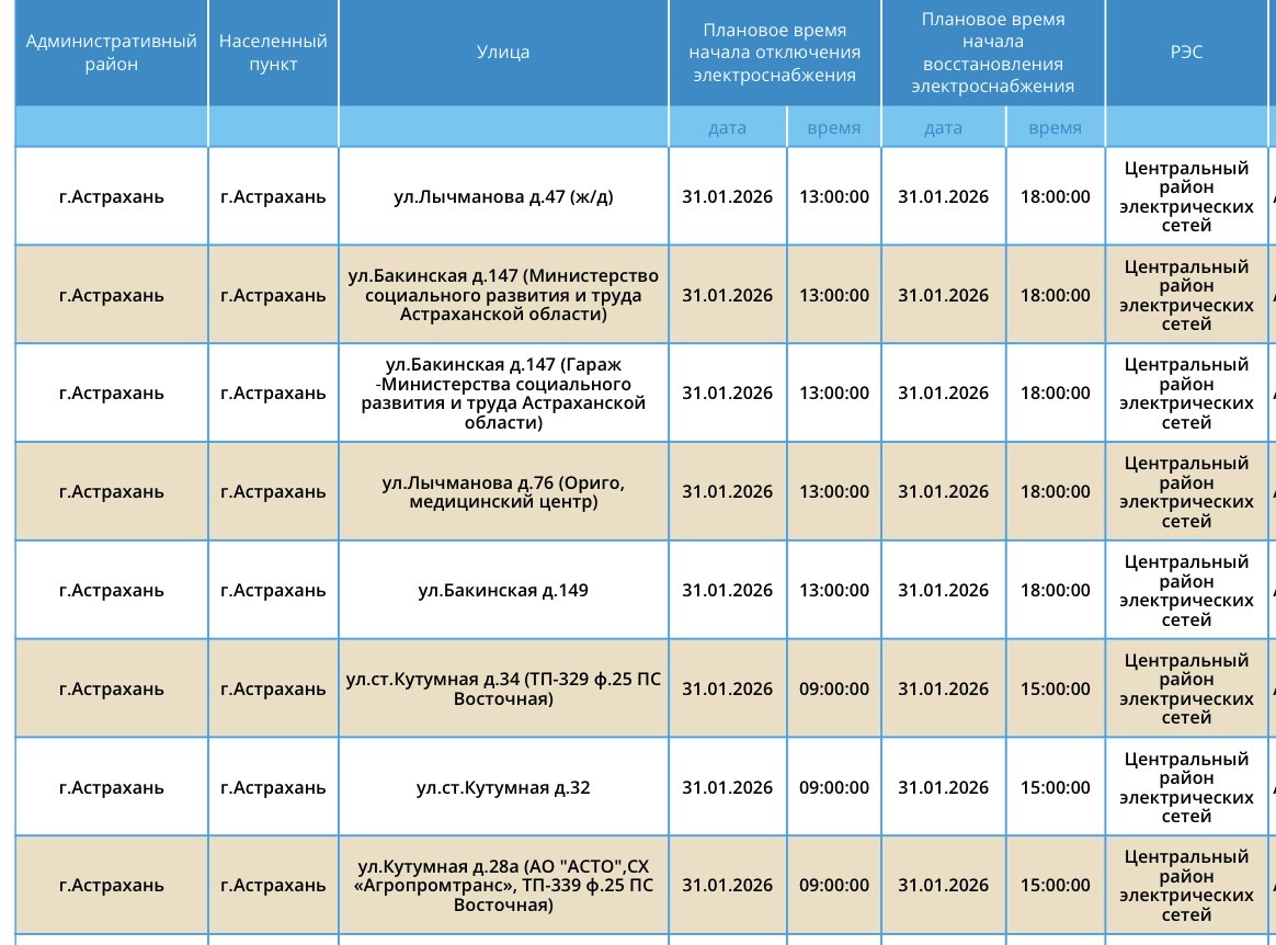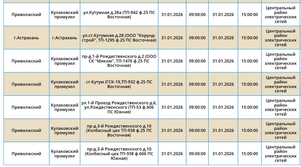 По информации сотрудников ПАО «Россети Юг», в субботу астраханцев ждут новые отключения света. Пройдут они из-за плановых работ на электросетях. Так, электроэнергии не будет в областном центре, а также в Приволжском районе региона. Отключения затронут жилые дома, здание министерства, автостоянку, организации и многое другое. Подробности ниже: А информацию обо всех коммунальных проблемах нашего города вы можете найти на этой карте. Здесь, в режиме реального времени, вы можете наблюдать за отключениями света, воды и т.д. Если возникли незапланированные отключения, можно обращаться по указанным контактным телефонам: