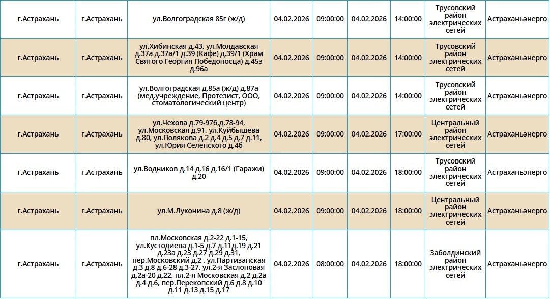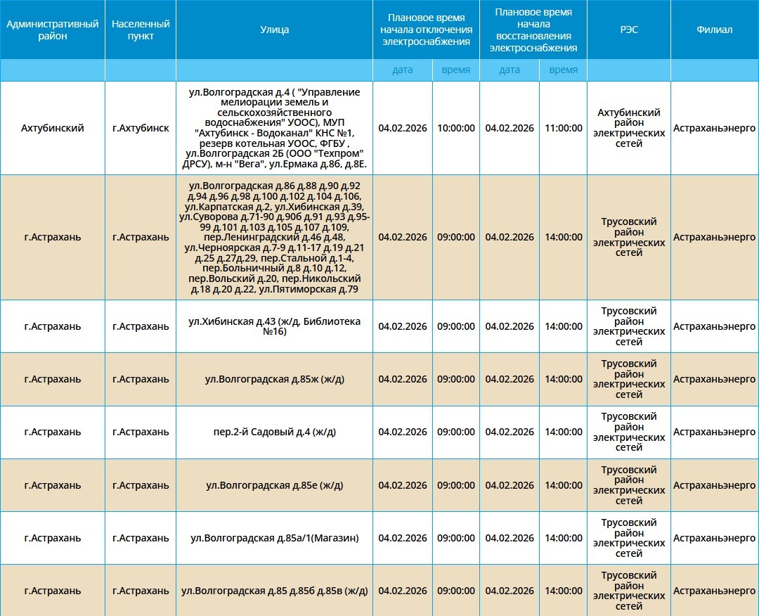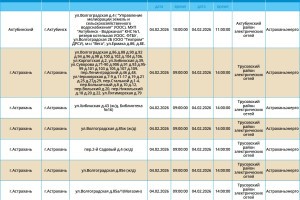 Энергетики сообщают, что в среду продолжатся профилактические работы на электросетях, в связи с чем запланированы отключения электроэнергии в городе Астрахань и в городе Ахтубинск. Конечно, отключения затронут не все улицы. Так, без света останутся некоторые жители Трусовского района, а также центральной части областного центра. Также некоторые ахтубинцы на 1 час останутся без электричества. Подробнее с адресами и временем отсутствия электроснабжения можно ознакомиться в галерее ниже: А информацию обо всех коммунальных проблемах нашего города вы можете найти здесь. На этом сайте, в режиме реального времени, вы можете наблюдать за отключениями света, воды и т.д. Если отключения произошли внепланово, звоните по телефонам, которые указаны ниже: