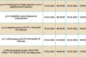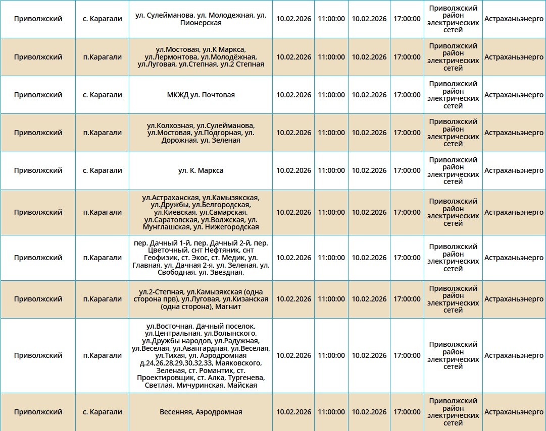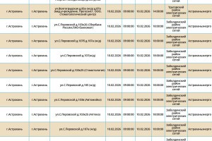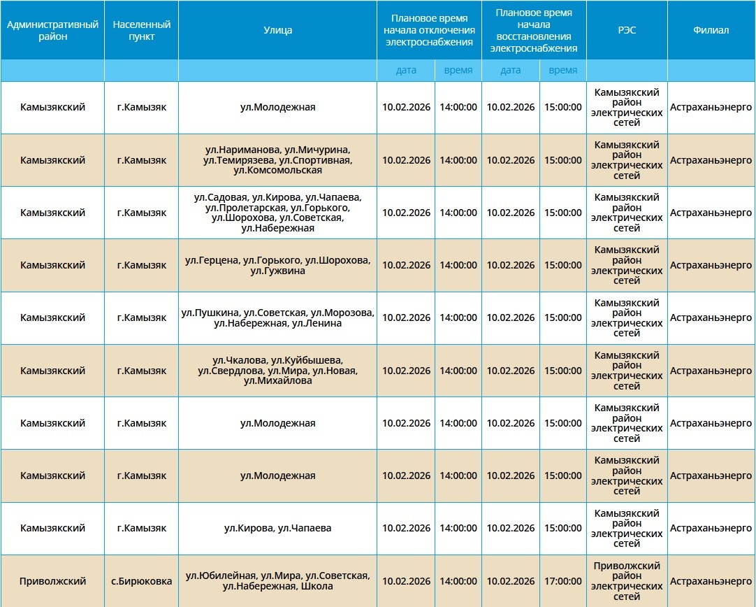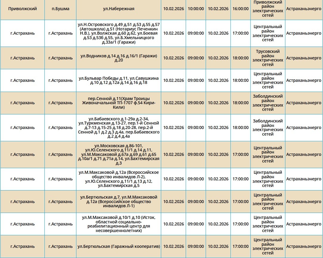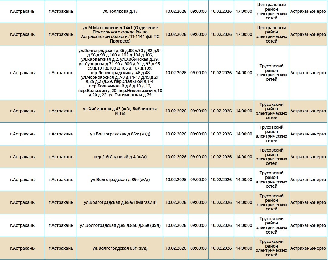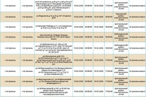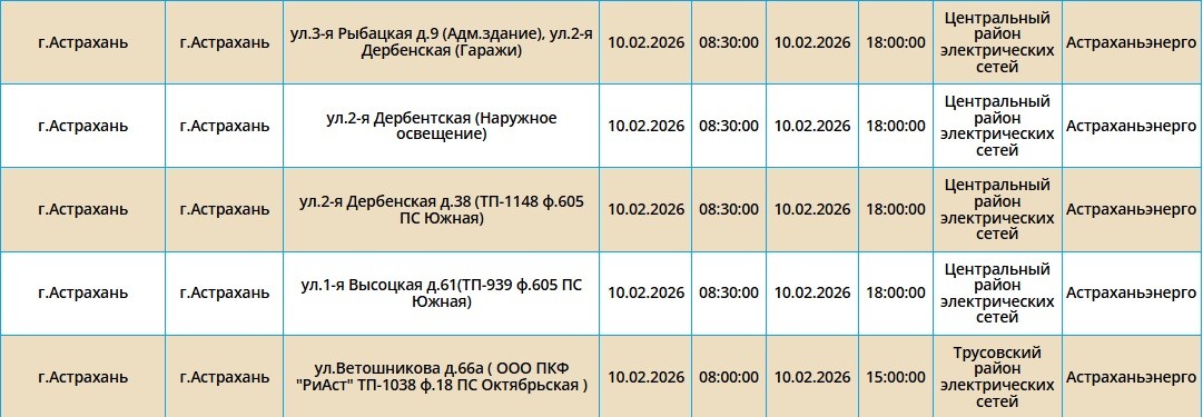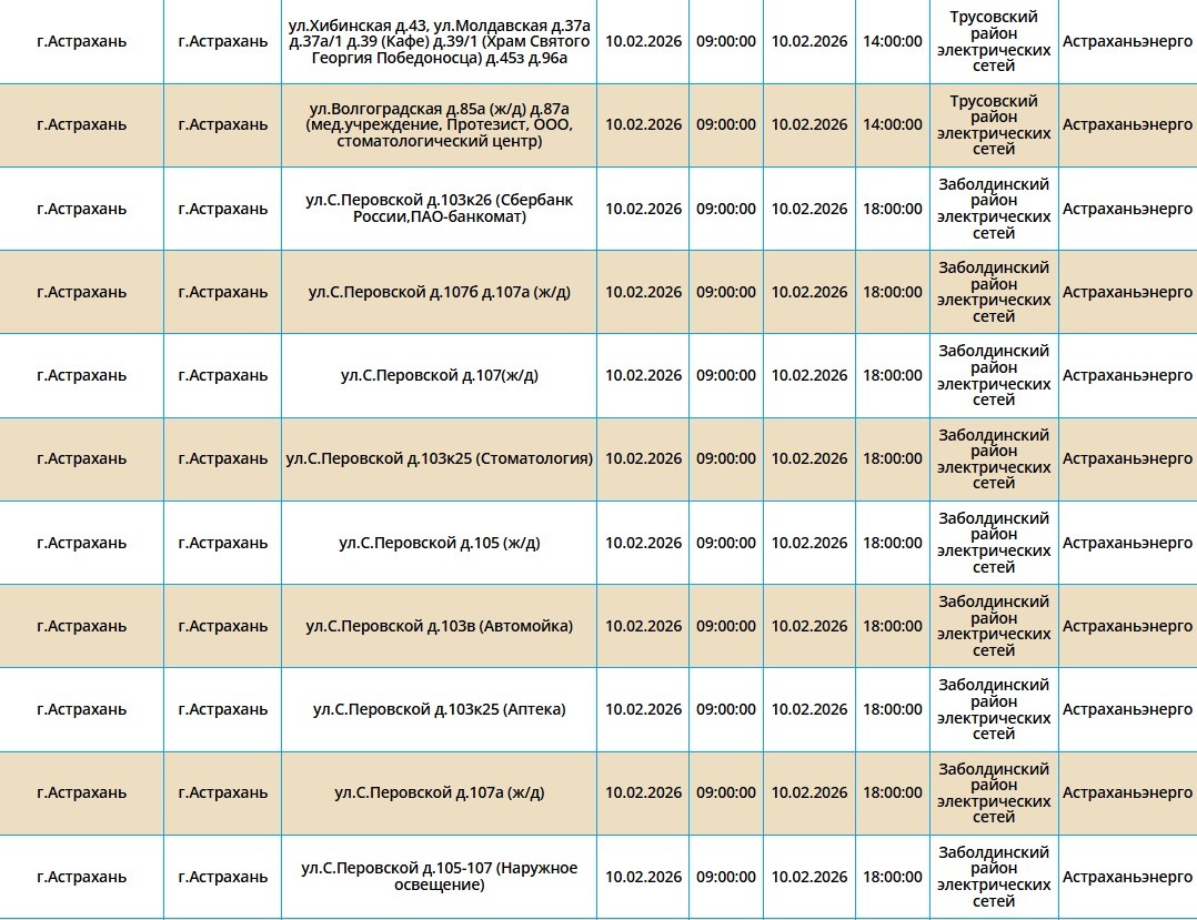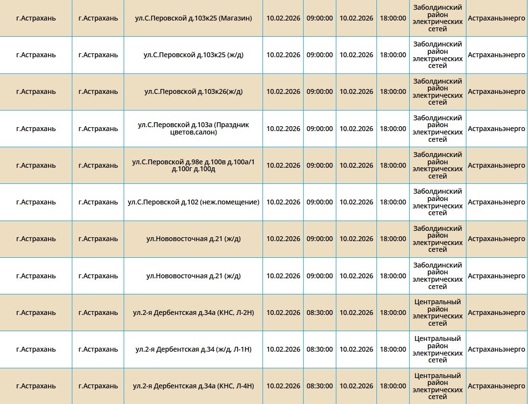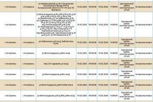 Завтра в Астраханской области вновь пройдут плановые отключения электроэнергии. Так, без света останутся жители областного центра, а также двух районов области. 10 февраля ряд потребителей электроэнергии в городе Астрахань, а также в Приволжском и Камызякском районах столкнутся с временными отключениями. Без света останутся сотни жилых домов, административные здания и гаражные кооперативы. Подробнее со списком отключений можно ознакомиться в галерее ниже: Напоминаем, что оперативную информацию о проблемах с электроэнергией, водой и другими коммунальными услугами проще всего отслеживать на интерактивной городской карте. Если же сбои случились неожиданно, сообщайте по приведенным далее контактным телефонам: