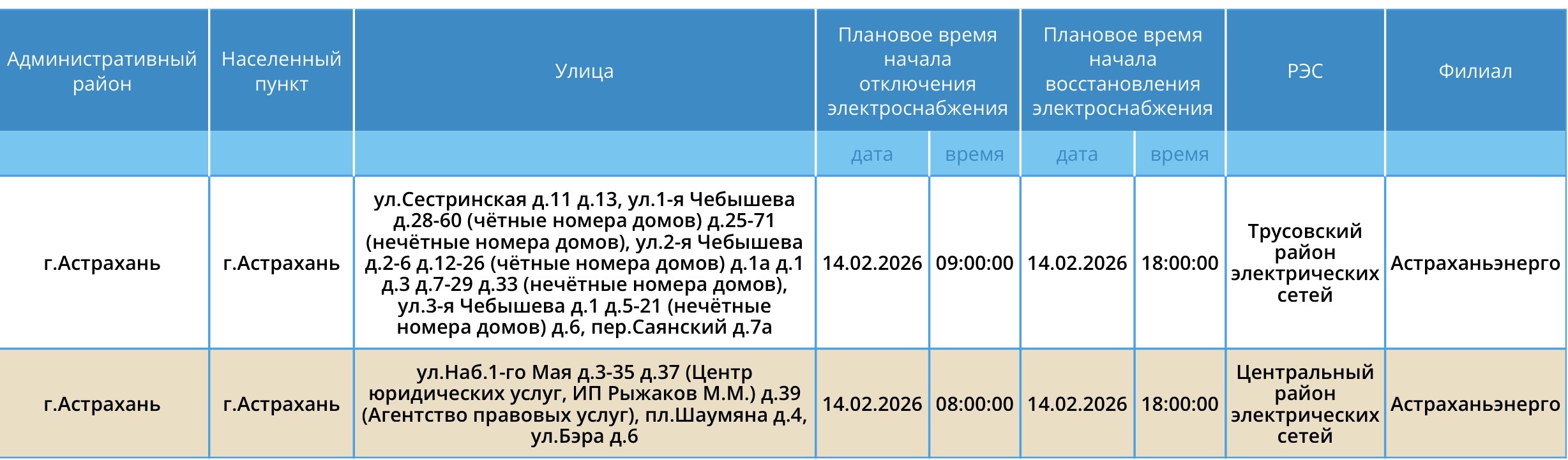 Завтра, в День всех влюбленных, в Астраханской области вновь пройдут плановые отключения электроэнергии. Мера временная и необходимая для своевременного ремонта на электросетях. Так, без света останутся жители центральной части областного центра, а также Трусовского района. Самые ранние отключения начнутся в 08:00. Подробнее на фото: Удобнее всего следить за актуальной информацией о перебоях с электричеством, водоснабжением и прочими бытовыми неудобствами на интерактивной карте города.