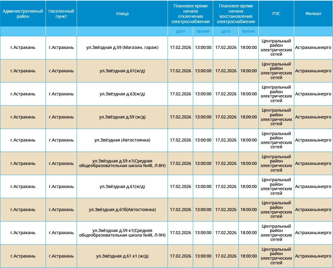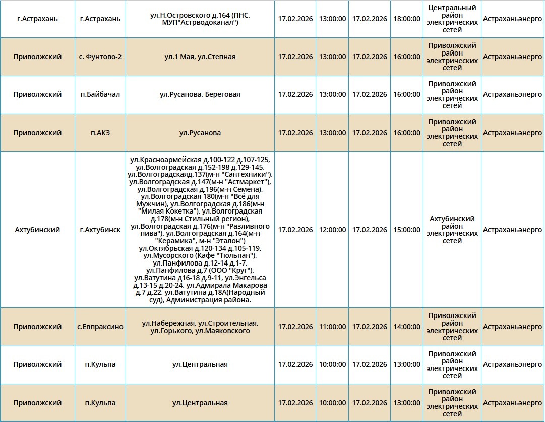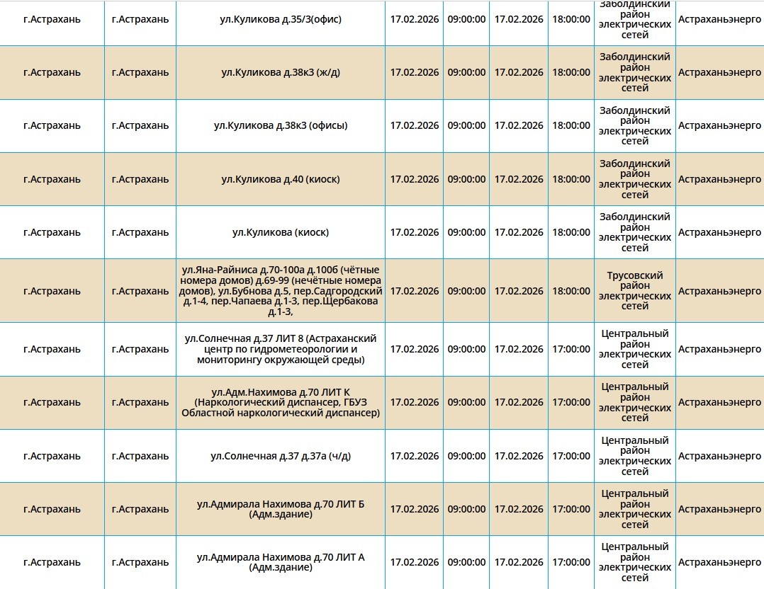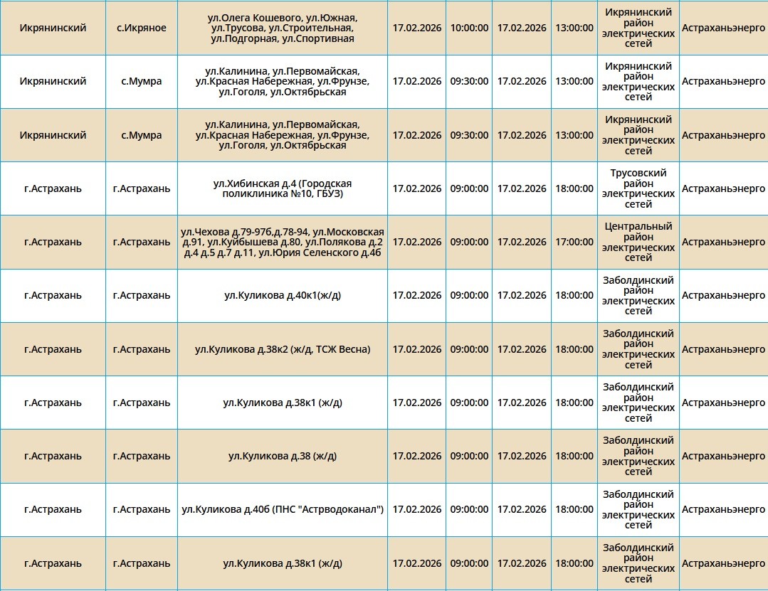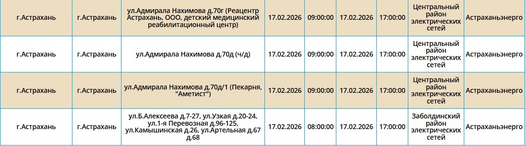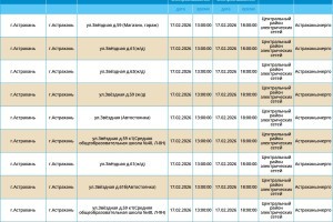 Завтра на территории города Астрахань и области пройдут плановые работы на электросетях, в связи с чем тысячи абонентов останутся без электроэнергии. Так, отключения затронут в частности жителей областного центра, а также Икрянинского, Ахтубинского и Приволжского районов. Без света останутся школа, поликлиника и пекарня. Подробнее со списком отключений можно ознакомиться ниже: Удобнее всего следить за актуальной информацией о перебоях с электричеством, водоснабжением и прочими бытовыми неудобствами на интерактивной карте города. Если отключения произошли внепланово, звоните по телефонам, которые указаны ниже: