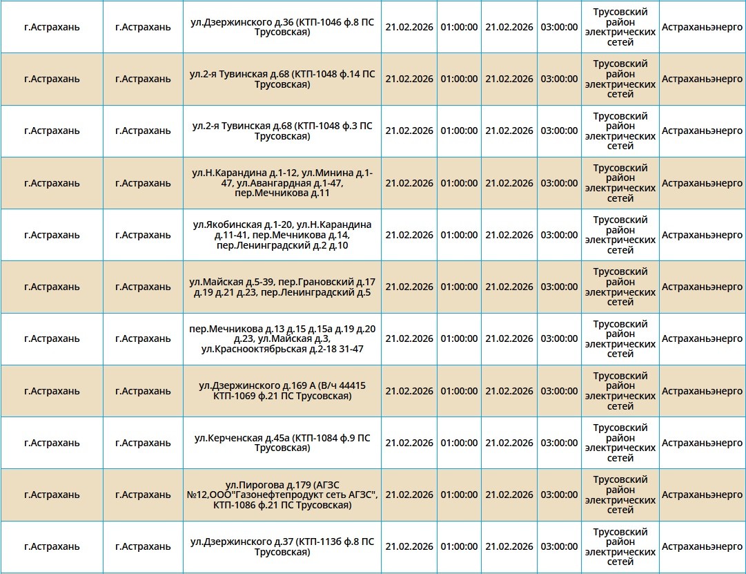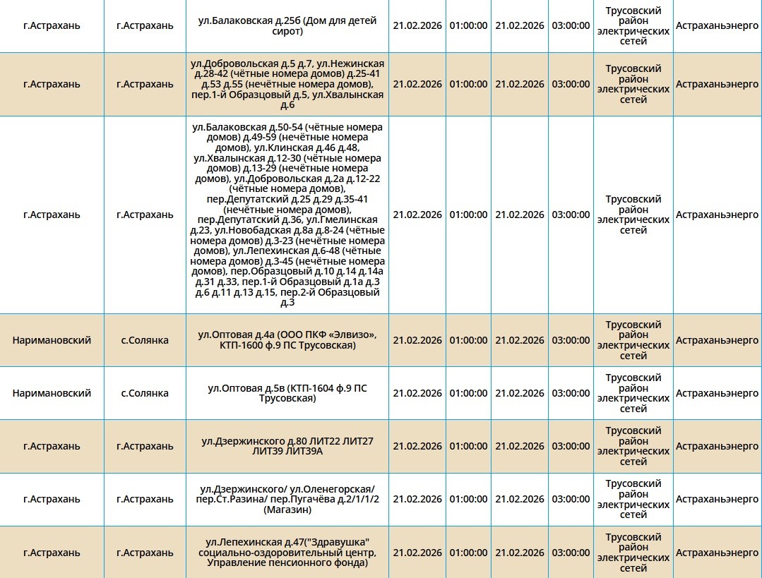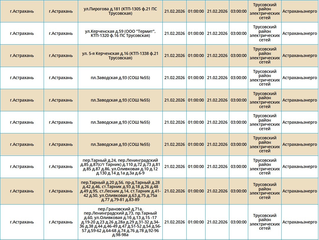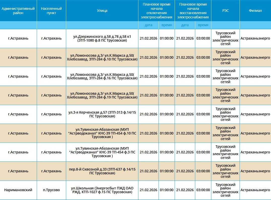 Завтра без электроэнергии останутся тысячи жилых домов, школы, детские сады, торговые центры и медицинские учреждения. Электроэнергию отключат как жителям города Астрахань, так и Наримановского района. Самые ранние отключения начнутся уже ночью, в 01:00. В это время сотрудники ПАО «Россети Юг» будут проводить плановые ремонтные работы на электросетях. Некоторые отключения мы опубликовали в галерее ниже, полный список адресов смотрите по этой ссылке. Все важные сведения о текущих коммунальных неполадках нашего города представлены на специальной интерактивной карте. Она своевременно обновляется информацией о сбоях электроснабжения, водоснабжения и прочих бытовых затруднениях. Если возникли незапланированные отключения, обращайтесь по указанным номерам телефонов: