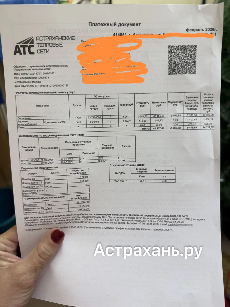 В 2026 году в Астраханской области, впрочем, как и по всей России, выросла стоимость коммунальных услуг. Все чаще местным жителям стали приходить платежные документы со странными ценами. И мы знаем, в чем причина. В редакцию нашего издания стали все чаще обращаться горожане и сообщения о неподъемных суммах в платежках. По информации жителей улицы Карла Маркса, ежемесячно теплоноситель дорожает на одну тысячу рублей. «С ноября по февраль, получается, у нас росли цены в платежках на тысячу рублей, вместо 890 рублей стало практически 6 тысяч рублей. Это настоящий ужас, нет слов. Говорили, что цены связаны с похолоданием в городе. Настолько? Я не верю», - рассказала Анастасия П. С аналогичной проблемой зимой столкнулись жители улиц Набережная Приволжского затона, Сен-Симона, Власова, Яблочкова, Николая Островского. «У меня за всю зиму подорожало отопление на 2 тысячи рублей. И это при том, что официально оно выросло только на 2%. Да, зима была холодная, но, вопрос: что будет дальше, после летнего подорожания ЖКУ? Я вообще разорюсь, а работаю учителем. Откуда мне по 5 тысяч брать каждый месяц за тепло. У сына газовый котел, хорошие цены и регулировка из дома», - жалуется Олеся Ш. Но не везде стоимость услуг возросла. Поэтому астраханцы в первую очередь жалуются на работу управляющих компаний, мол, это они неверно передают показания. Но в УК поспешили снять с себя всю ответственность. «Управляющие компании не считают плату за отопление, суммы рассчитывают исключительно «Астраханские тепловые сети». Единственное, что УК следят за приборами учета тепловой энергии в домах. По ним до 25 числа передают показания, они уже сами рассчитывают жителям оплату. А если прибор учета не работает, то ресурсники рассчитывают плату по отоплению», - уверены в одной из местных УК. Редакция Астрахань.ру обратилась в ООО «Астраханские тепловые сети» за комментарием. Там нам рассказали, что с начала года тариф по основным тепловым источникам вырос на 2%, что соответствует повышению НДС в России с 01.01.2026. Кроме того, специалисты напомнили о том, что на стоимость услуг отопления для потребителей, помимо тарифа, влияет ряд факторов: Погодные условия: чем холоднее на улице, тем больше тепла нужно для обогрева, и тем выше расход (если есть счетчики). Энергоэффективность дома: утепление фасадов, окон и стен снижает теплопотери, уменьшая расходы. Настройка системы отопления: правильная балансировка и автоматизация внутридомовой системы предотвращают перетопы и перерасход тепла, снижая счета. Исправность общедомового прибора учета (ОДПУ). Следить за его исправностью - обязанность УК. Нерегулярная или несвоевременная передача показаний приборов учета также может привести к большим суммам в квитанции. Для правильного расчета и отображения текущих показаний необходимо провести сверку расчетов. «Выше перечислили основные факторы, которые влияют на стоимость услуг. Однако рекомендуем с каждым конкретным случаем разбираться предметно, а также не допускать образования задолженности», - указали в АТС. Опираясь на совокупность факторов, выходит, что ситуация и вправду может отличаться в домах в зависимости от приборов учета, энергоэффективности строения, а также настройки системы отопления. Также сегодня утром начала активно распространяться информация о начислении одной астраха