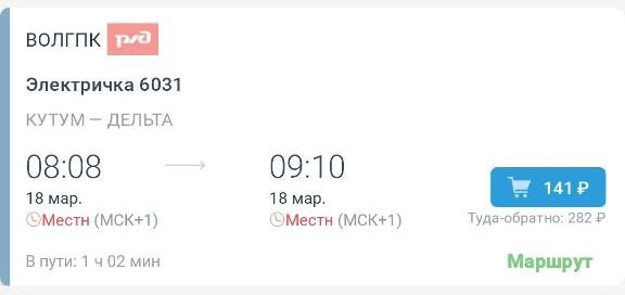С 15 марта в Астраханской области возобновляется движение пригородного электропоезда по сезонному «дачному» маршруту «Кутум - Дельта». Электричка будет работать по расписанию в дни повышенного спроса - по средам, субботам и воскресеньям. Расписание движения Маршрут «Кутум - Дельта»: отправление со станции «Кутум» - 08:08 остановка на станции «Астрахань-1» - 08:21 прибытие на станцию «Дельта» - 09:10 Обратный маршрут «Дельта - Кутум»: отправление со станции «Дельта» - 16:58 остановка на станции «Астрахань-1» - 17:45 прибытие на станцию «Кутум» - 18:02 Стоимость проезда в одну сторону, по данным приложения «РЖД Пассажирам» составляет 141 рубль. Пригородный поезд № 6031/6032 традиционно запускают в период начала дачного сезона, чтобы жителям было удобнее добираться до садовых участков и обратно в город.
