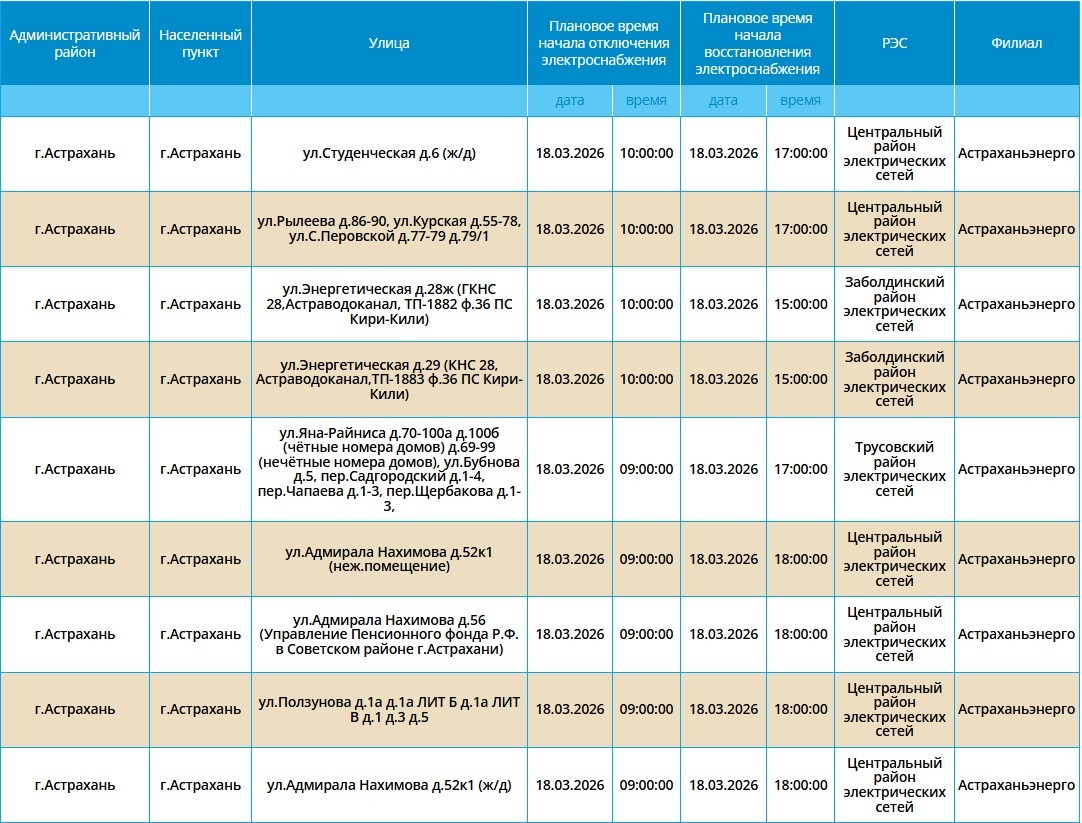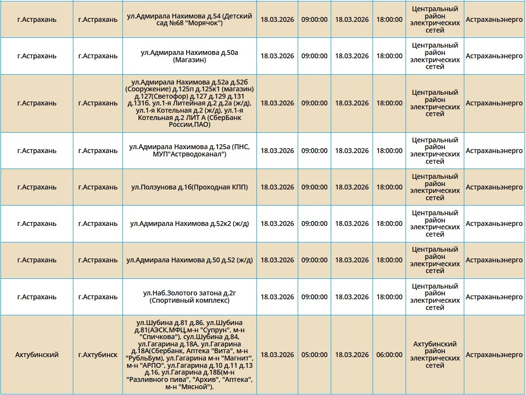 Завтра в городах Астрахань и Ахтубинск пройдут плановые отключения электроэнергии. И если в Ахтубинске некоторые горожане останутся без света всего на час, то в Астрахани самые долгие отключения продлятся около 9 часов. Однако энергетики просят астраханцев не беспокоится, отключения плановые и необходимые - в это время проводятся ремонтные работы на электросетях. С подробным списком адресов можно ознакомиться в галерее ниже: Напоминаем, что оперативную информацию о проблемах с электроэнергией, водой и другими коммунальными услугами проще всего отслеживать на интерактивной городской карте. Если же сбои случились неожиданно, сообщайте по приведенным далее контактным телефонам: