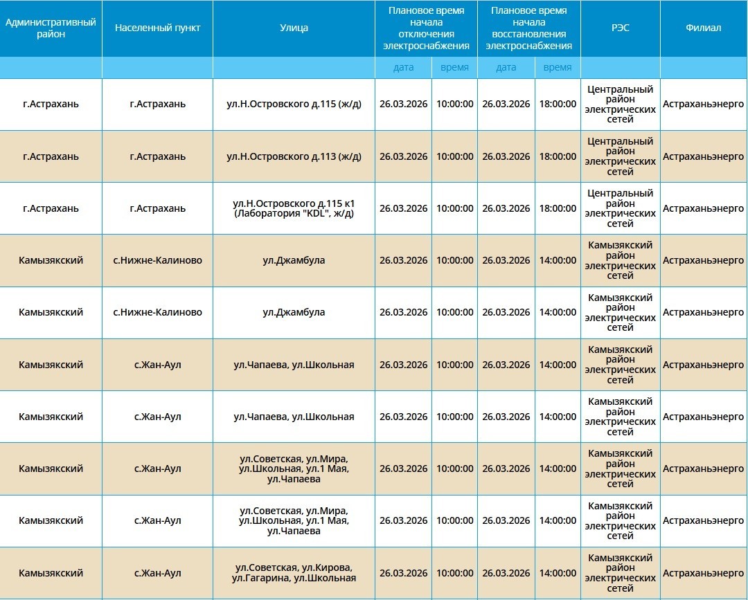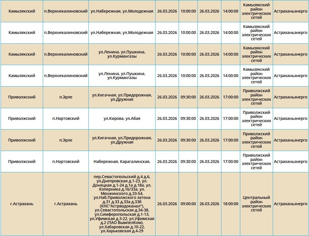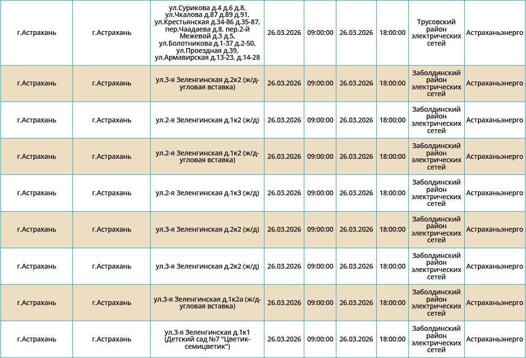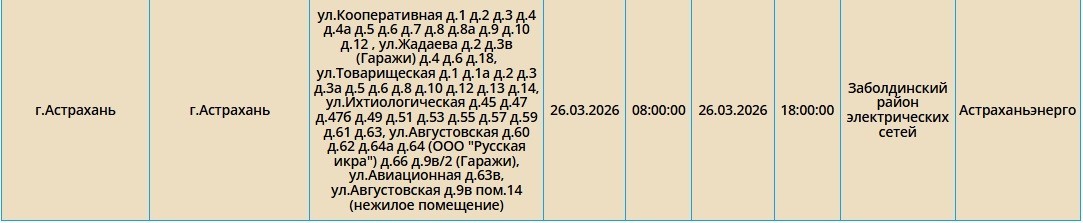 Завтра в городе Астрахань, а также в нескольких селах и поселках отключат электричество для проведения плановых ремонтных работ на сетях, сообщают сотрудники ПАО «Россети Юг». Так, без света, помимо жилых домов, останутся школа, несколько детских садов и медицинская лаборатория. Прекращение подачи энергии планируется как в областном центре, так и в Камызякском и Приволжском районах. Самые ранние отключения начнутся в 08:00, а полный список адресов смотрите в галерее ниже: А информацию обо всех коммунальных проблемах нашего города вы можете найти здесь. На этом сайте, в режиме реального времени, вы можете наблюдать за отключениями света, воды и т.д. Если отключения случились внепланово, звоните по телефонам, которые указаны на фото ниже: