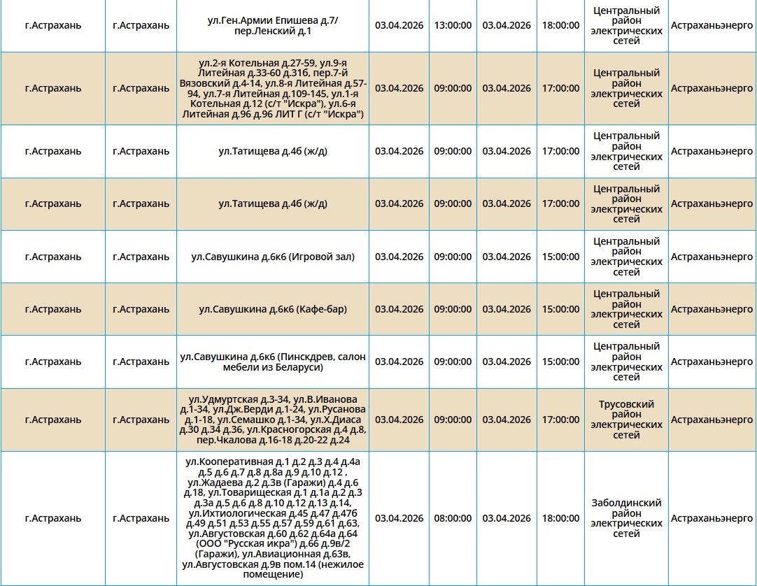 Завтра в Астрахани пройдут плановые отключения света, которые затронут несколько жилых домов в Трусовском и Ленинском районах. В Ленинском районе отключения начнутся в 08:00, а в Трусовском чуть позже, но всего на один час – в 09:00. Энергетики предупреждают: такие отключения временная, но весьма необходимая мера, чтобы провести плановое обслуживание электросетей. Подробный список адресов, по которым завтра не будет света, смотрите ниже: А информацию обо всех коммунальных проблемах нашего города вы можете найти на этой карте. Здесь, в режиме реального времени, вы можете наблюдать за отключениями света, воды и т.д. Если возникли незапланированные отключения, можно обращаться по указанным контактным телефонам: