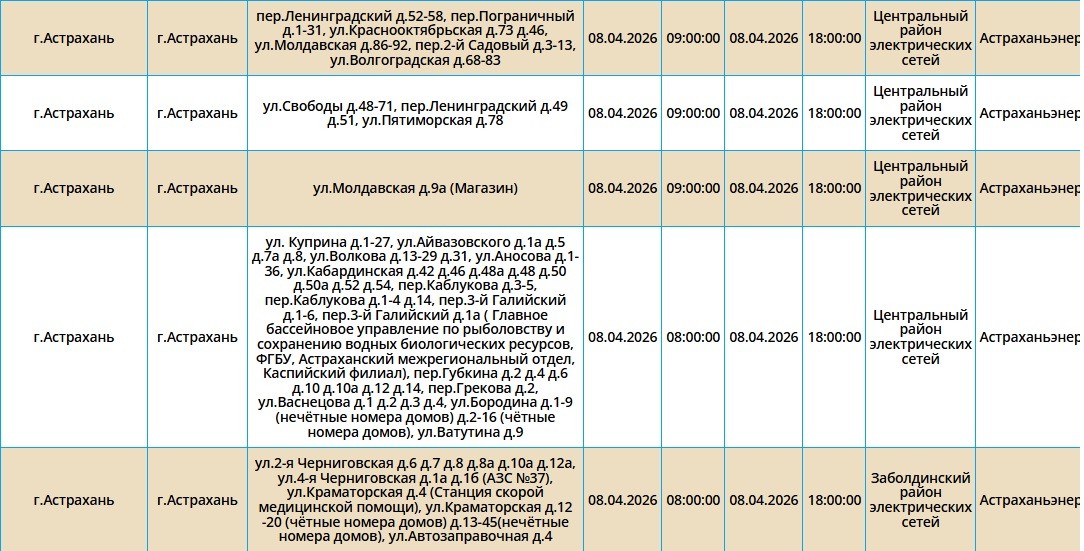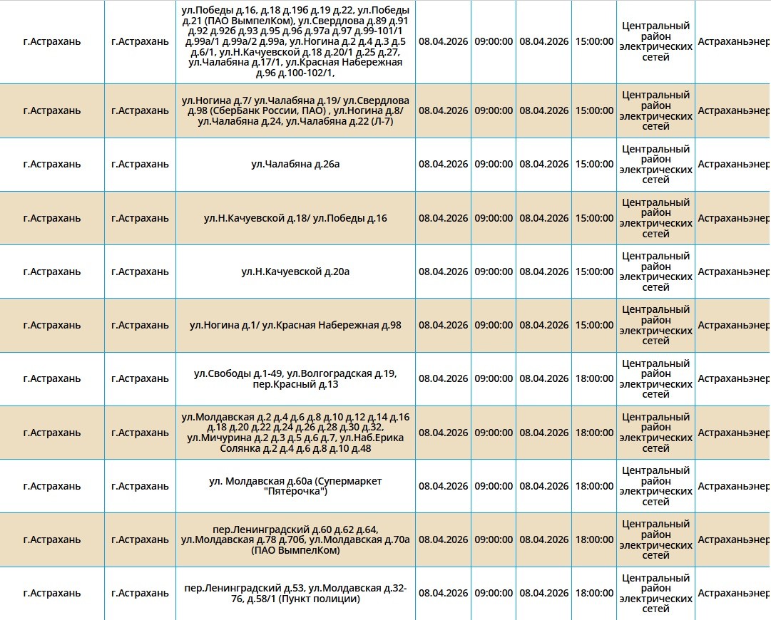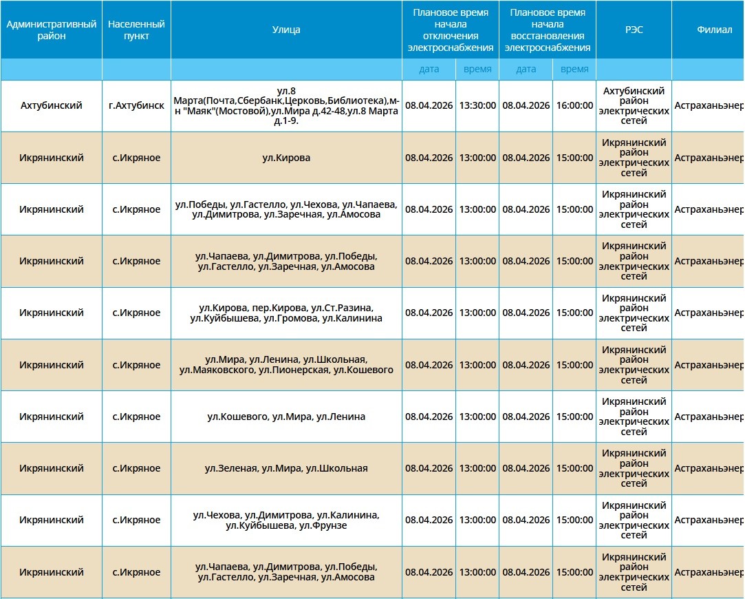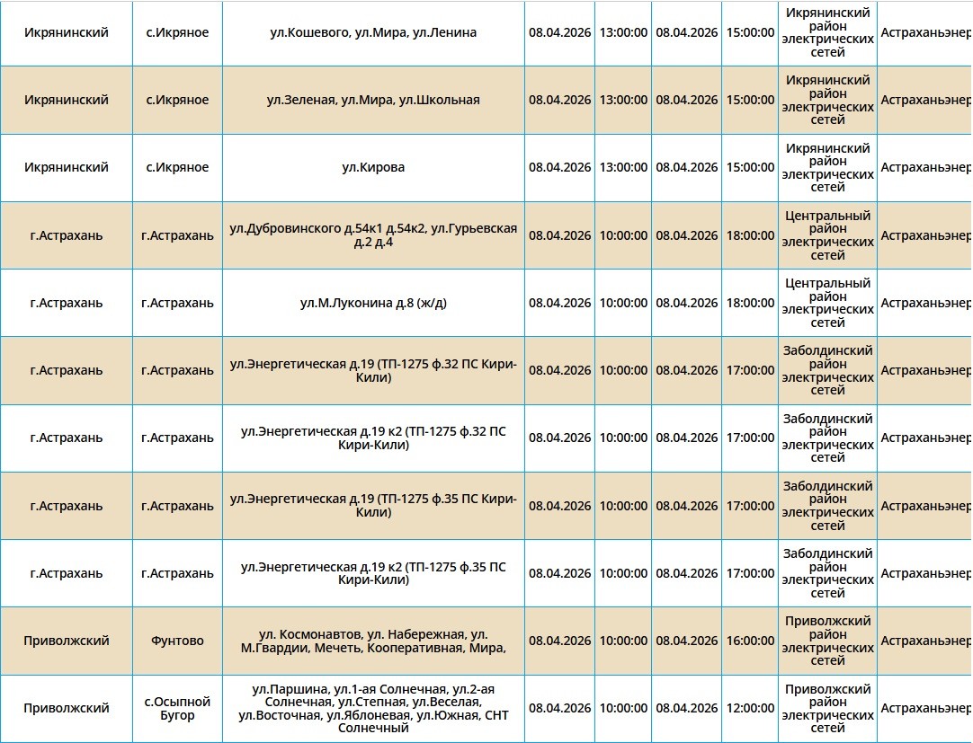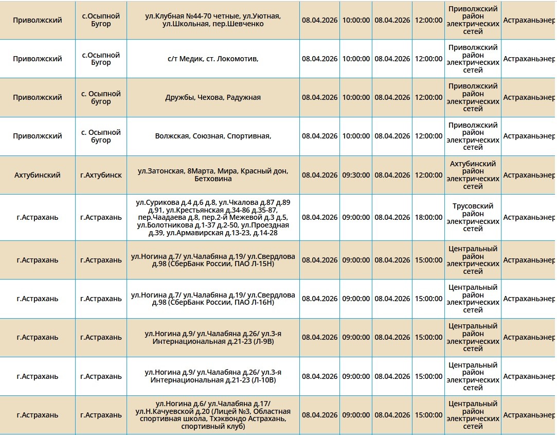 8 апреля в Астрахани, Ахтубинске и трех селах области отключат свет