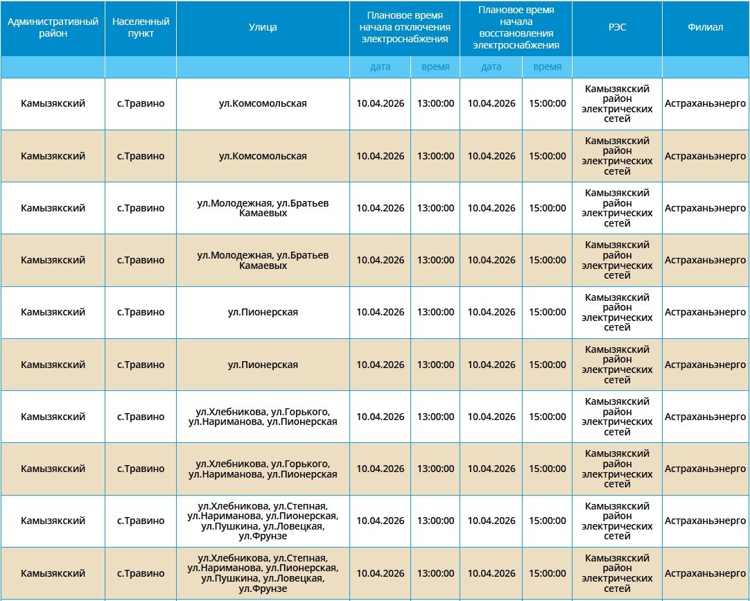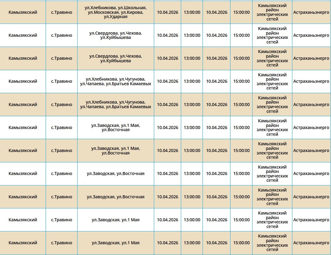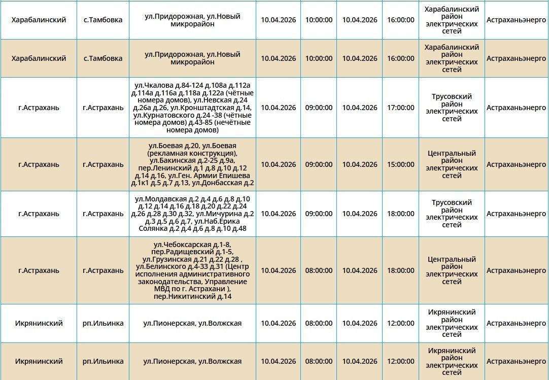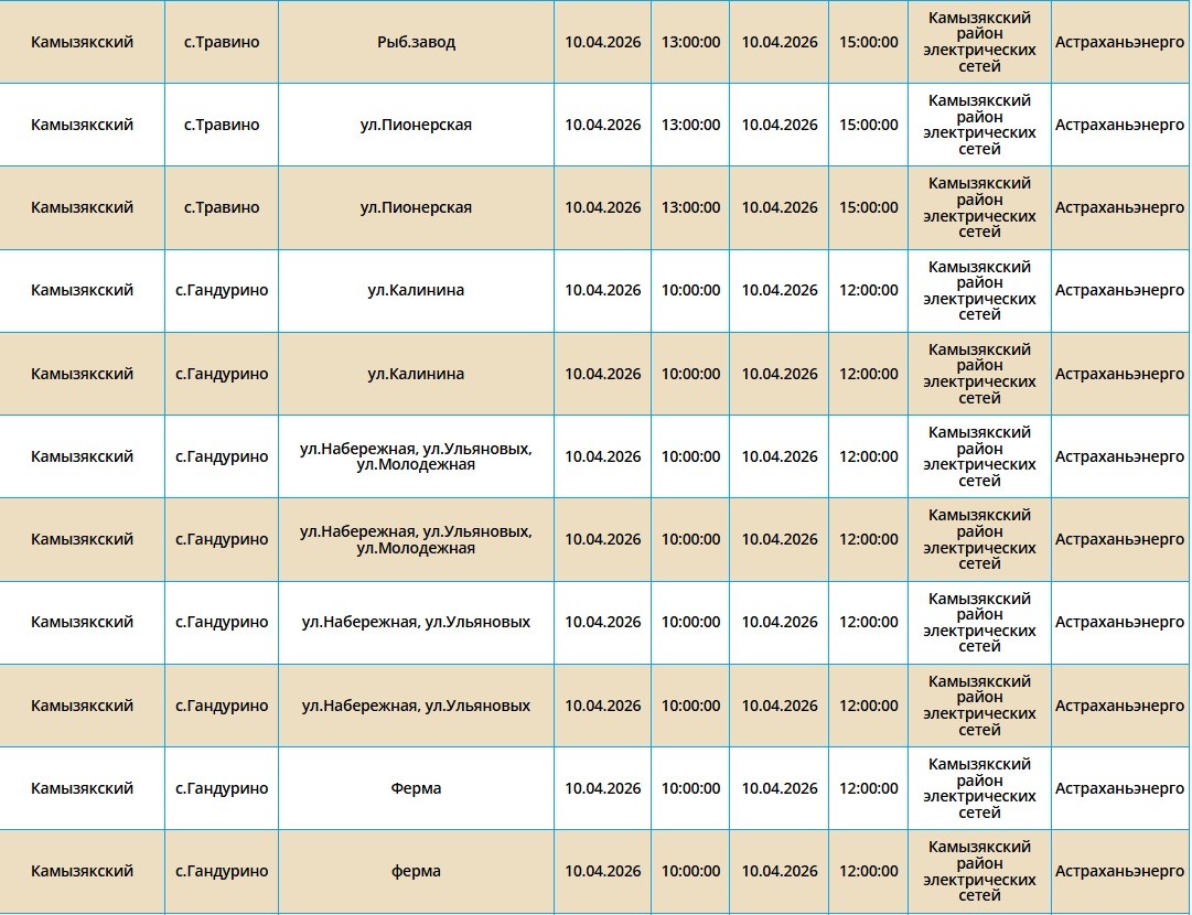 Завтра на территории города Астрахань и области пройдут плановые работы на электросетях, в связи с чем сотни абонентов останутся без электроэнергии. Так, отключения затронут в частности жителей областного центра, а также Камызякского и Икрянинского районов. Подробнее с адресами и временем отсутствия электроснабжения можно ознакомиться в галерее ниже: А информацию обо всех коммунальных проблемах нашего города вы можете найти здесь. На этом сайте, в режиме реального времени, вы можете наблюдать за отключениями света, воды и т.д. Если отключения произошли внепланово, звоните по телефонам, которые указаны ниже: