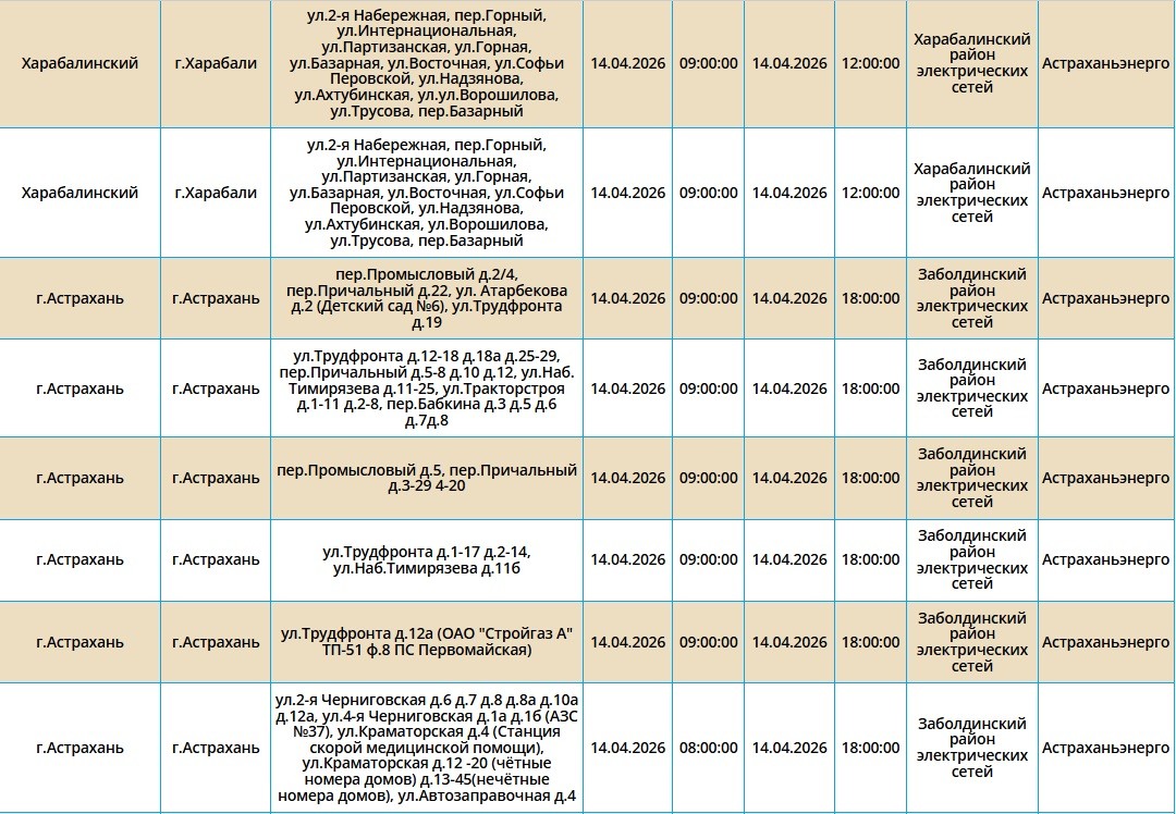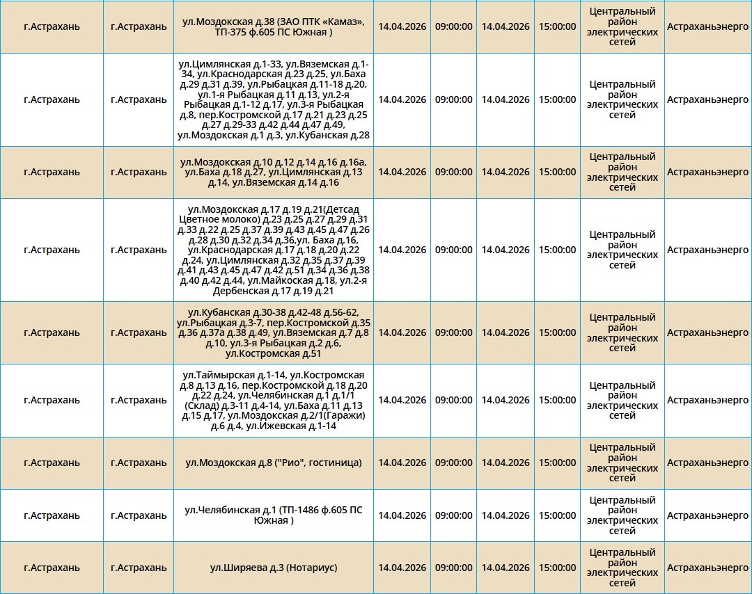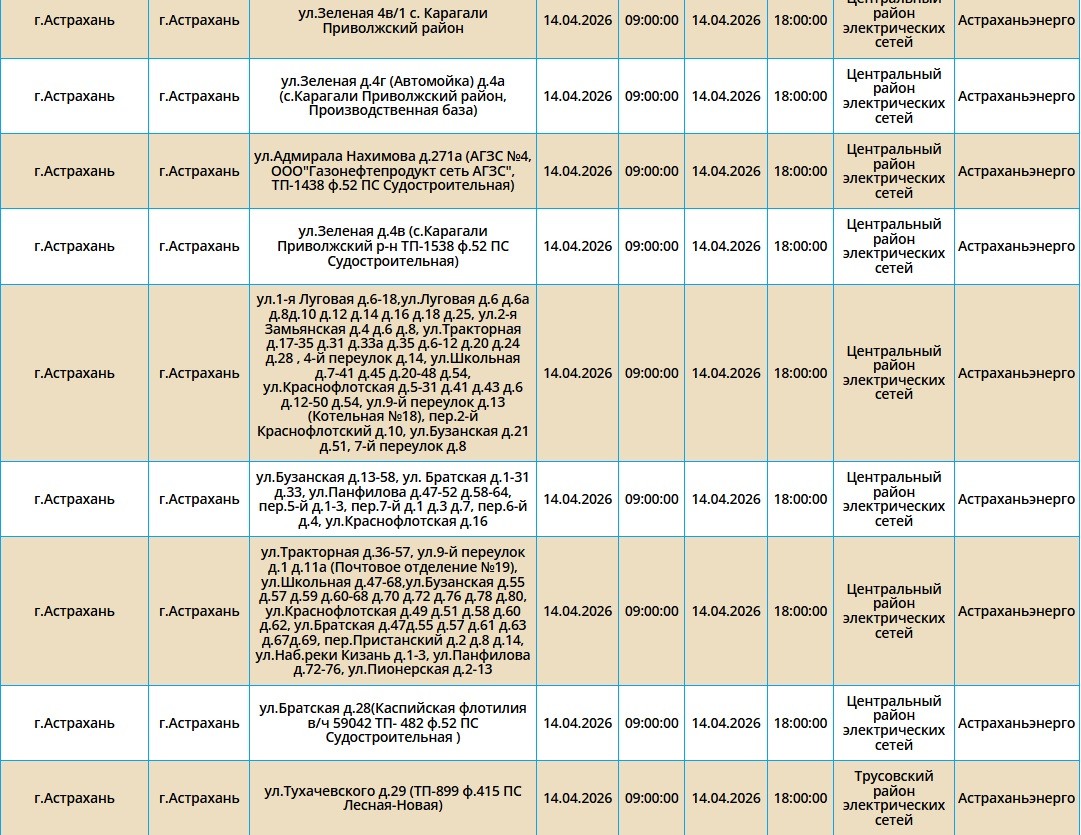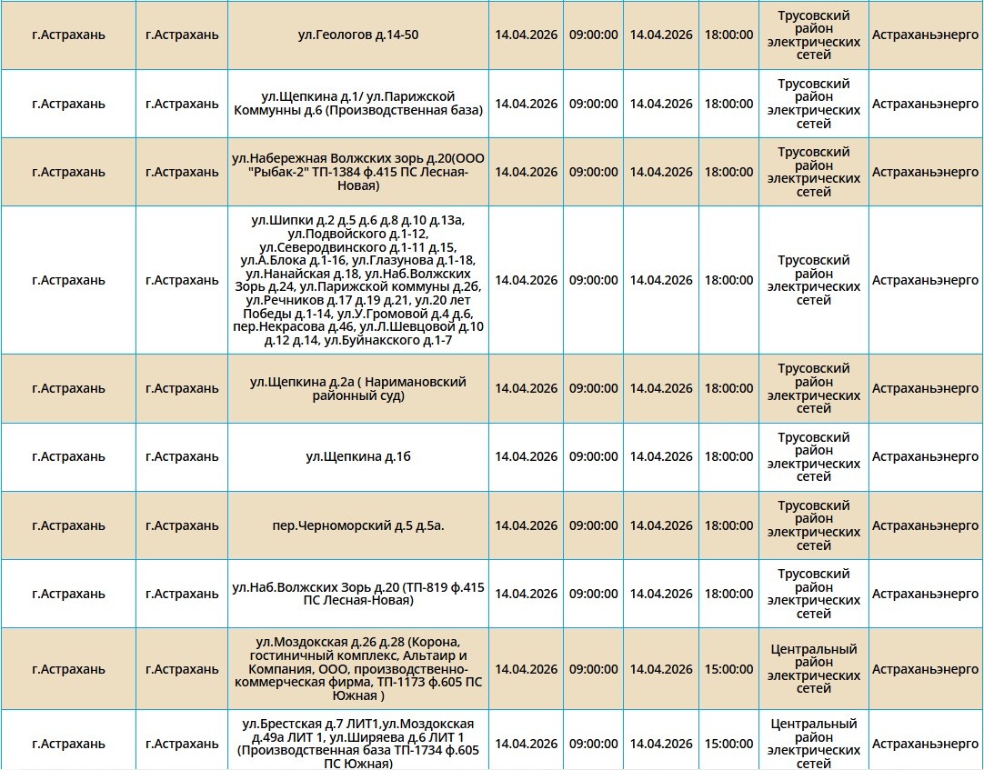 Плановые отключения электроэнергии состоятся завтра на территории Астраханской области, сообщила пресс-служба ПАО «Россети Юг». В список плановых работ на электросетях попали как областной центр, так и несколько улиц в Ахтубинском, Наримановском и Харабалинском районах. Первые отключения запланированы на 08:00, наиболее длительные займут примерно 10 часов. Поэтому астраханцам стоит заранее подготовится: зарядить все необходимые гаджеты и отключить ценную бытовую технику от сети питания. А полный список адресов, где завтра точно отключат свет, можно посмотреть в галерее ниже: Напоминаем, что оперативную информацию о проблемах с электроэнергией, водой и другими коммунальными услугами проще всего отслеживать на интерактивной городской карте. Если же сбои случились неожиданно, сообщайте по приведенным далее контактным телефонам: