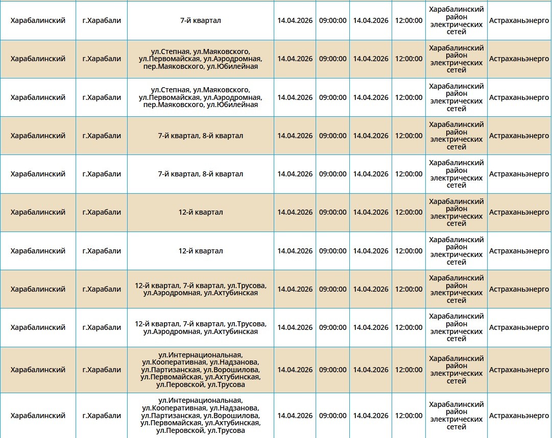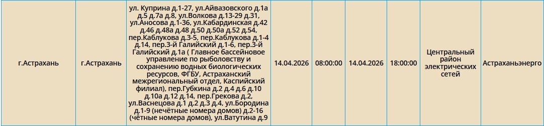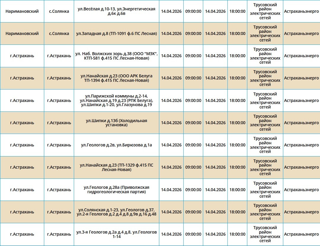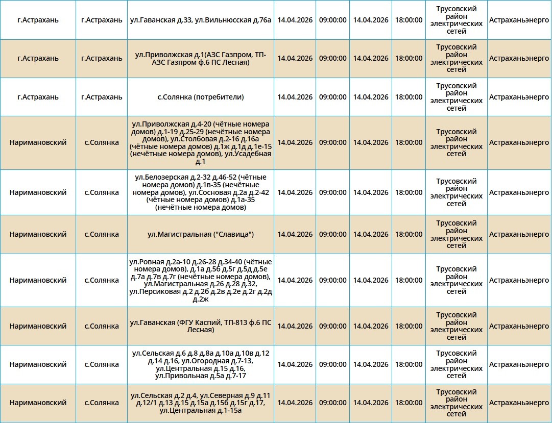 Плановые отключения электроэнергии состоятся завтра на территории Астраханской области, сообщила пресс-служба ПАО «Россети Юг». В список плановых работ на электросетях попали как областной центр, так и несколько улиц в Ахтубинском, Наримановском и Харабалинском районах. Первые отключения запланированы на 08:00, наиболее длительные займут примерно 10 часов. Поэтому астраханцам стоит заранее подготовится: зарядить все необходимые гаджеты и отключить ценную бытовую технику от сети питания. А полный список адресов, где завтра точно отключат свет, можно посмотреть в галерее ниже: Напоминаем, что оперативную информацию о проблемах с электроэнергией, водой и другими коммунальными услугами проще всего отслеживать на интерактивной городской карте. Если же сбои случились неожиданно, сообщайте по приведенным далее контактным телефонам: