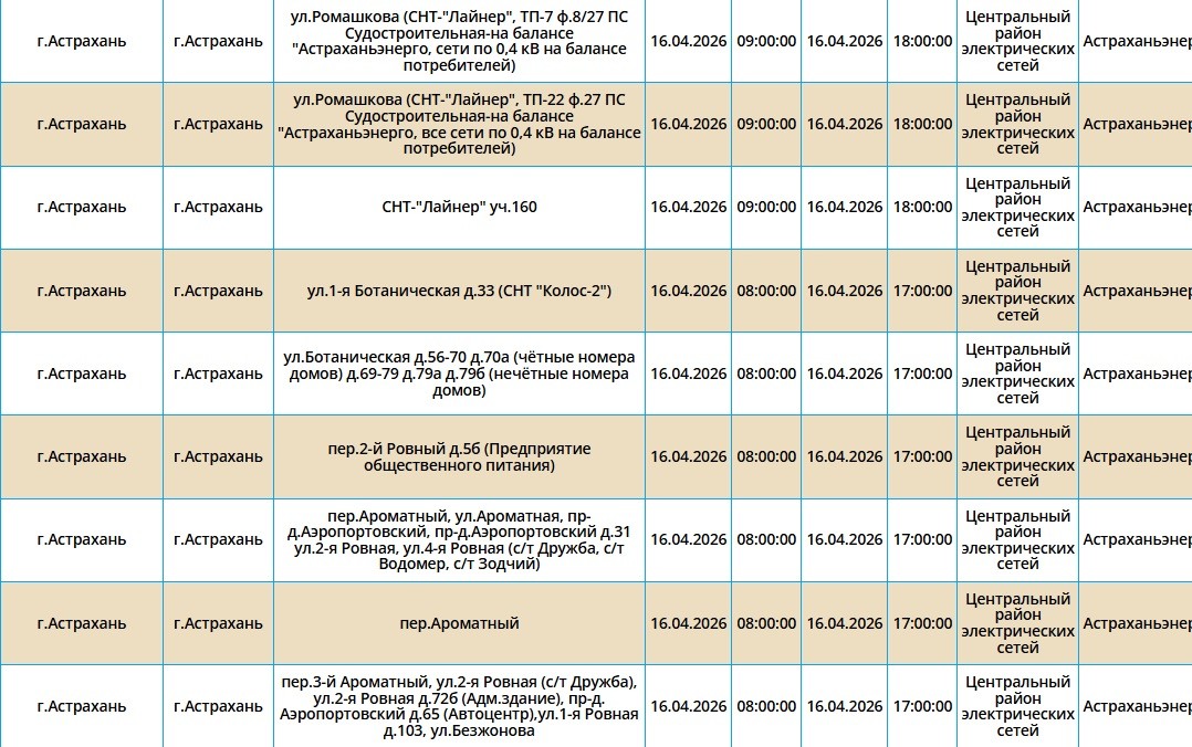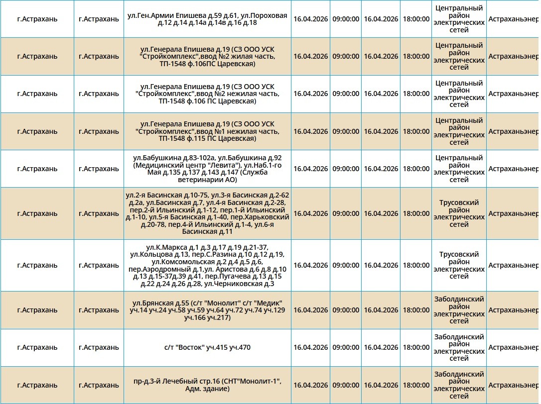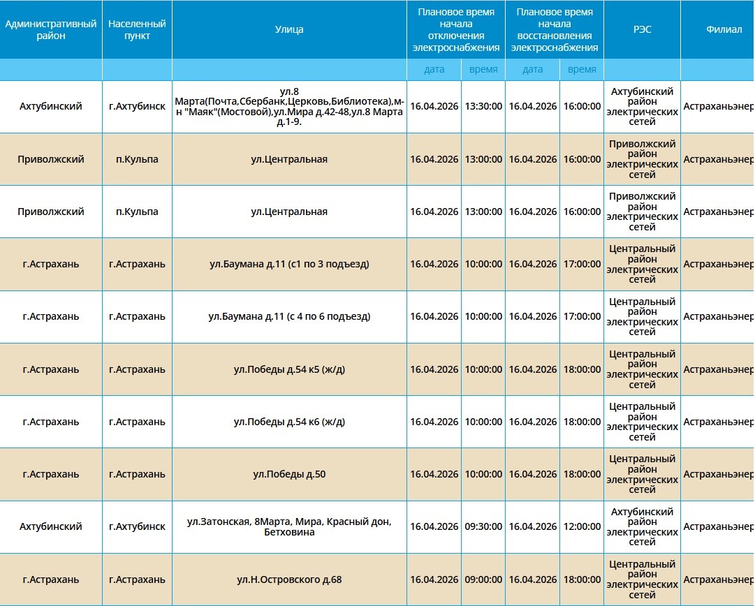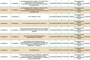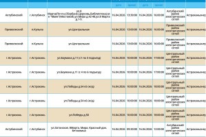 16 апреля энергетики запланировали очередные отключения электроэнергии. Мы рассказываем подробно о том, по каким адресам оно произойдет. Самые ранние отключения начнутся в 08:00. Без света останутся сотни жилых домов. В частности отключения затронут жителей областного центра, а также Ахтубинского и Приволжского районов. Подробнее с адресами можно ознакомиться в галерее ниже: Также напоминаем, что удобнее всего следить за актуальной информацией о перебоях с электричеством, водоснабжением и прочими бытовыми неудобствами на интерактивной карте города. А в случае, если отключения произошли незапланированно, обращайтесь по указанным ниже номерам телефонов: