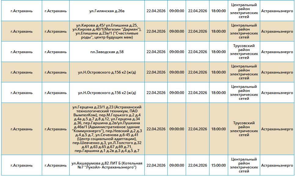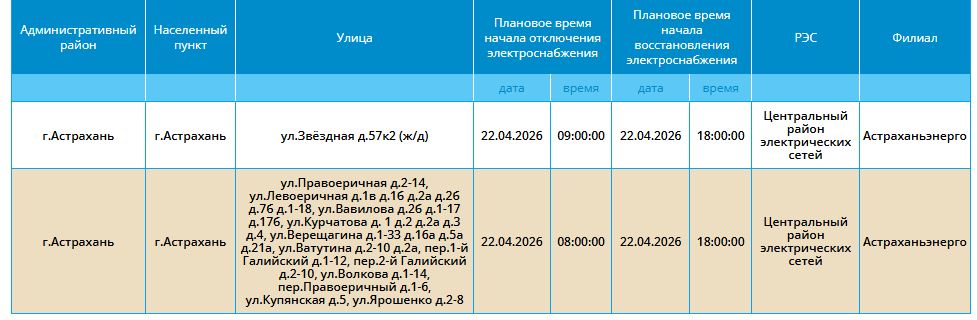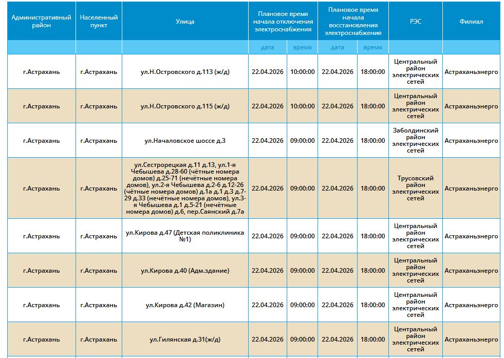 Завтра в Астраханской области пройдут массовые отключения электроэнергии. Без ресурса останутся жители областного центра, а также Ахтубинского и Приволжского районов. Прекращение подачи электричества необходимо для своевременного ремонта на сетях, сообщили сотрудники ПАО «Россети Юг». Самые ранние отключения начнутся уже в 09:00. Чтобы не оказаться без связи, астраханцам рекомендуют заранее зарядить все необходимые гаджеты. Адреса, где в Астрахани не будет света, представлены в галерее. А с полным списком адресов, где не будет электроэнергии, можно ознакомиться здесь: Напомним, что следить за отключениями в сфере ЖКХ можно на этом сайте. Там содержится актуальная информация о дорогах, проблемах с мусором, бродячих собаках и перебоях с водой. А если отключения произошли внепланово, обращайтесь по следующим номерам диспетчерских служб: