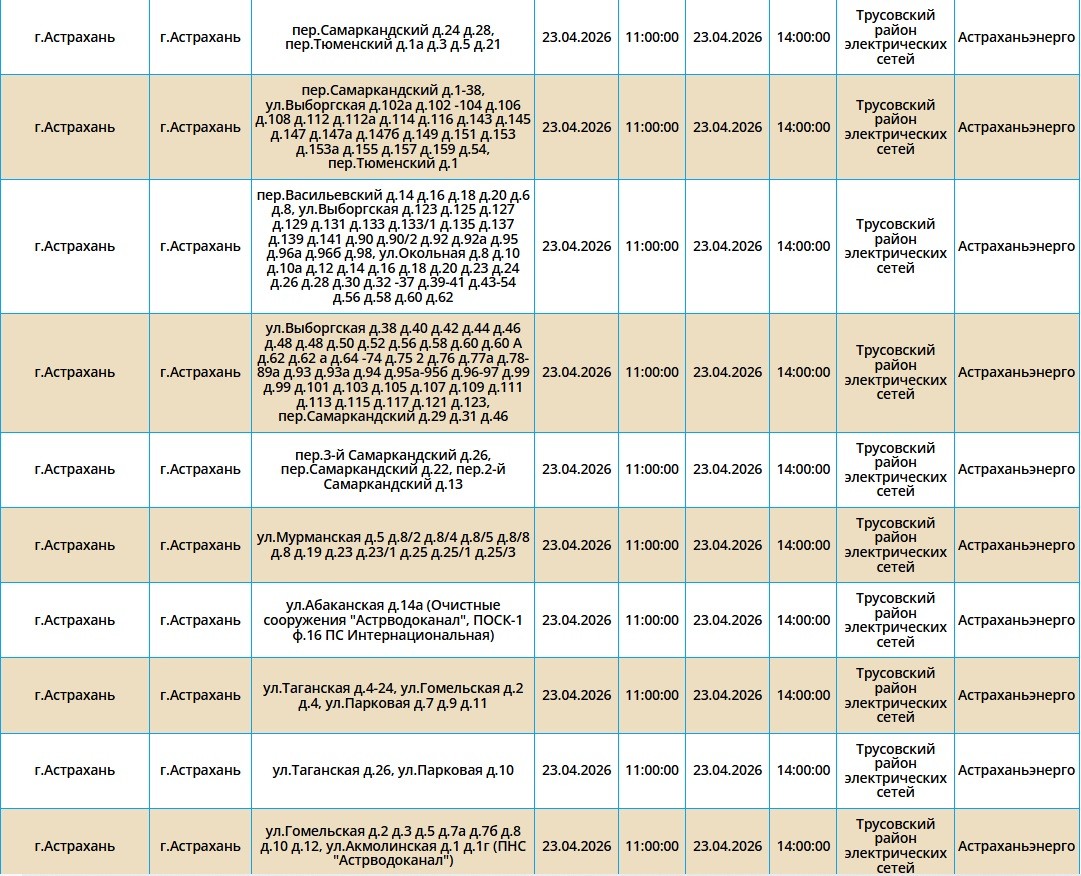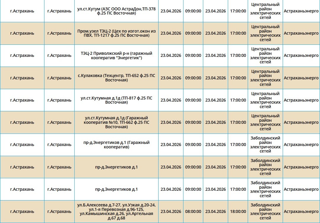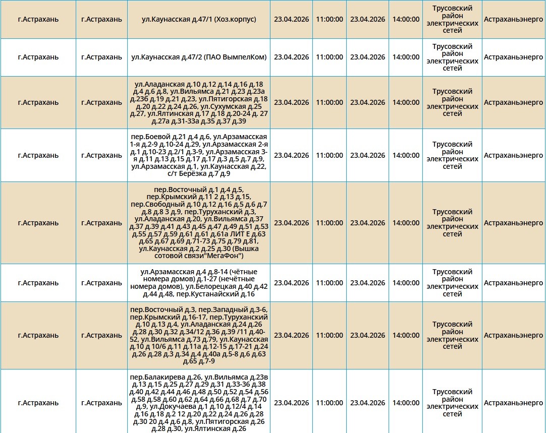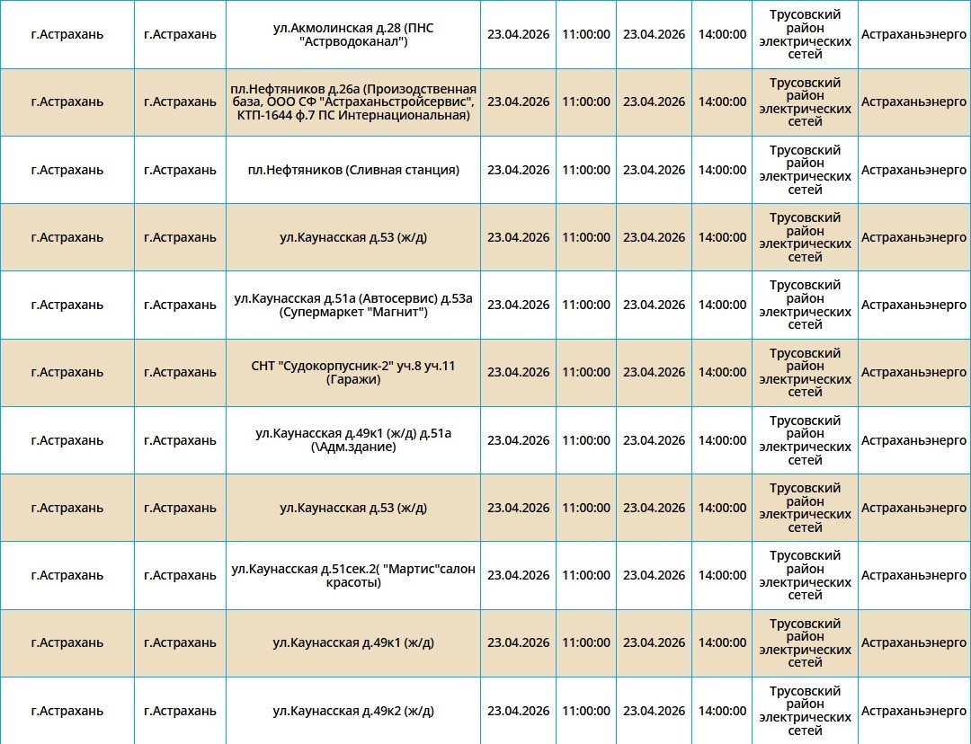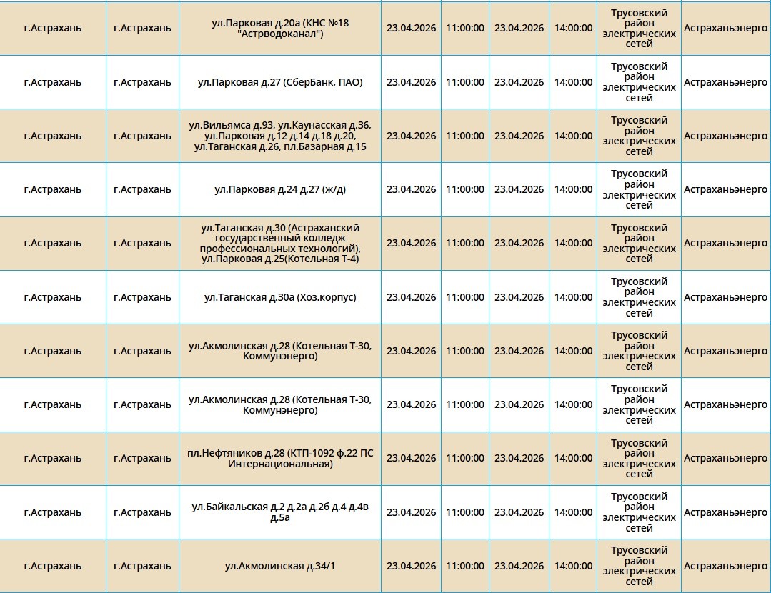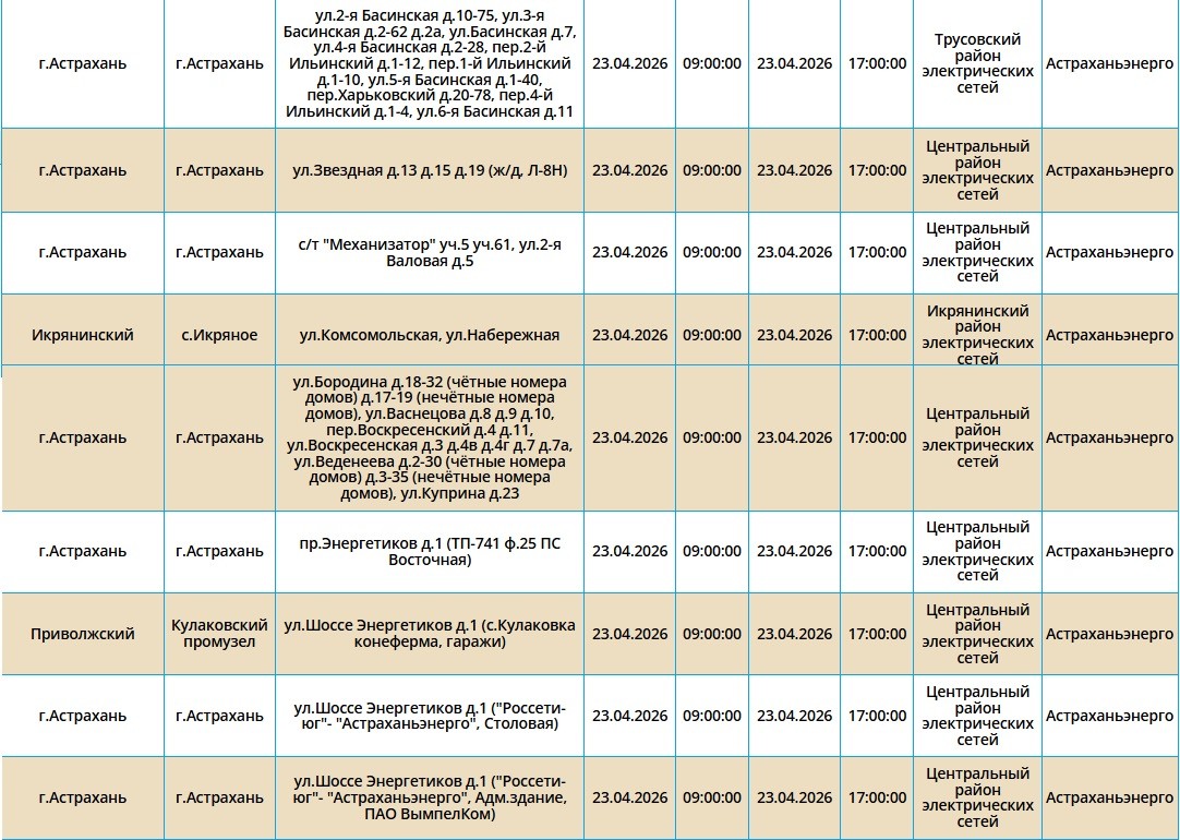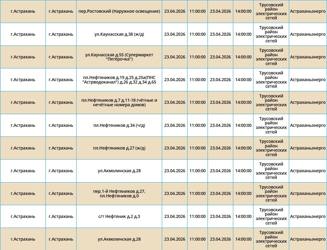 Второй день подряд в регионе пройдут массовые отключения света, из-за чего тысячи астраханцев на несколько часов останутся без бытового комфорта. Так, электроэнергии не будет как в самом городе Астрахань, так и в Приволжском и Икрянинском районах. Однако энергетики заверяют, такие отключения мера плановая и необходимая, чтобы обеспечить своевременный ремонт на электросетях. Поэтому не стоит переживать, а лучше подготовиться заранее - зарядить необходимые гаджеты и отключить приборы из сети, чтобы избежать неприятных последствий. Список адресов, где пройдут отключения на территории города Астрахань, можно посмотреть в галерее ниже, а полный перечень доступен по этой ссылке. Также напоминаем, что удобнее всего следить за актуальной информацией о перебоях с электричеством, водоснабжением и прочими бытовыми неудобствами на интерактивной карте города. А в случае, если отключения произошли незапланированно, обращайтесь по указанным ниже номерам телефонов: